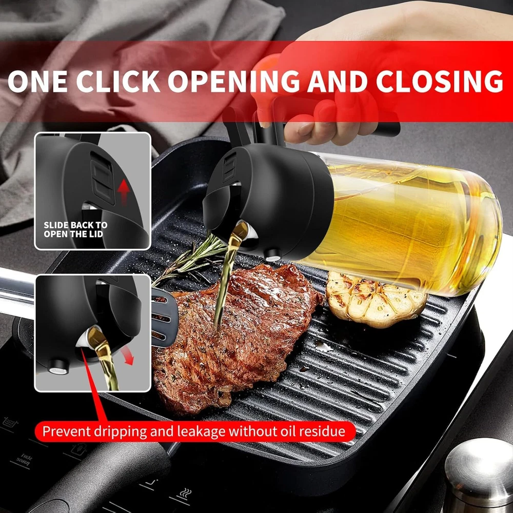 【 2 in 1 Oil Dispenser and Oil Sprayer】This is a spray bottle that can both spray oil and pour oil for cooking. It is suitable for various food preparation processes such as salad dressing, frying pan, grilling, barbecue, baking, etc., allowing you to easily switch between the two 【Oil Dispenser For Kitchen】The cooking oil dispenser is made of 470ml glass which is safe and odorless. Transparent glass can easily monitor the oil level, making it convenient to use. 【Oil Sprayer For Cooking 】Cooking spray bottle can help control the amount of oil when dumping or spraying. It can be cleaned by hand or dishwasher and reused. 【Olive Oil Sprayer】Olive Oil Sprayer is a unique nozzle that can pour or spray oil without dirtying hands. When pressed quickly, it can produce wide-angle fine mist, and when pressed slowly, it can provide stable oil flow 【Our Services】 Thank you for your trust in 2 in 1 Oil Dispenser and Oil Sprayer. Lifetime free technical support. If you are not satisfied for any reason please contact us for a replacement Product Description