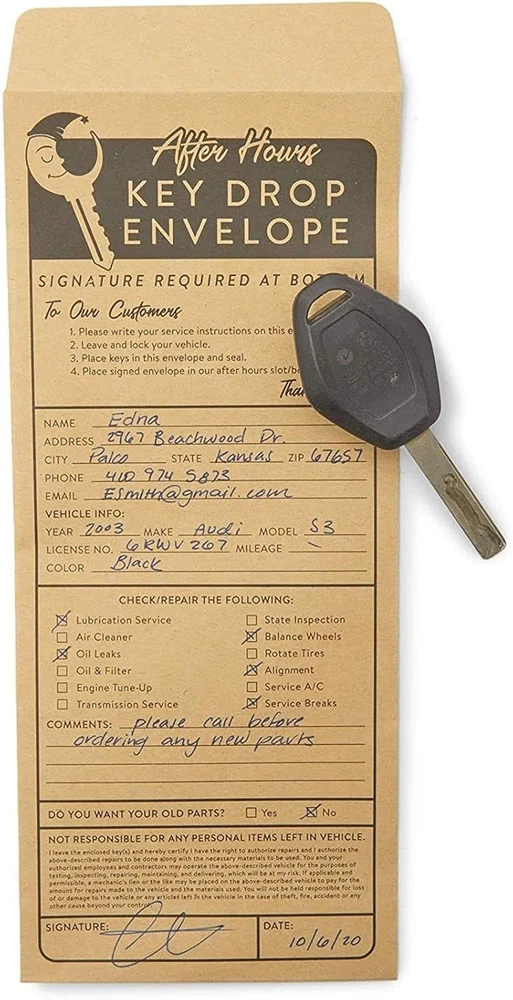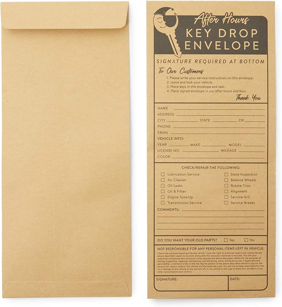 Store New Arrivals Add to Favorite View Feedback Okuna Outpost Key Drop Envelopes for after Hours Box, Car Mechanics (4.12 X 9.5 In, 200 Pack) Description Item model number LJ-ZJMGO-072320-01-1 Closure Self-Seal Number of Items 200 Closure Type Self-Seal Color beige Brand Okuna Outpost Material Cardboard Material Type Cardboard Manufacturer Part Number ZJMGO Item Weight 3.36 pounds Shape Rectangular Manufacturer Juvo Plus Product Dimensions 9.5 x 4.12 x 0.04 inches Size 9.5 inches Key Drop Envelopes: Use this set of after-hours overnight key envelopes to ensure your guests can safely and securely drop off their auto keys Auto Mechanic Supplies: These car key drop off envelopes feature convenient service prompts such as oil leak, alignment, and tune up boxes as well as client contact information fields High Quality: Each drop off box envelope is made of durable kraft paper with peel and stick adhesive closure Dimensions: Each car key envelope measures 4.12 x 9.5 inches, suitable for standard size keys What's Included: This auto mechanic key drop off set comes with 200 peel and seal key envelopes After Hour Key Drop Envelopes (4.12 x 9.5 In,200 Pack) Key Drop Envelopes: Use this set of after-hours overnight key envelopes to ensure your guests can safely and securely drop off their auto keys Auto Mechanic Supplies: These car key drop off envelopes feature convenient service prompts such as oil leak, alignment, and tune up boxes as well as client contact information fields High Quality: Each drop off box envelope is made of durable kraft paper with peel and stick adhesive closure Dimensions: Each car key envelope measures 4.12 x 9.5 inches, suitable for standard size keys What's Included: This auto mechanic key drop off set comes with 200 peel and seal key envelopes ASIN: B08DKGDNYM Use this set of after-hours overnight key envelopes to ensure your guests can safely and securely drop off their car keys. Ideal for mechanic shops, these key drop envelopes have a peel and stick adhesive closure for added security. Each key drop box automotive envelope features convenient service prompts as well as client contact information fields, keep your office organized and informed with these key drop service envelopes. You will receive 200 per pack. ABOUT US We offer the best prices around on high quality products. Our E-store includes media such as books, movies, music and games while offering electronics, toys, sporting apparel, clothing, tools, general home, garden items and more. SHIPPING We are always working hard to ensure your package arrives as soon as possible. Please understand that some factors like weather, high postal traffic, and the performance of shipping companies are outside of our control. We offer free shipping to the lower 48 states and ship within 2 business days of payment, usually sooner. We do not accept P.O. Boxes. Please provide a physical address. RETURNS We offer a 30-Day Return Policy on items which you are not completely satisfied with. You have the option for a full-refund or an exchange of the item. No returns are available on items shipped outside of the USA. PAYMENT We accept PayPal. CONTACT US This page content is yet to come Please ad us to your favorite seller and visit again later Thank You