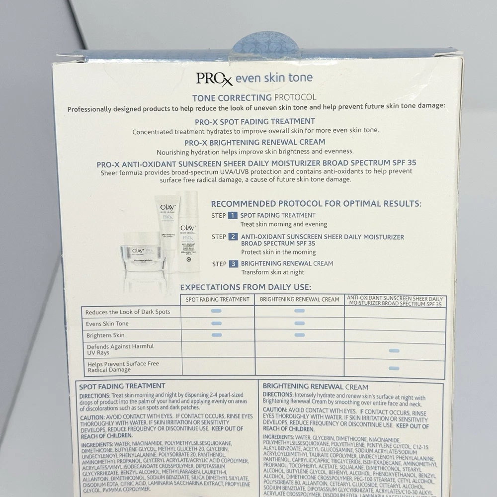 Olay Pro X Even Skin Tone Kit. Box is open, but items are unused. 3 items included in the set: Spot fading treatment .5oz Brightening renewal cream 1oz Sheer daily moisturizer with spf 1oz Discontinued products so the spf has a expiration date of 07/2015