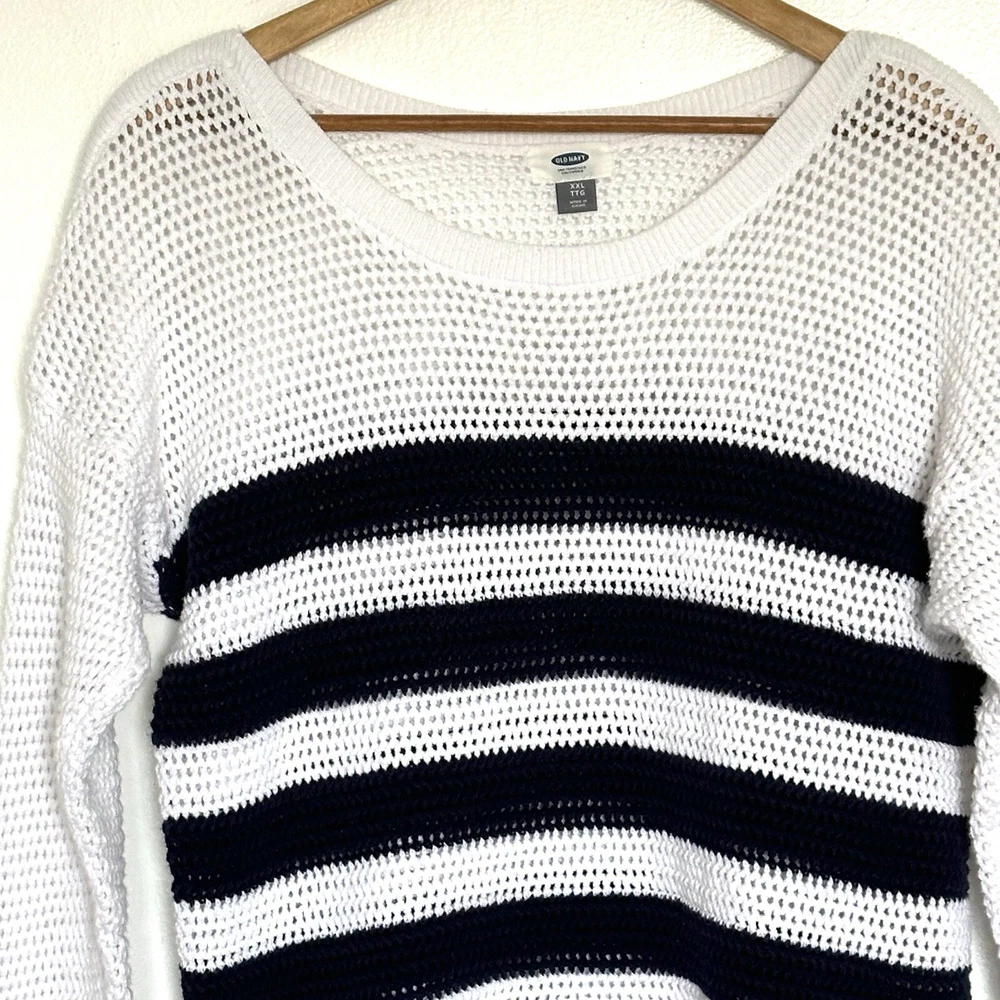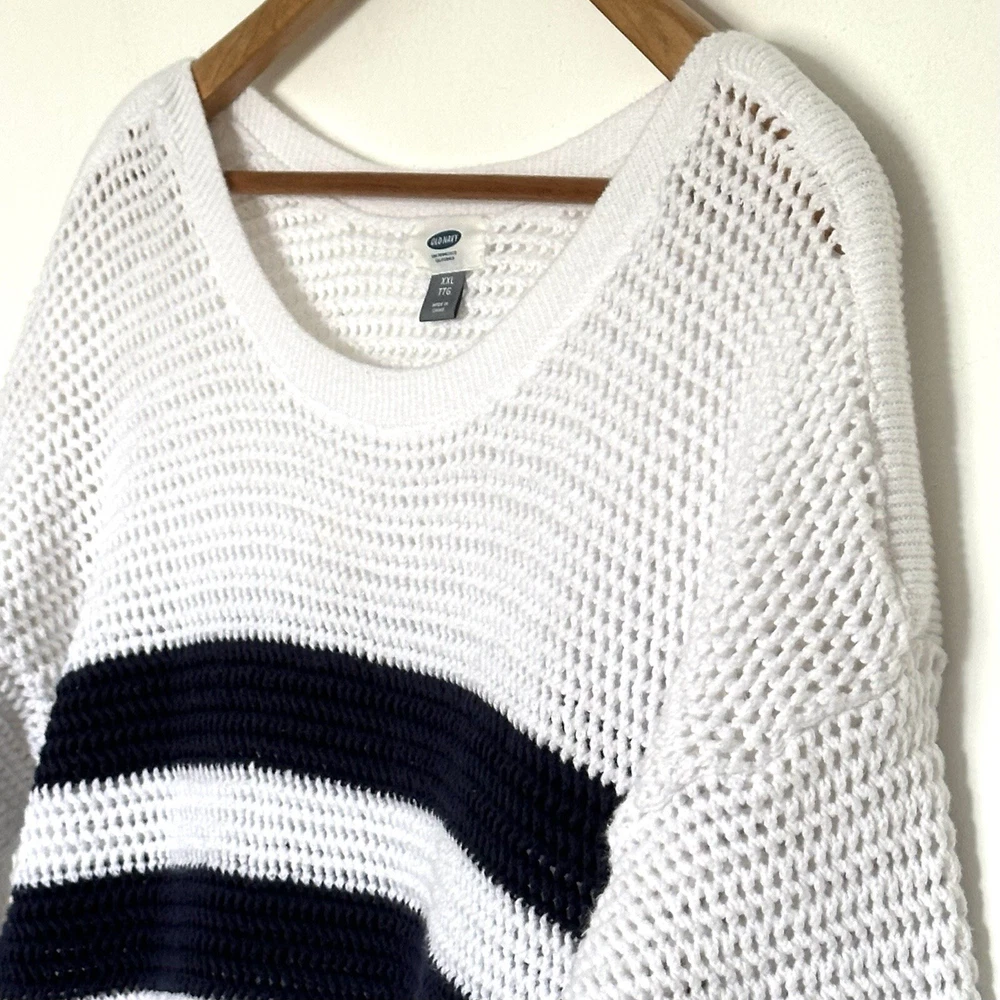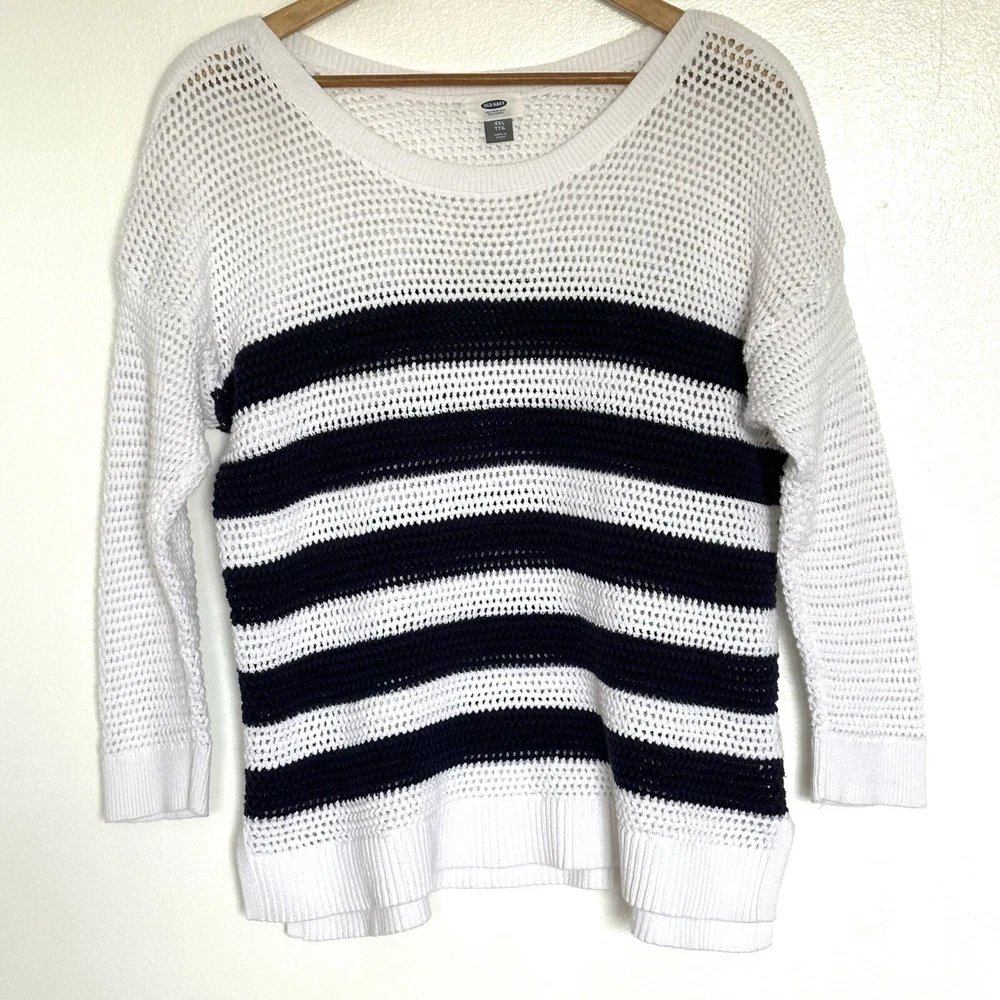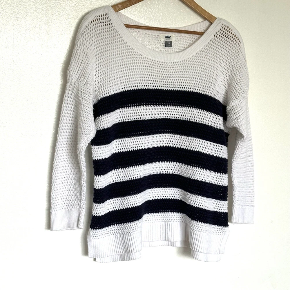 Old Navy Womens Sweater XXL Blue White Striped Cotton Open Cable Knit 3/4 Sleeve