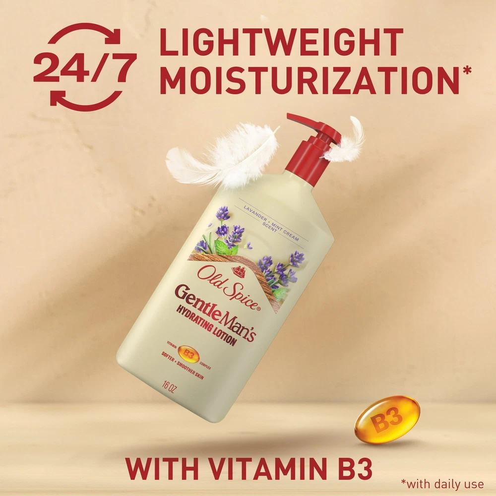 About this item Product details Gentleman's Blend Super Hydration Hand & Body Lotion with Vitamin B3 Complex is fast absorbing with no greasy residue. A lightweight feel formula with premium vitamin B3 skin improvement ingredient is made for all skin types, and with daily use, deeply moisturizes for 24 hours and helps break the cycle of dry skin. Use daily all over your body and along with Old Spice Gentleman's Blend Body Wash to amplify effects of Vitamin B3 Complex and moisturizing ingredients. 24/7 LIGHTWEIGHT MOISTURE: Deeply moisturizes for 24 hours with daily use WITH VITAMIN B3 COMPLEX: Super Hydration with Premium Vitamin B3 Skin Improvement Ingredient FAST ABSORBING: lightweight feel with no greasy residue HELPS BREAK THE CYCLE OF DRY SKIN: Moisturized dry skin in 1 use (when used daily) 2X LONGER LASTING SCENT when used with Old Spice Body Wash AMAZING SCENT OF OLD SPICE LAVENDER + MINT CREAM
