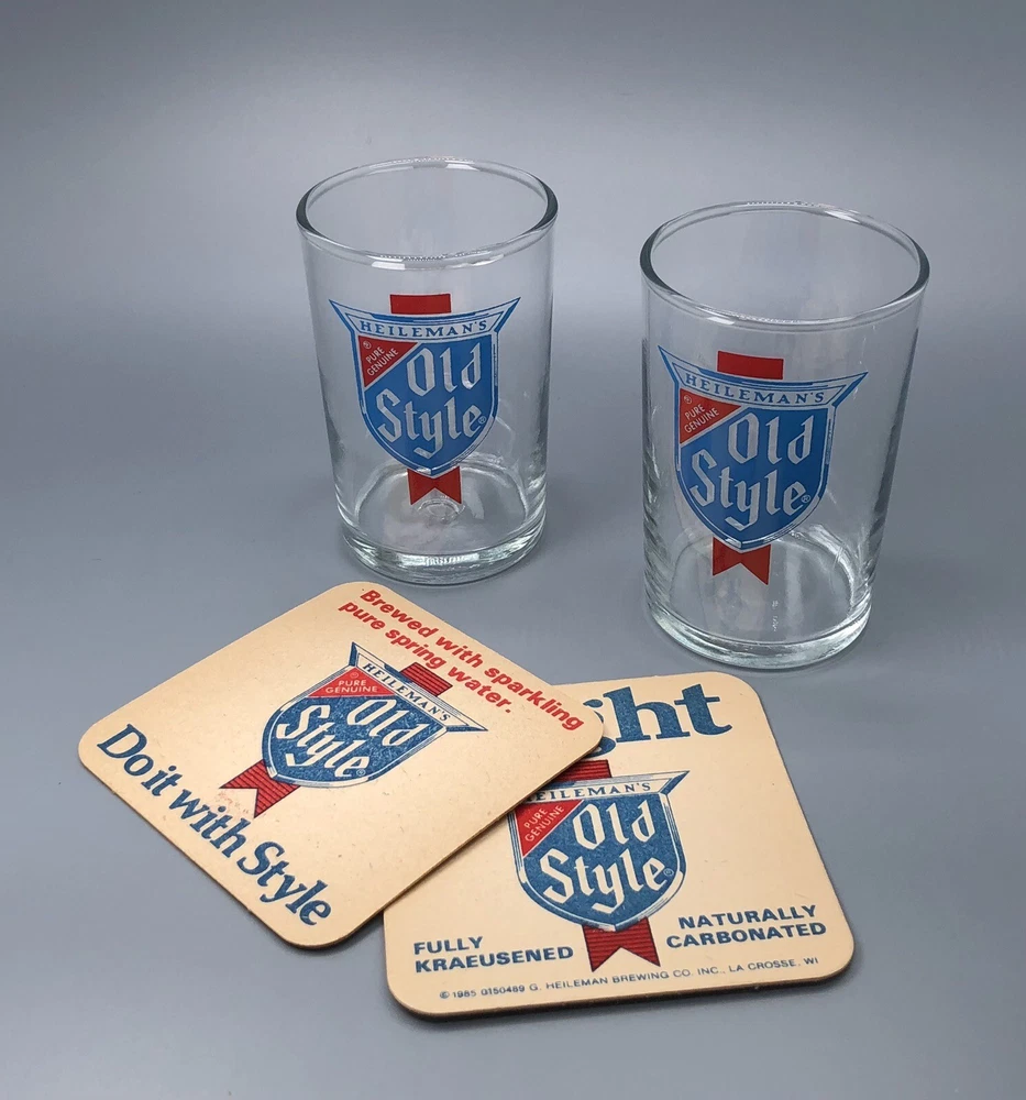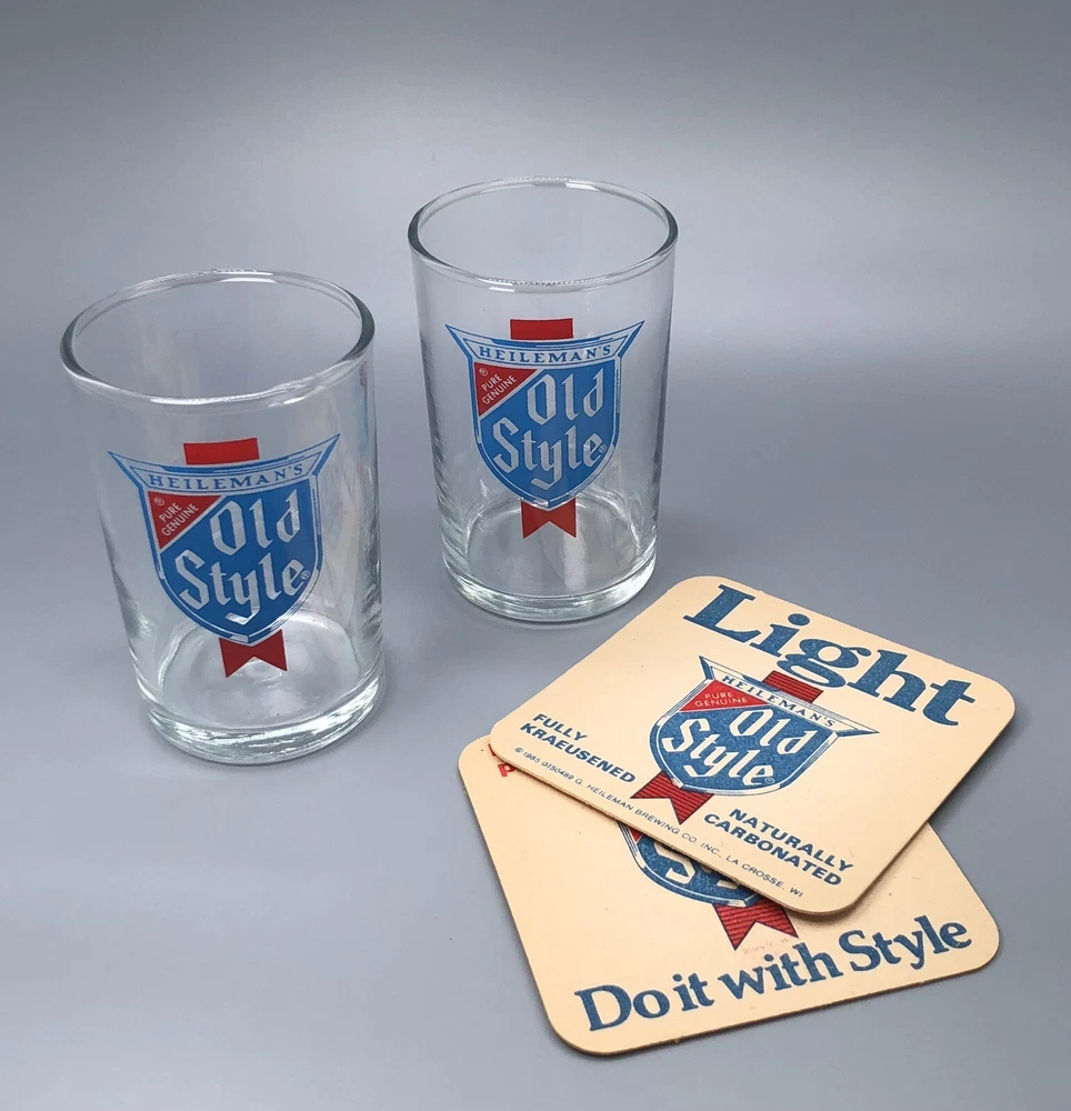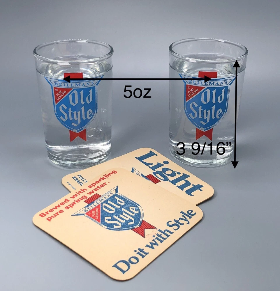 4 piece set of Old Style Lager Beer Collectibles. 2 NOS shell tumblers and 2 NOS coaster bar mats. Condition is "used" All glasses are inspected very closely and graded according to the scale at the bottom of this description page, please take the time to read and understand the scale. Any chips, cracks, or notable damage will be mentioned in the primary description below. Please contact me with any questions. 5oz, 3 9/16" tall NOS shell taster glasses and 2 NOS coasters from the same era. Please look closely at all photos for an accurate understanding of condition. The glasses came out of a box dated 1979 and the coasters have 1985 printed along the edge. This is the logo G Heileman was using when they were at their biggest, the 4th largest brewer in the US, not long before the company started to decline and was eventually sold to Stroh Brewing. These old beer advertising items are perfect for display or every day use. Grab this set today and enjoy your next man cave happy hour in style! I list vintage beer glasses every week. Please have a look through my other listings and check back in regularly! GRADING SCALE: PRISTINE = no identifiable wear marks of any sort, the glass is like new. NEAR-PERFECT = less than 5 minimal, very light wear marks identifiable only using a light source and looking very closely. EXCELLENT = up to 15 light wear marks around the glass, such as rub marks and micro-scratches, but no true scratches. Possibility of very minor chip/scratch in the label if there are no other wear marks on the glass. VERY GOOD = similar number of wear marks as excellent rating, just a little more noticeable. Possibility of a light scratch ring on the bottom surface. Possibility of a minor chip or scratch in the label, nothing obvious. GOOD = many light wear marks with the possibility of 1-2 minor scratches somewhere on the glass. Noticeable scratch ring on the bottom surface likely. Possibility of minor label damage. WELL USED = lots of wear and/or multiple obvious scratches. Heavy scratch ring on the bottom surface likely. Significantly faded or damaged label possible. DAMAGED = cracked, chipped, or very heavily worn glass. Thanks for looking and happy shopping!