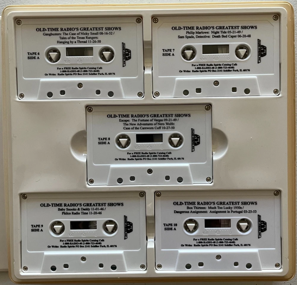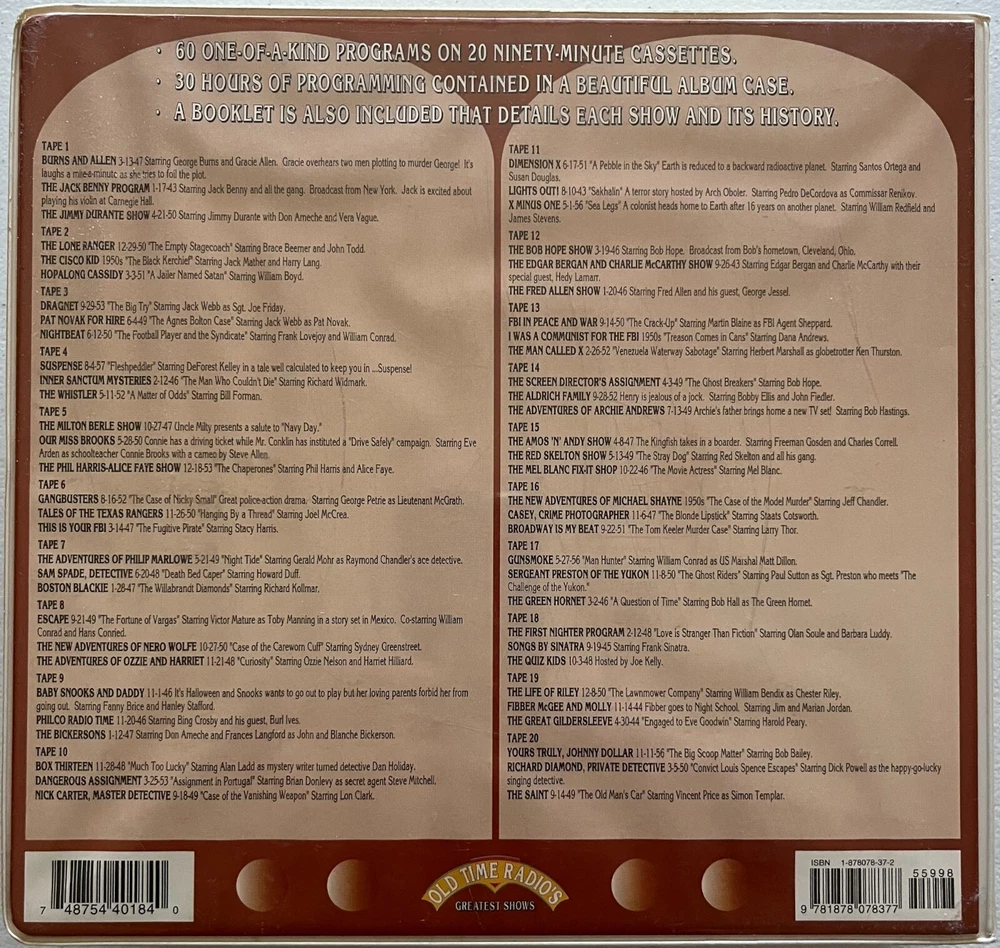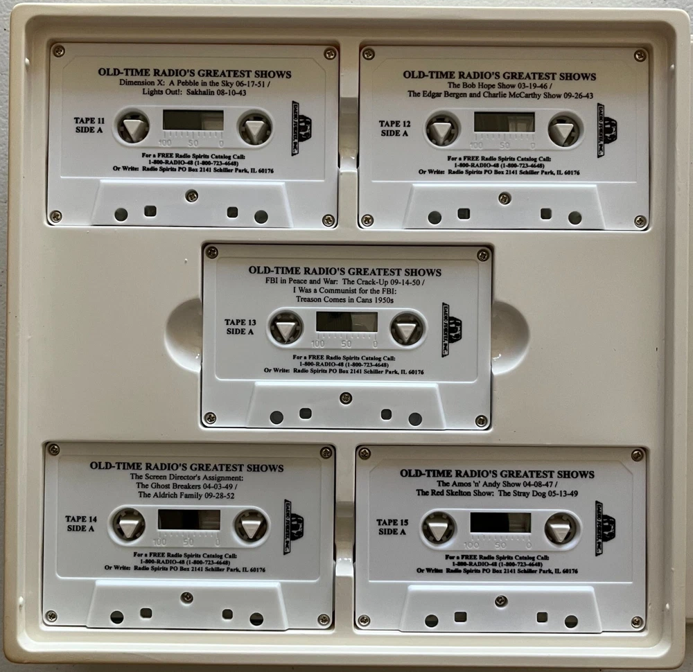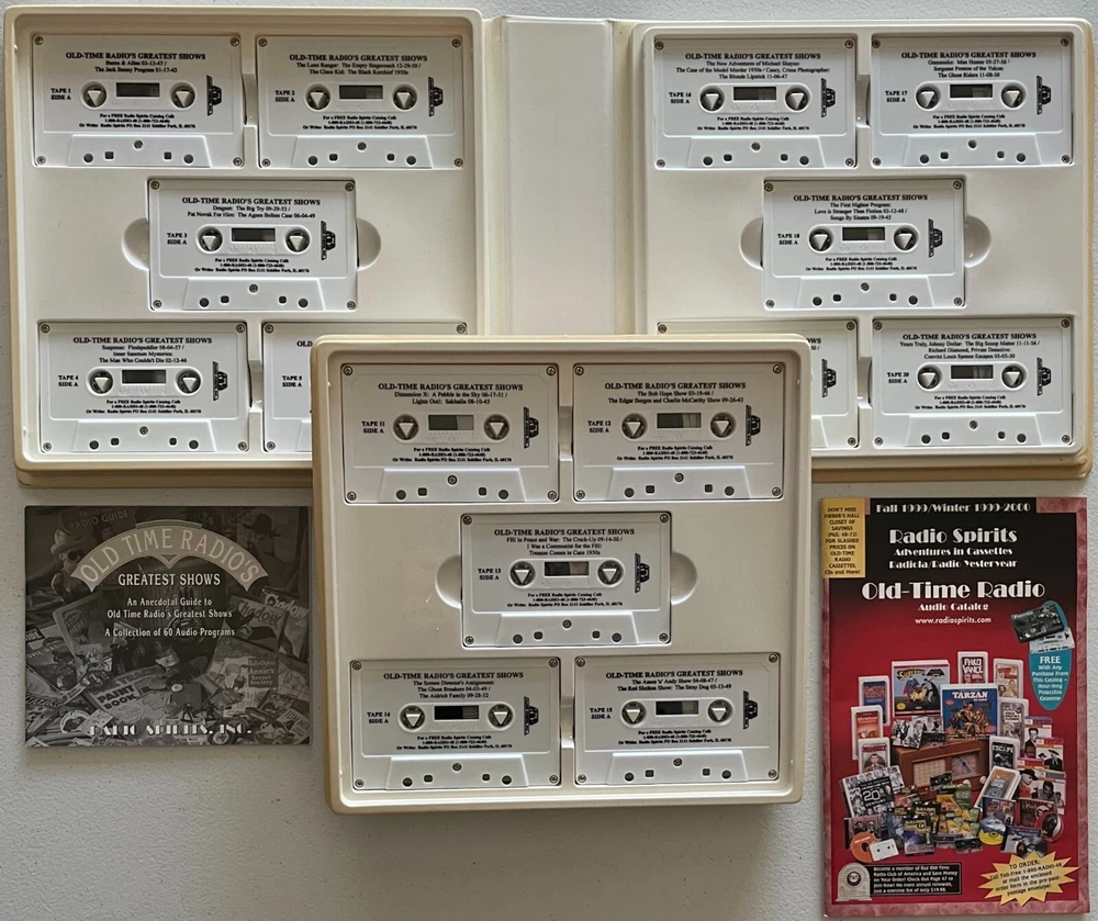 Radio Spirits has specialized in capturing the magic that was old time radio for decades. This collection perfectly exemplifies what makes their work so valuable! Return to the thrilling days of yesteryear with this amazing collection of radio programs from the 1940s and 1950s! Available with this listing is the Radio Spirits “Old Time Radio’s Greatest Shows” collection. It features episodes from 60 radio programs on 30 90-minute cassettes, amounting to a whopping 20 hours of classic, nostalgic entertainment from the golden era of radio! Any person of a certain age (ahem) will likely remember many of these shows and would appreciate the collection as a remembrance of those bygone days! We purchased this item for our parents as a Christmas gift in 1999 to accompany a reproduction period Crosley radio (we know that the originals didn’t have cassette players built in). While they enjoyed the radio, once the plastic wrap came off of this item it just sat on a bookshelf in first their home and then our mothers after our father passed. The cassettes, sadly, were never played and have been closed up in the plastic case for the last 25 years. Also included are a booklet with detailed information about each radio program as well as the 1999-2000 Radio Spirits catalog. PLEASE NOTE : Despite the fact that this item has been in a non-smoking home for its entire life, the outside of the plastic case has discolored somewhat to a very light brown, perhaps just from exposure to the air and possibly to sunlight. Inside, though, the plastic case as well as the cassettes are pristine white and look brand new. It is due to this discoloration that we are selling this item as VERY GOOD and are pricing it accordingly. Photos included with this listing are of the actual item, not stock. Please remember color can vary a bit due to lighting. Take advantage of this unique opportunity to pick up this awesome item that will make a great gift for someone special or keep it for yourself! This item will be shipped via USPS Ground Advantage. * * * From the Amazon Website * * * “This value packed collector package features 60 programs from 60 different series. Enjoy the most popular radio stars including “Burns & Allen” , “Jack Benny” , “The Lone Ranger” , “The Green Hornet” , and many, many more. An anecdotal guide is included to give you a more in-depth look at each show included in the package. This collection makes a wonderful gift.” * * * * * CONDITION: Each item offered is in pristine-to-mint condition, meaning there are no obvious defects to the item itself and there are no holes or tears to the packaging, where applicable. All items are 100% guaranteed authentic. RETURNS: In the unlikely occurrence a return is requested, returns will be accepted within 30 days of the item being received according to eBay Policy, so long as the item is unopened, in its original condition for resale, and includes ALL original packaging materials. PLEASE NOTE: The Buyer is solely responsible for all fees and shipping costs associated with the return of any items. SHIPPING: Shipping costs included in the purchase price will be via United States Postal Service, are for domestic shipping within the United States ONLY, and include tracking. A packing slip will be included. Additional services may be available for your shipment, so please contact us before making payment with any special requests in that regard. All possible care is taken in handling and packaging to ensure items arrive in the condition stated above. Each item is securely packaged to avoid any possible damage while in transit. If you have any questions or concerns, please feel free to contact us using the Secure eBay Message System. * * * * * THANKS FOR LOOKING!