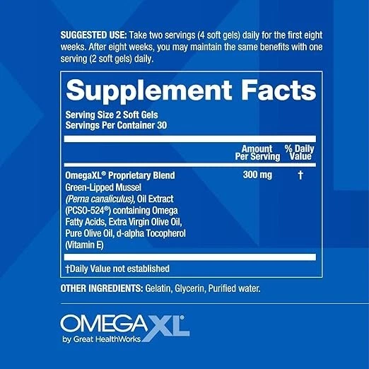 Product Description Omega Xl 60 Count Omega 3 Natural Joint Pain Relief Supplement About this item XL BENEFITS BEYOND OMEGA-3s - The ultimate joint health and mobility support supplement. OmegaXL goes beyond standard omega-3 supplements that mainly contain just EPA and DHA. It is a concentrated source of green-lipped mussel oil packed with a powerful combination of healthy fatty acids and lipid mediators. Backed by over 40 years of clinical research, this high-potency blend promotes joint, muscle, immune and respiratory health. MUSSELS FOR YOUR JOINTS - Our one-of-a-kind proprietary formula helps to relieve occasional exercise-related joint and muscle soreness by providing omega-3 fatty acids in a more absorbable free fatty acid form than standard fish oils. Don’t let minor aches hold you back from living a healthy active life. OmegaXL is a drug-free, natural dietary supplement that when taken daily, has been shown to promote joint health and improved mobility. MORE THAN A FISH OIL - OmegaXL contains the oil extract from green-lipped mussels, not fish. The green-lipped mussels are exclusively sourced from and sustainably farmed in the pristine water of New Zealand. The oil extract contains over 30 free fatty acids, including EPA and DHA. GET THE BENEFITS, WITHOUT THE FISHY AFTERTASTE - OmegaXL is provided in a convenient, small and easy-to-swallow soft gel with no fishy aftertaste or burps. This product is free of gluten, allergenic levels of shellfish protein, artificial ingredients, milk, yeast, and corn. COMMITTED TO WELLNESS - Founded in 2003 Great HealthWorks is dedicated to delivering quality health and wellness products to our consumers. Our mission is to make meaningful differences in people's lives by offering natural, science-based solutions.