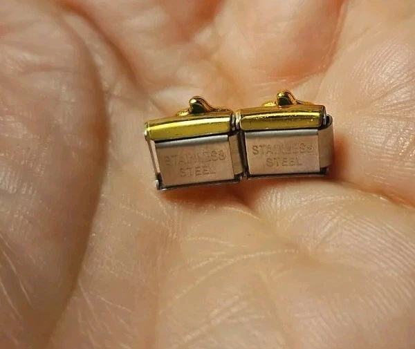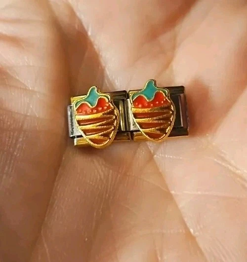 Gold Chocolate covered strawberry Italian link charm. Gold trim silver color link. 9mm stainless steel I have many others to choose from! Combine for shipping savings or choose from all my charms and let me know what you like and I can make a custom bundle for you! Thanks for stopping in!