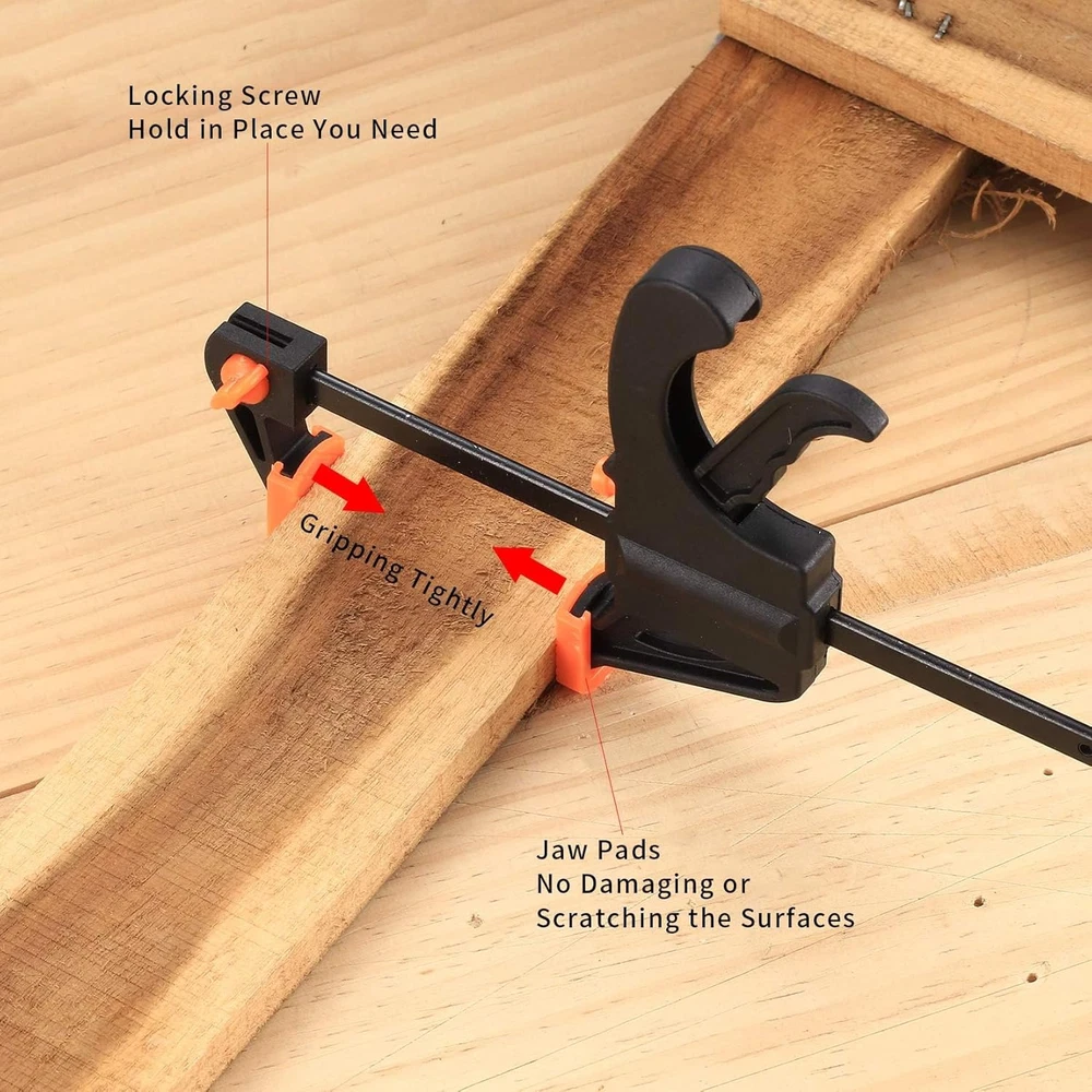 Superb Material: The durable material provides a construction that won’t buckle or bend under pressure and repeated use, which are durable for long time use, provide effective function when you use it. The woodworking clamps are made of high-quality material, which is heat-treated, robust hardened iron construction that can prevent bar bending. Ergonomic Handle: The flexible and sturdy structural design of our woodwork quick grip clamps to make woodwork easier and more convenient. The quick clamp ratchet bar clamps are with soft jaw pads, gripping tightly without damaging or scratching the surfaces. The quick grip clamps are the most reliable solution for securely clamping small projects and objects. Quick Release Feature: Soft jaw pads of the c clamps for woodworking can make you grip tightly without damaging or scratching the surfaces. The trigger design provides a simple, one-handed operation, a slide arm, and holds the wood in place, which can converts to a spreader also. The sturdy, resilient construction of the woodworking clips holds sheet material and workpieces together during smaller-scale projects. Easy to Use: The craft clamps for woodworking quick-release heavy-duty clamps are easy to use. Simple trigger action with the quick-release button for instant pressure relief, which is easy to handle and convenient to use. You just need to press the slide button to free the jaw and then squeeze the trigger to reach the distance you actually need. The wood clamps' quick-grip is convenient to use. This design of the corner clamps for woodwork for easily moving items. Package Includes: This package includes 5 pcs 4 inches carpentry hand clamps, which is enough for your daily use. Widely used in the furniture manufacturing and packaging industry. Suitable for spread, clamp parts for welding, gluing, or woodwork projects. The woodwork bench clamp set is a good tool for quick woodworking, manual work, DIY handmade craft, and more. 4 Inch Bar Clamps Quick Grip for Woodworking Features - The bar clamps for woodworking are made of high-quality iron, and nylon, which is durable and sturdy for long time use. - Trigger design of the clamps for woodworking provides simple, one-handed operation, slide arm, and hold the wood in place. - The wood clamps are equipped with an ergonomic handle, which has a smooth thick rim with no burrs, and grip on comfortably. - The wood clamps for woodworking can quickly and accurately fix the parts, which is easy to use. - The woodworking clamps are widely used in the furniture manufacturing and packaging industry. Product Information - Material: Iron+Nylon - Color: Black + Orange - Size: As Pictures Shown - Clamping Length: 100mm/4 inch Using Tips: - Press the quick-release button to free the jaw, then squeeze the trigger to apply pressure. - Once set, the jaw is locked and will not shift. - When the job is finished, simply press the quick-release button to let go of the workpiece. Pack Include: 5 * Woodworking One Handed Ratchet Clamp Friendly Reminder: - There may be some deviation because of manual measurement, please prevail in kind. - Due to lighting effects, monitor's brightness, and contrast settings, there could be some slight differences in the color tone between the pictures and the actual quick release clamps.