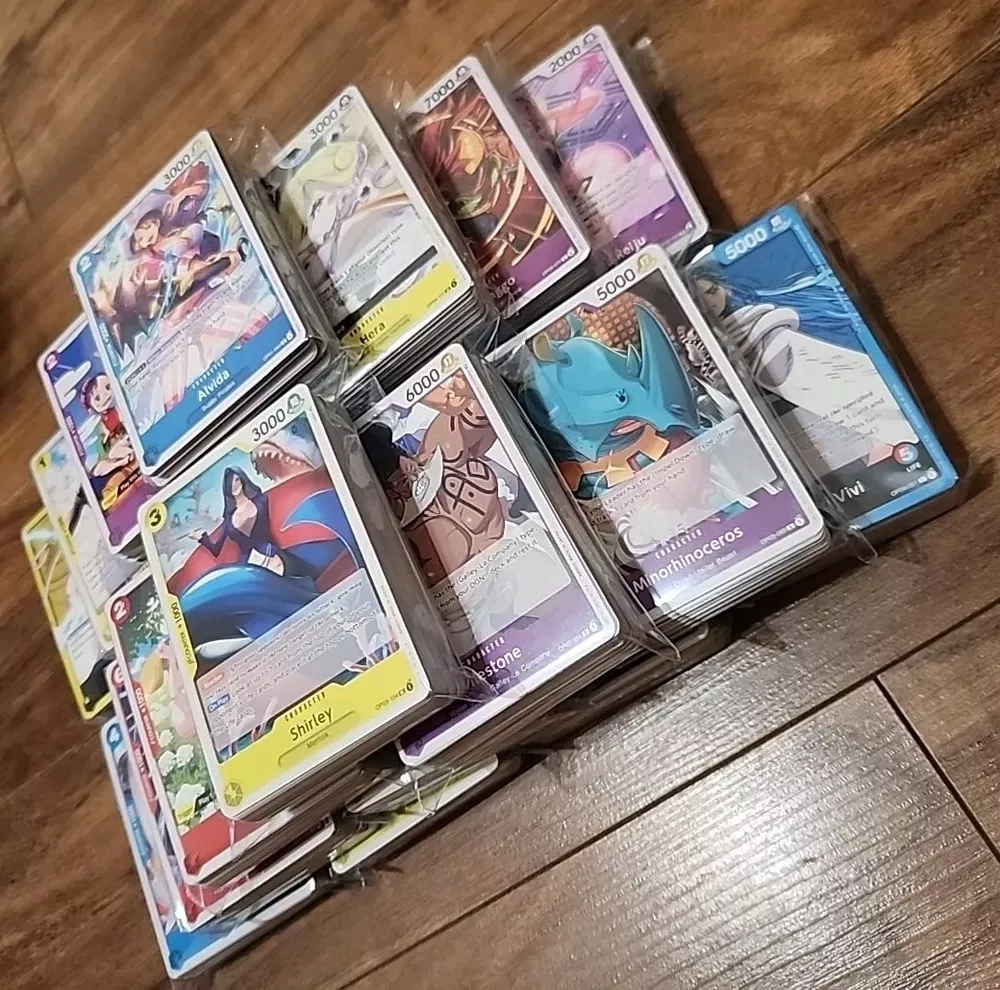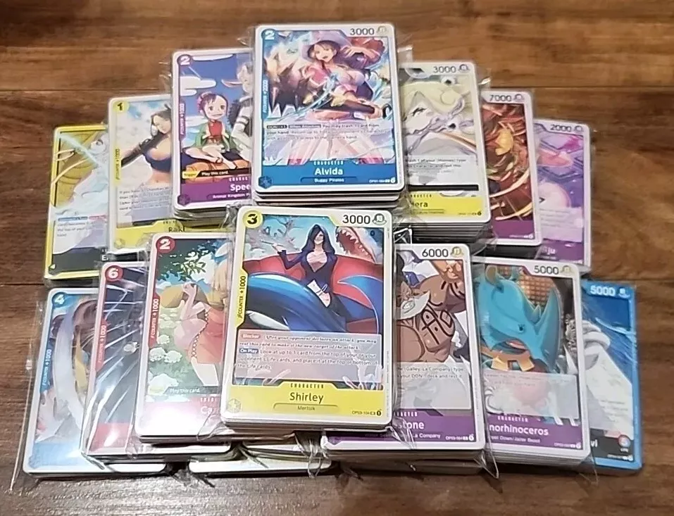 This bulk lot of One Piece trading cards includes 1000 cards featuring characters like Luffy and Dodoco. The cards are made of plush material and were manufactured in Japan in 2021. They are perfect for collectors of animation merchandise and fans of the One Piece TV show. The lot includes cards from the OP01-OP06 series and is near mint quality. The language of the cards is English and they are ideal for those who enjoy collecting and trading card games.