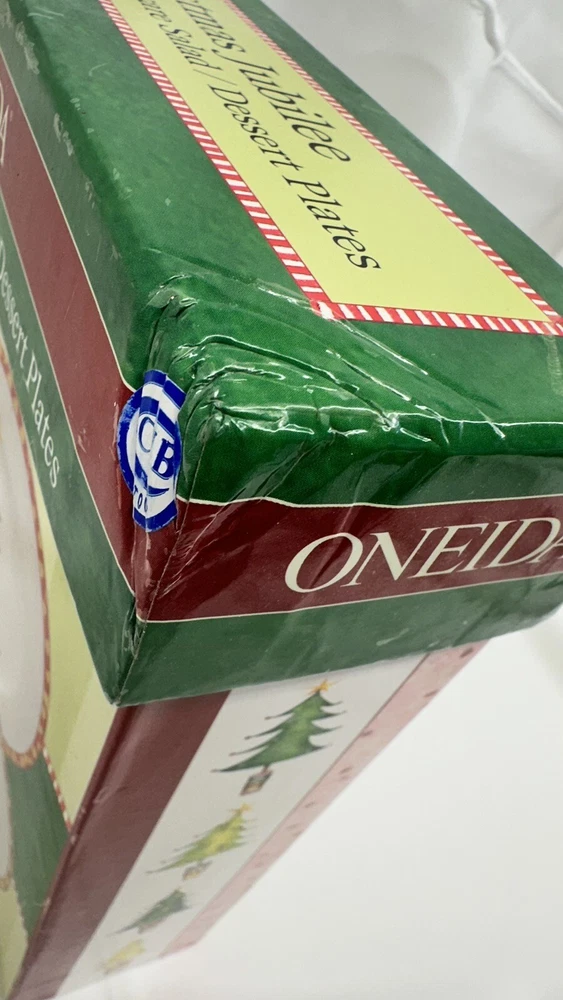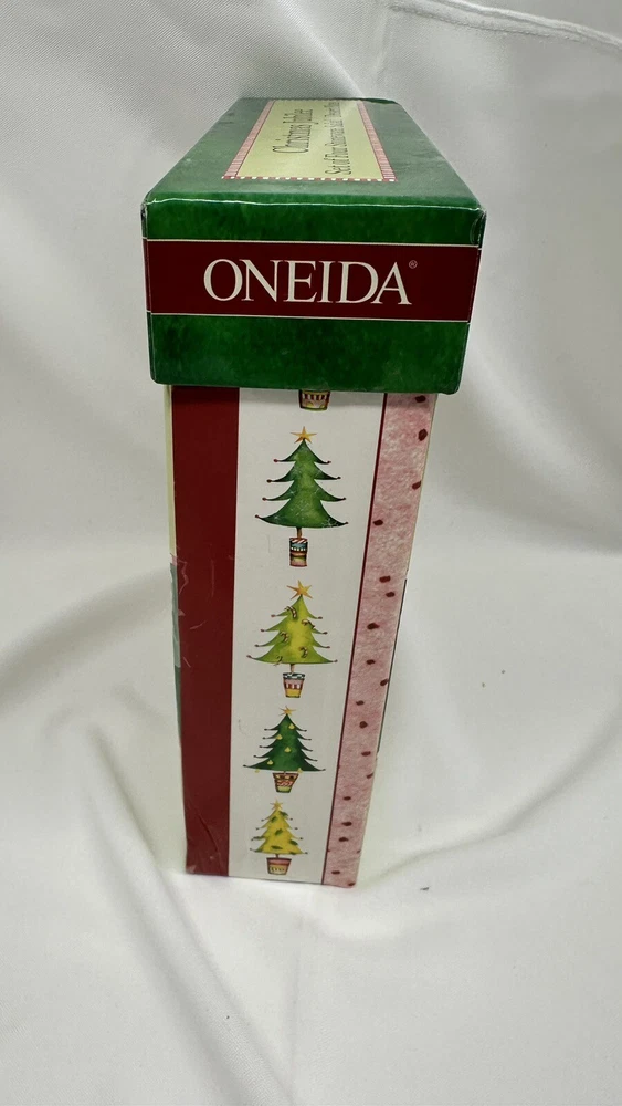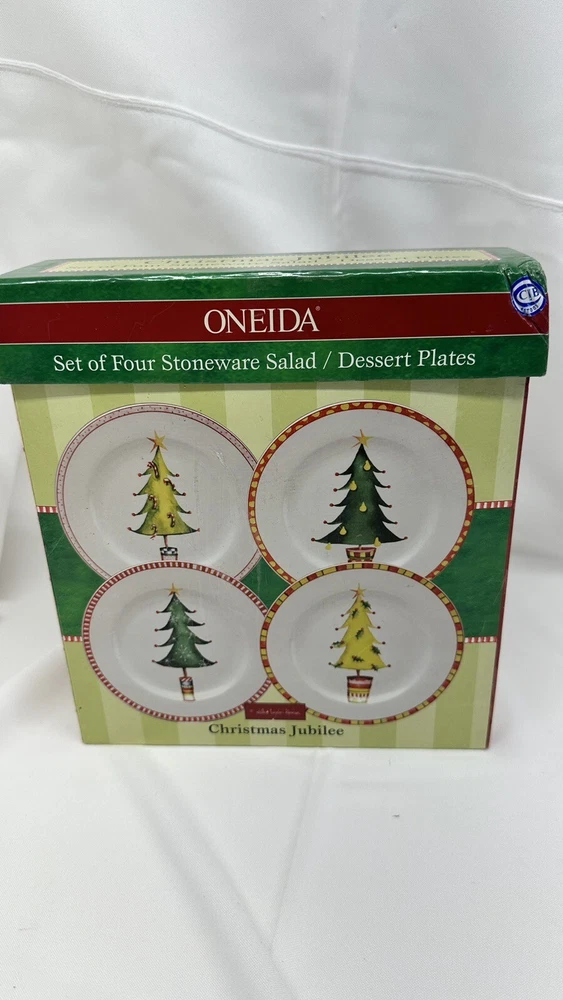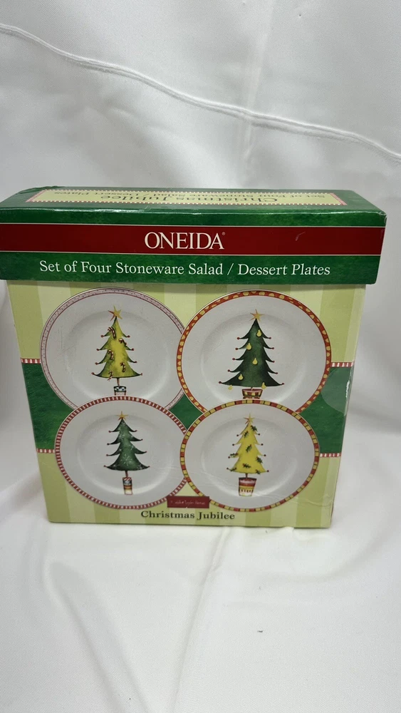 Add some festive flair to your dinner table with this set of four Oneida Christmas Jubilee Stoneware Salad/Dessert Plates. Each plate has a diameter of 8 inches and features a charming Christmas tree pattern in vibrant multicolor. Perfect for your holiday celebration, these plates are made of durable stoneware and can withstand daily use. These contemporary original plates are not only functional but also decorative. They are suitable for any Christmas occasion, and their art pottery production style adds to their uniqueness. Get ready to impress your guests with these ONEIDA plates without worrying about their quality, as they are brand new.