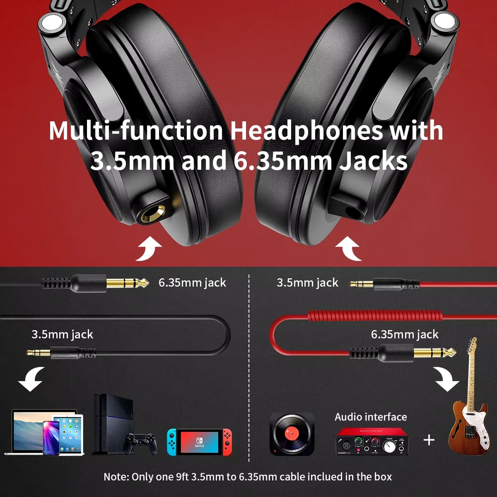 Product Description SUPERIOR SOUND QUALITYSUPERIOR SOUND QUALITY Enjoy superb, balanced sound and supreme comfort with the OneOdio Studio monitor headphones. Large, 40 millimeter speaker unit drivers combined with neodymium magnets provides stereo Hi-Fi and Hi-Res level sound; powerful bass, clear vocal, and crisp high tones form perfect balanced sound. BUILT TO STAY COMFORTABLE The high quality padded ear cushions are specifically designed for monitor headphones maximum comfort and noise isolation. The headband is adjustable and stretchable for you to find the desired angle you like to fit in. NO MORE ADAPTER A long, DJ-style 9.8-foot cord easily reaches from the TV or stereo to your favorite chair. A standard-sized 6.3mm plug and a 3.5mm plug are included. They both are completely detachable, so that you don't need to spend all hours of the day plugged into your mixer. SINGLE-SIDE MONITORING 90 degree swiveling earcups for single-ear monitoring anytime; self-adjustable and flexible headband delivers a fatigue-free listening experience that can last for hours, perfect for mastering and mixing. WORKS WITH For iPhone iPad iPod, Android and many other audio devices. High-quality sound, supreme durability, and maximum comfort. These are the headphones you've been looking for. Specifications Speaker: 40 mm Impedance: 32 Sensitivity: 110dB+/-3dB Frequency Response: 20Hz-20KHz Plug Type: 3.5mm/6.3mm Cable1: 1.5m-2.8m Spring Cable Cable2: 1.2m Cable With Micrphone class="extend--iframe--to7hHIV" data-spm-anchor-id="a2g0o.detail.0.i4.6f8aiyeOiyeOOa" data-spm-act-id="a2g0o.detail.0.i4.6f8aiyeOiyeOOa" style="box-sizing: border-box; -webkit-tap-highlight-color: transparent; outline: 0px; margin: 0px; padding: 0px; height: 13714.7px; position: absolute; top: 0px; visibility: hidden; width: 1000.5px; z-index: -1;">