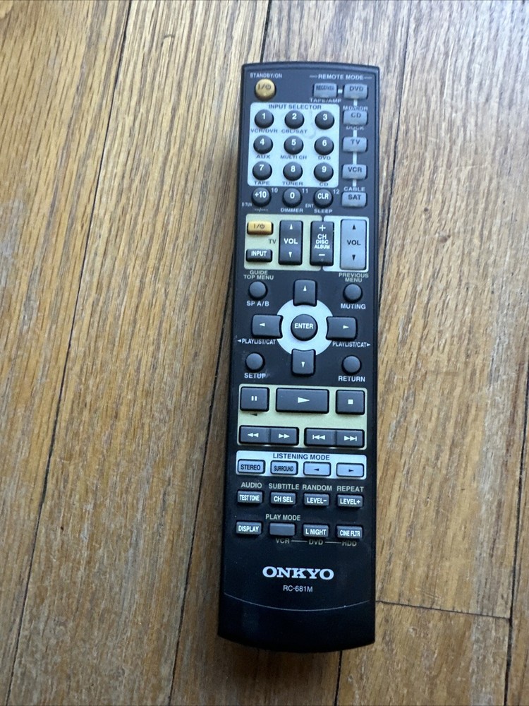 The RC-681M Remote Control is designed for Onkyo AV receivers such as TX-SR575 and TX-SR505, featuring a wireless range of 5-10 meters for convenient operation. It is a black, unbranded remote control with compatibility for Onkyo brand devices. This remote control model offers wireless connectivity and comes without included batteries, ensuring it is ready to use with your Onkyo AV receiver. Made in the United States, it also includes a manufacturer's warranty of 6 months for added peace of mind.