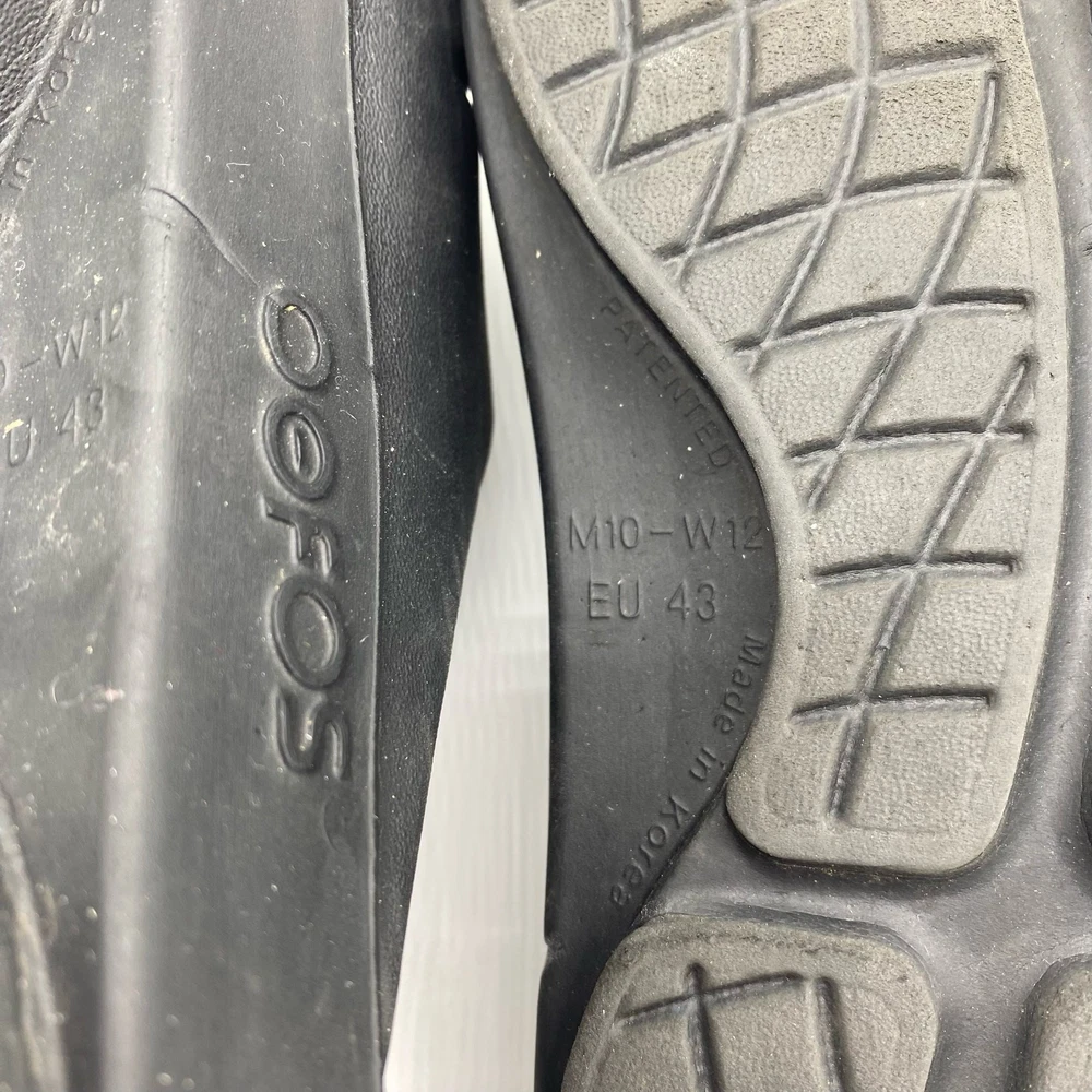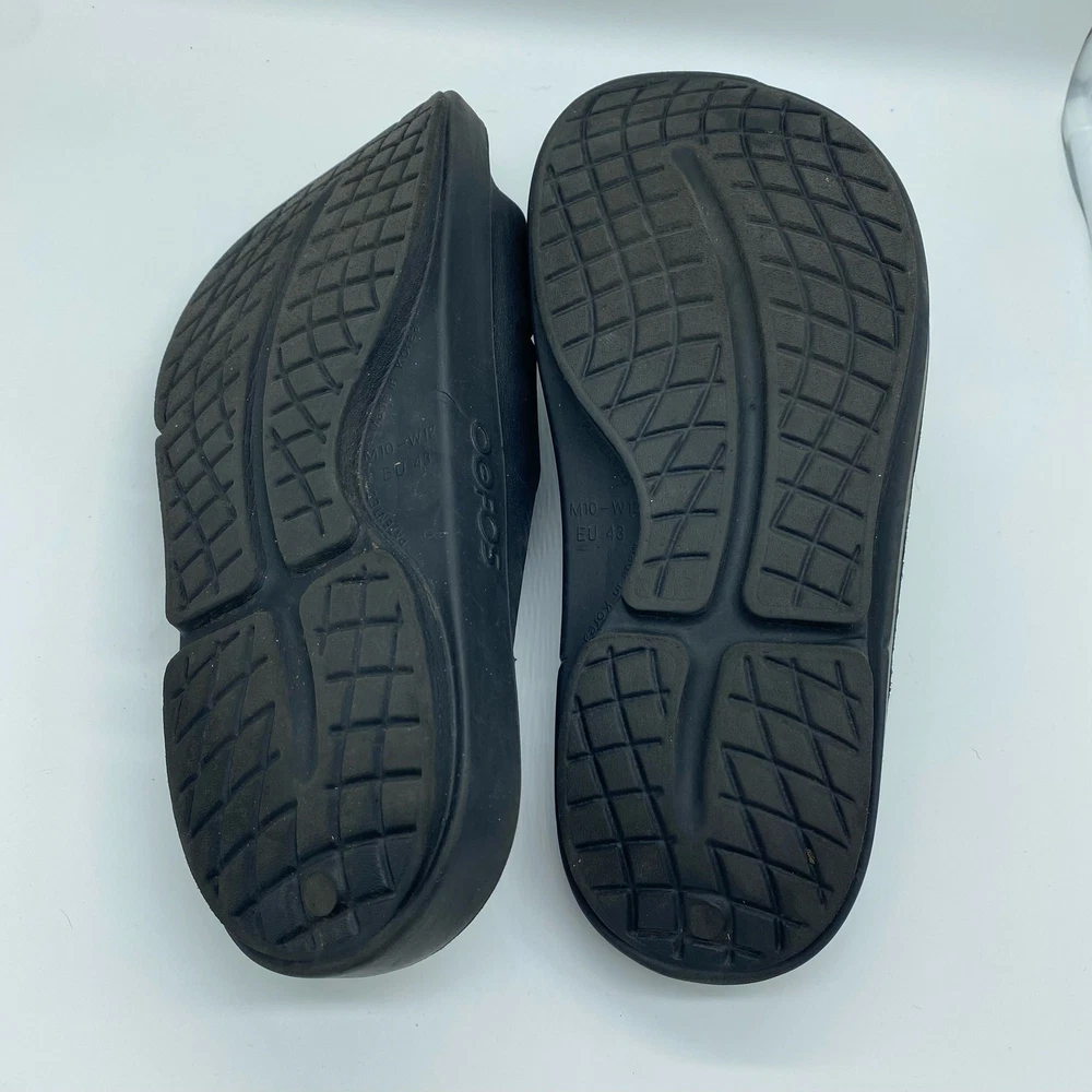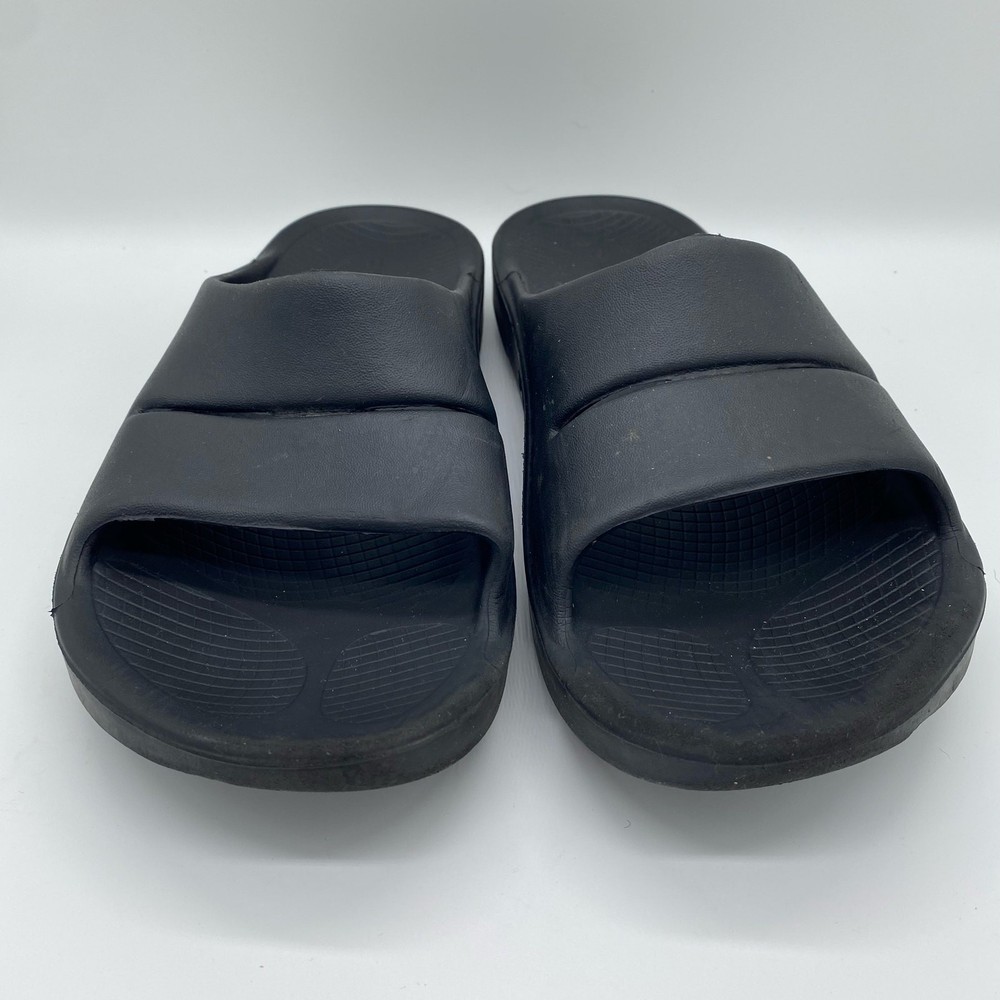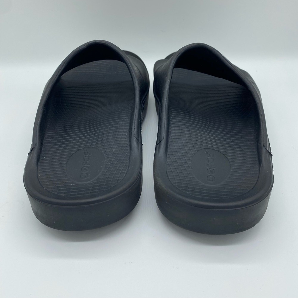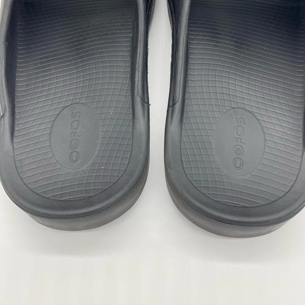 Oofos Men's size 10 Black Rubber Slide Sandals Comfort Shoes. Oofos brand sandals in a men's size 10 or women's size 12. Black colorway in a rubber material. Straps across the tops of the feet. Comfort shoes. In great pre-owned condition, see photos for more details. Always feel free to ask any questions you may have! Reasonable offers accepted.