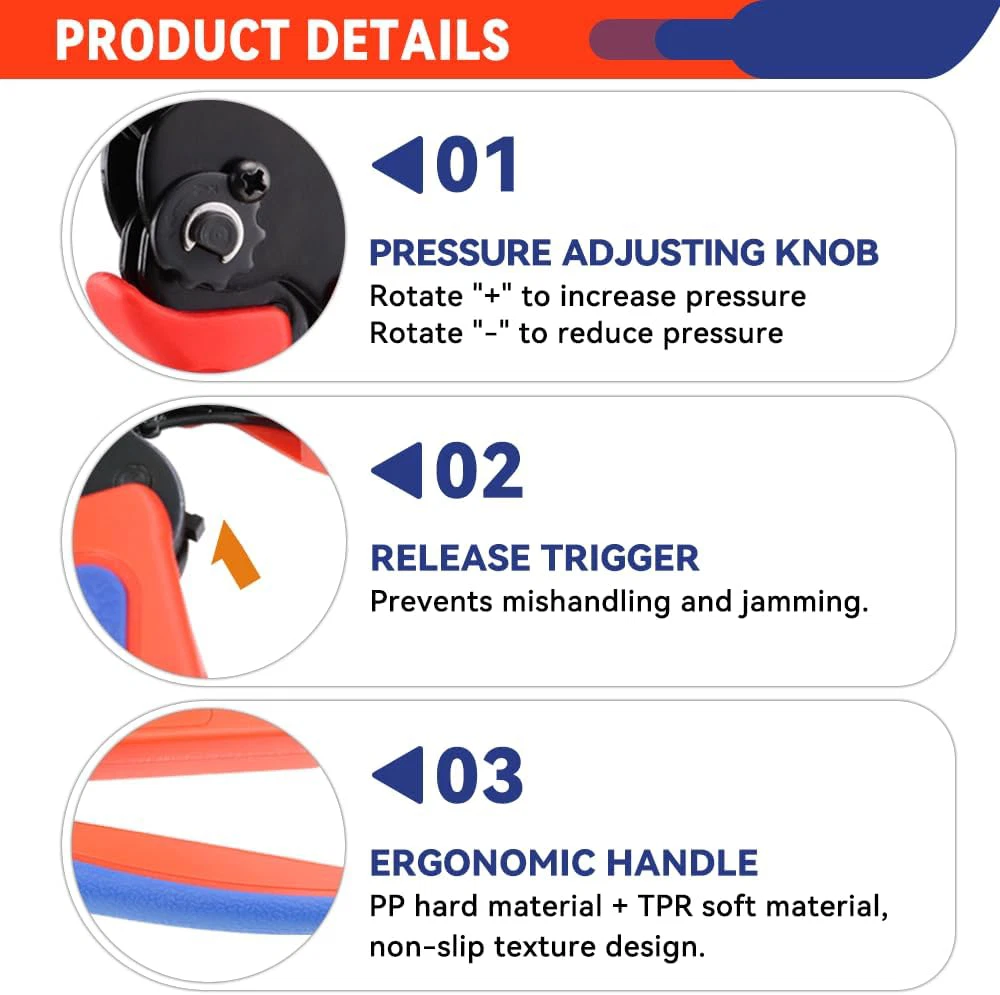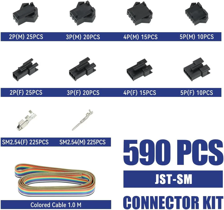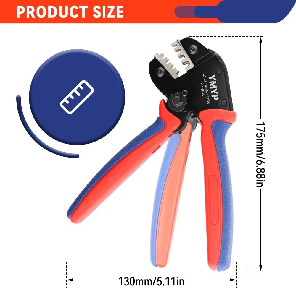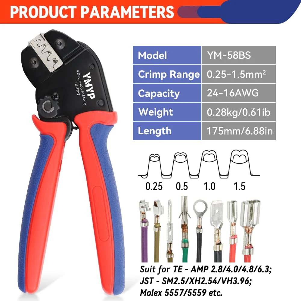 Pro-Crimper - Our grade crimpers featured an efficient ratcheting mechanism and precision machined crimp die to provide a solid crimp every time. Designed for non-insulated open barrel terminals including JST (XH2.54/SM2.54/VH3.96), TE AMP connectors (2.8/4.0/4.8/6.3 male and female spade), Bullet, Ring and Molex connectors. Labpr-Saving Lever - With an innovative torque structure,effortlessly crimp wires with 80% less effort, making your work faster and easier. Superior Mechanics - The crimping process completes a full ratcheting cycle by pressing down on the handle until the handle automatically releases. Customizable Crimping Power - Ensure precise crimping for your project with the adjustable crimp force knob. The quick release lever conveniently allows for opening of the crimper jaw at any position. Package Content: Crimper x 1, 590PCS JST-SM Connectors Kit x 1.
