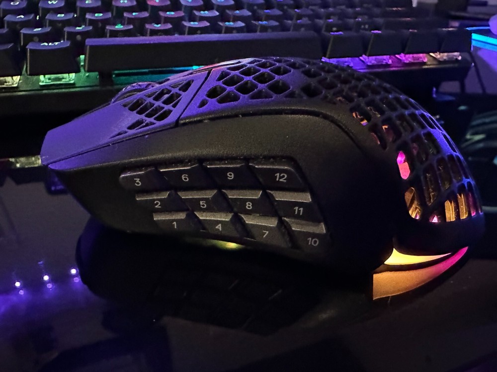 Elevate your gaming experience with the SteelSeries Aerox 9 Wireless Gaming Mouse, designed for the ultimate precision and comfort. This sleek black mouse boasts an impressive 18-button layout, with each button fully programmable to suit your specific gaming needs. The advanced optical tracking method ensures accurate movement on nearly any surface, while the high-precision sensor delivers up to 18000 DPI for crisp, responsive action. Connectivity is versatile, offering wireless, Bluetooth, and multiple RF options, including USB-C and Lightning, for seamless integration with your setup. The Aerox 9 also features a rechargeable battery, right-handed grip design, and a scroll wheel with a thumb button for efficient navigation. Turn on/off the mouse with a simple switch and enjoy the freedom of wireless play without the hassle of tangled wires.