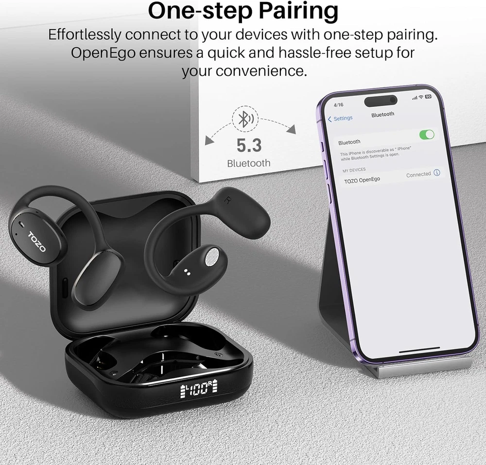 Store New Arrivals Add to Favorite View Feedback Contact Openego True Wireless Open Ear Headphone, 5.3 Bluetooth Sport Earbuds with Earhooks for 80H Playback with Digital Display, 32 EQ Modes Dual Mic Clear Call Sweat-Proof for Running Workout Black Description Item model number T13088 Bluetooth Version 5.3 Style True Wireless Open Ear Headphone, 5.3 Bluetooth Sport Earbuds Number of Items 1 Control Method Touch Is Electric Yes Frequency Response 20 KHz Theme Animal / Anime / Cartoon / Fantasy / TV Series / Video Game / Sport / Music / Gaming / Motorcycling / Office Meetings Battery Life 15 Hours Noise Control Sound Isolation Bluetooth Range 10 Meters Controller Type APP, Touch Control Type App Control/Touch Control Is Autographed No Wireless Communication Technology Bluetooth Cable Feature Without Cable Carrying Case Battery Charging Time 2 Hours Product Dimensions 4.02 x 3.66 x 1.65 inches Material Plastic, Metal Carrying Case Width 34.5 Millimeters Carrying Case Color Black Age Range (Description) ALL Ear Placement In Ear Impedance 16 Ohm Form Factor Open Ear Specific Uses For Product Travel, Business / Fitness / Entertainment / Gaming / Professional / School / Sleeping / Travel / TV Series / Video Game / Sport / Music / Gaming / Motorcycling / Office Meetings Included Components Charging Case, OpenEgo Wireless Open Earbuds, Quick Guide & User Manual, USB-C® (A to C) cable (20") Carrying Case Battery Capacity 600 Amp Hours Model Name OpenEgo Unit Count 1.0 Count Carrying Case Height 8.25 Millimeters Water Resistance Level Water Resistant Carrying Case Material Metal Item Weight 5.3 ounces Connectivity Technology Bluetooth, Wireless Open Earbuds Headphones Jack Bluetooth Audio Driver Type Dynamic Driver Carrying Case Length 20.4 Millimeters Color Black Sensitivity 100 dB Number of USB 2 Ports 1 Compatible Devices Bluetooth-enabled devices Audio Latency 45 Milliseconds Batteries 1 Lithium Metal batteries required. (included) Recommended Uses For Product Audio Monitoring / Calling / Cycling / Disc Jockey Use / Exercising / Gaming / Motorcycling / Office Meetings / Radio Communication / Running / Skateboarding / Snowboarding / Studio Carrying Case Battery Average Life 80 Hours Audio Driver Size 16.2 Millimeters Carrying Case Weight 10.9 Grams Earpiece Shape [Hybrid] Unparalleled Audio - TOZO OpenEgo boasts a 16.2mm large dynamic driver, delivering high-fidelity audio with a motor coil approximately 30% larger than conventional types. Enhanced by TOZO OrigX Acoustics, it offers translucent highs and immersive lows. Open Hearing&Focused Calling - In-ear free design, comfortable to wear, whether walking, cycling or driving, you can always sense the sound of outside, to be awareness and connecting. When calling, the Open ear earbuds effect of dual-microphone noise cancelling, can filter out the external noise, so that you and your friends clear calls as face to face chat. Ear Fit for Running Workout - Including pair of ear support for improving fit in package, ensuring they stay in place even during active workouts. Furthermore, OpenEgo sport headphone takes to IPX5 sweat-resistant, making it perfect for intense workouts and outdoor activities. TOZO APP Integration - Switch freely between 32 EQ modes with our exclusive TOZO APP. Customize sound settings, adjust equalizer preferences, and explore a wide range of features to personalize your audio journey. 80 Hours Playtime&LED Power Display - OpenEgo comes with a charging case that provides up to 80 hours of playtime, which is enough to play about 1,200 songs or hold 80 meetings (one meeting per hour), the package comes with Type-C USB cable that is convenient for you to charge the product quickly. In addition, the LED display on the charging case ensures that you always know the battery status. Product Description Open Listening, Comfortable Wear Designed for comfort, OpenEgo's non-intrusive design lets you enjoy your surroundings strolling the streets or immersed in work and entertainment. Directional Sound, Bass Bliss Experience precision with directional sound technology, minimizing sound leakage. With dynamic low-frequency enhancement, OpenEgo delivers a breathtaking audio quality. Directional Sound, Bass Bliss Experience precision with directional sound technology, minimizing sound leakage. With dynamic low-frequency enhancement. 16.2mm Large Dynamic Driver 14% larger than common open-ear headphones. Immerse yourself in clear highs and deep bass. Customized Experience Customize your audio experience and tailor all the settings to your preferences with the TOZO APP. One-Step Pairing Effortlessly connect to your devices with one-step pairing. Bluetooth 5.3 Technology Bluetooth 5.3 technology offers improved stability and faster pairing, providing high-quality audio. 1 Superior Sound 2 Long Battery Life 3 TOZO APP 4 Effortless Connecting 5 Bluetooth 5.3 Dual-Mic Call Noise Cancellation The advanced AI algorithms and dual-mic systems filter out unwanted noise from your surroundings, ensuring your voice remains clear and intelligible during calls. Enhanced Privacy The directional sound technology ensures that your audio remains private and prevents disturbing those around you, making it ideal for use in public. Safe Drive Enjoy your music without compromising your ability to hear important traffic sounds or sirens, promoting a safer driving experience. Max Comfort for Workouts The open-ear design makes air circulate freely, reducing moisture buildup and discomfort, and ensuring better ventilation and ear hygiene. Seamless Communication Stay connected and enjoy seamless communication without the need to remove your earphones or pause your audio playback. Smart LED Display The smart LED display on the charging case keeps you informed about the battery and charging status at a glance. Seamless Touch Control Effortlessly manage playback, answer calls, and access your voice assistant with just a tap. ABOUT US We offer the best prices around on hi