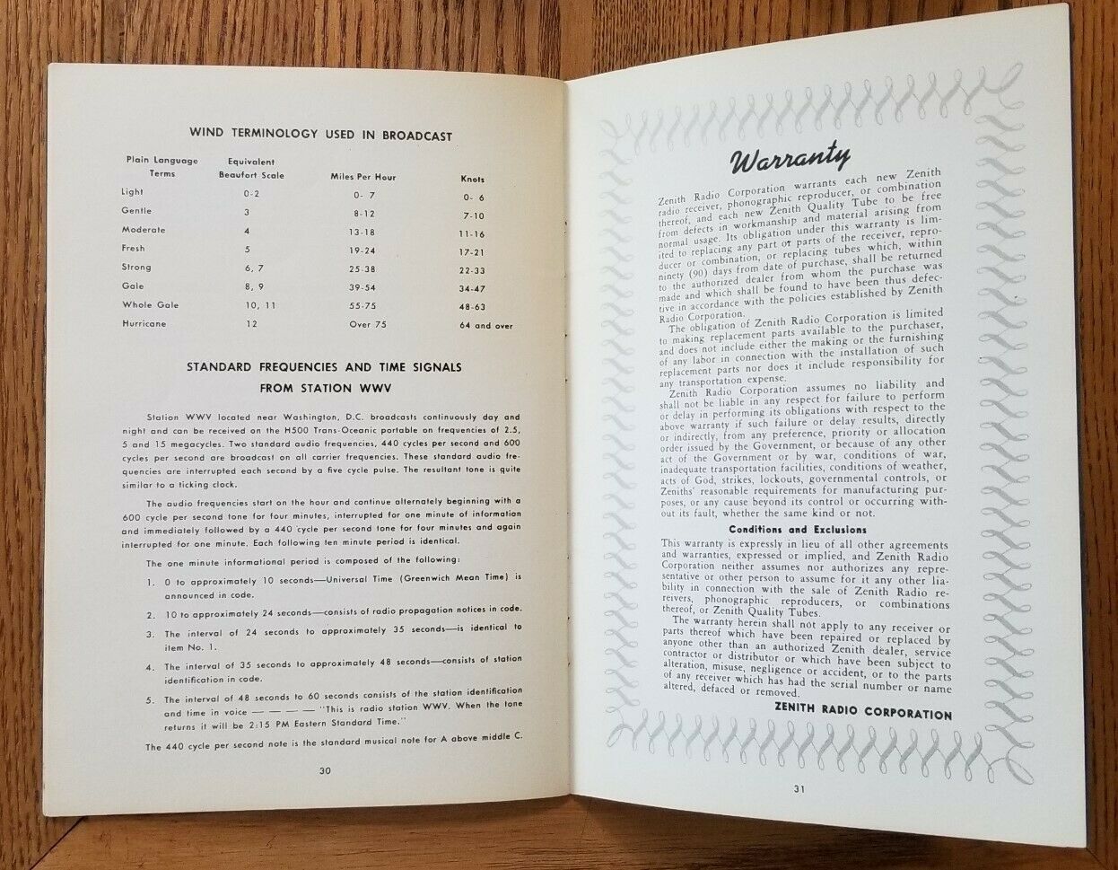 An original operating guide booklet for Zenith Super Trans-Oceanic Portable Model H500 radios. Excellent condition, station log is unmarked, no blemishes or stains, all pages are clean and without markings except the first page has pencil marking in upper left. Staple bindings are intact. A rare booklet indeed.... USA RESIDENTS ONLY. Must have feedback score of 5 or greater to bid on auction. If less than 5, contact me first to secure your intent to follow through with purchase. I will ship within two business days of receiving confirmed paypal payment. Please be prepared to submit payment within 48 hours of auction close. No returns unless item is damaged during shipment or does not function as described. Return item must be in original packaging with all documents that were included with original sale. Thanks for looking.