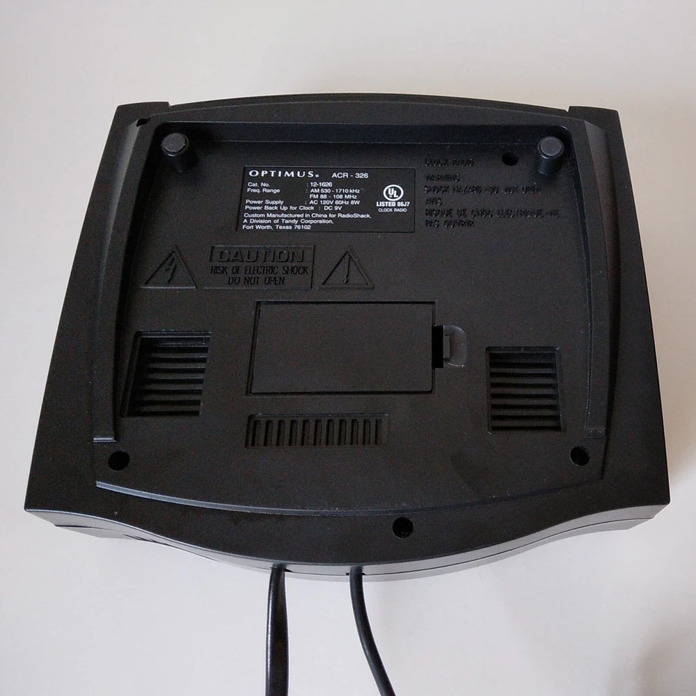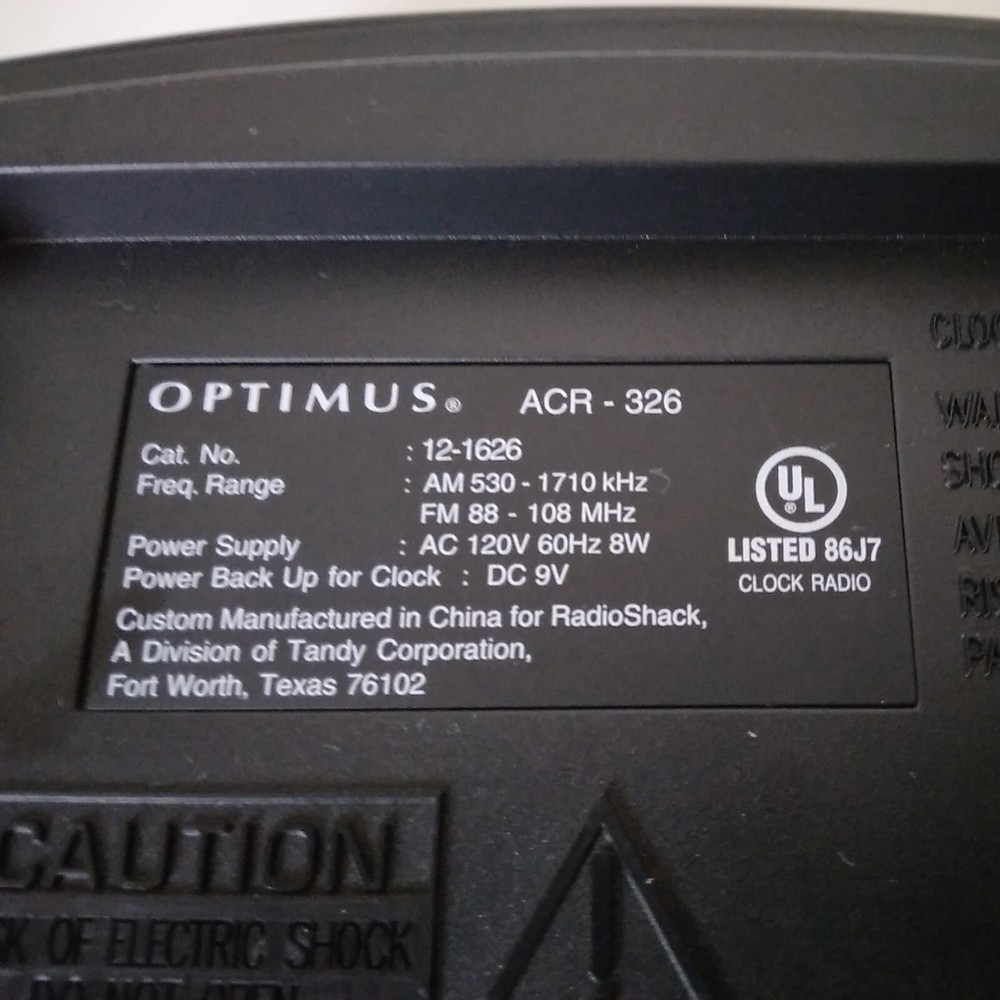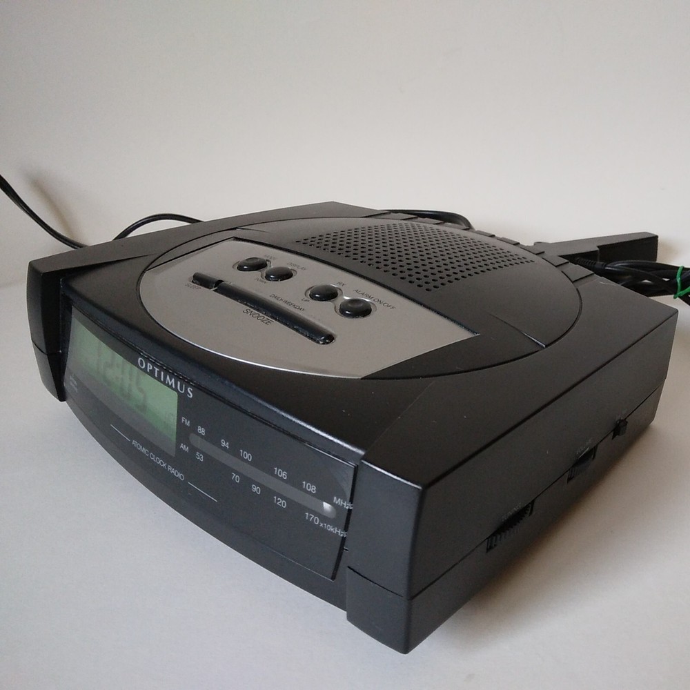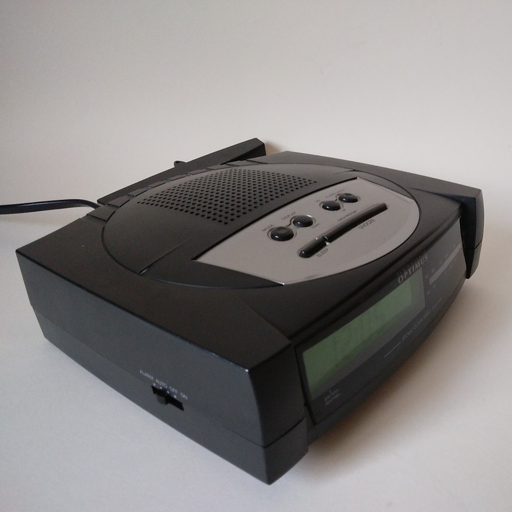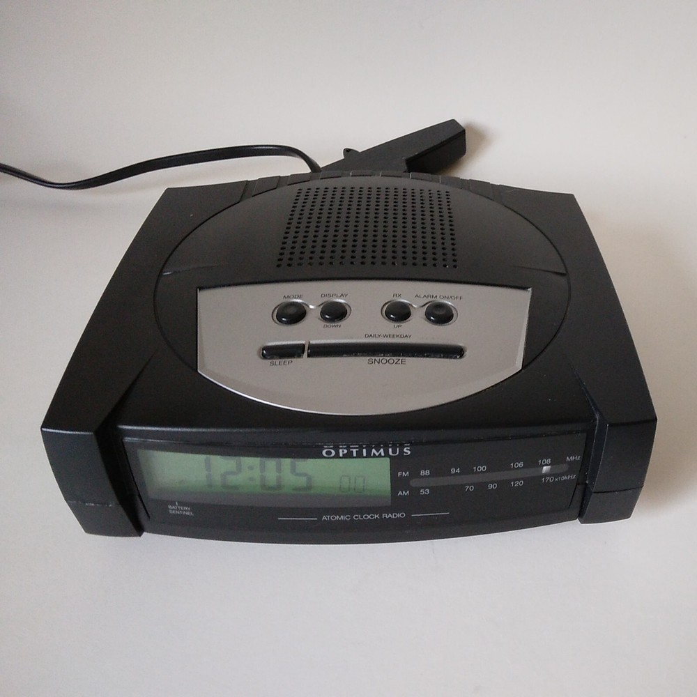 Optimus ACR 326 "Atomic Clock Radio" AM/FM Digital Alarm Clock made in 2000. All functions perform very well on this Clock. The alarm is a repeating beep. This clock has minimal cosmetic fading, scratches, and scuffing. See pictures for a cdetailed look. Will ship well protected. Thanks for the interest.