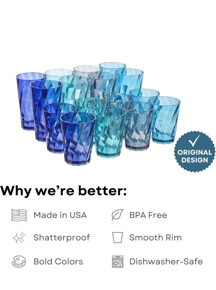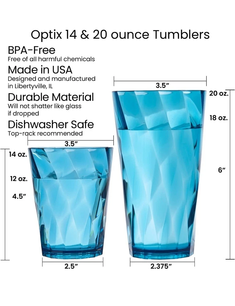 Optix Plastic Reusable Drinking Glasses (Set of 16) 14oz Rocks & 20oz Water Cups in Coastal Colors | BPA-Free Tumblers, Made in USA | Top-Rack Dishwasher Safe Elevate your drinkware collection with our American-made 16-piece set that includes eight 14 ounce glasses and eight 20 ounce glasses. Made from high-quality plastic material that’s free of harmful chemicals, our cups provide a reliable option for you and your party guests. These cups feature 4 beautiful coastal blue and grey colors, a stylish twist pattern, a smooth top edge for easy sipping, and a thick base that provides a glass-like appearance, making them both comfortable and stylish. This design will add an updated look to your kitchen aesthetic. Think outside the house- This Optix plastic glass set is a great addition to any college dorm room, first apartment, rv, and camper. Consider adding these as a wedding registry gift for a new household. Stock your home bar for cocktail hour or prepare for morning breakfast, brunch, and dinner with this selection of highball and rocks tumblers. Entertain outdoors on the patio, pool, or hot tub with these durable and shatterproof pieces. The 14 fl. Oz. Cup (3.5” diameter x 4.5” tall) and 20 fl. Oz. Cup (3.50” diameter x 6” tall) are versatile and suitable for any drinkware need Payment ●Payment must be received within 3 business days of auction closing. ●Please Note: Import duties, taxes and chargers are not included in the item price or shipping charges. These charges are the buyer's responsibility. Shipping ●Items will be shipped within 3 days after the cleared payment. All items will be checked carefully and packages in good condition. ●We will ship to ebay's address only. Please make sure your address on ebay is the same with your shipping address before you pay. ●Shipping and Handling will be determined based upon the ship to address ●If you didn't receive your package, this time schedule, please do not hesitate to contact us. Within 24 hours we will try to update you with the latest tracking details of the shipment. Return and Feedback ●We sincerely hope that you can leave us a positive feedback. If, for any reason you are not satisfied with your purchase, please contact us through "Ask Seller Questions" before leaving neutral or negative feedback ●If you are not satisfied about your received item, please return it within 30 days for a refund. ●We will accept any return and give a full refund (without shipping cost) on any item. The item must be returned to us in original condition and the buyer need to pay return shipping cost