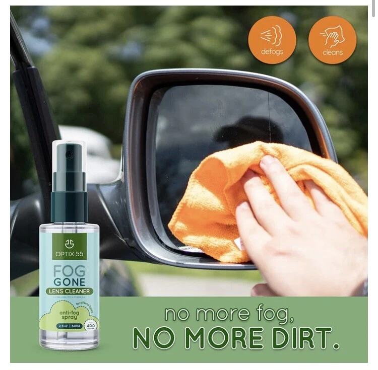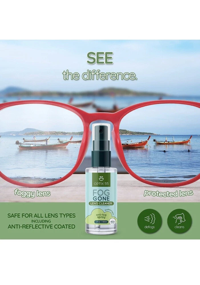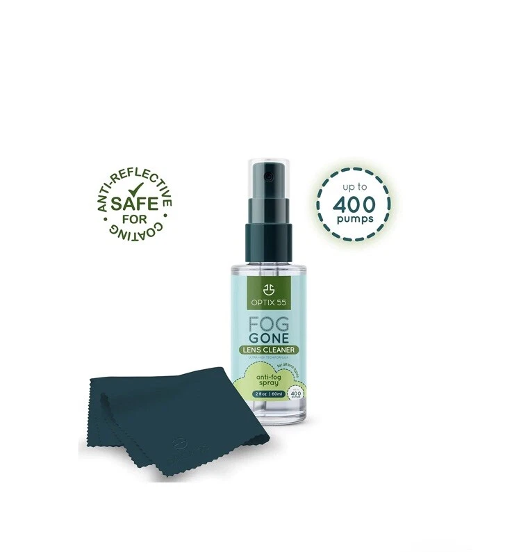 Optix 55 Lens Cleaner Anti Fog Spray for Glasses (2oz) + Microfiber Cloth(6"x7") | Glasses Cleaner Defogger for Eyeglasses, Swim Goggles, Ski Masks, Screens- Safe for AR Coated & All Lenses | Streak-Free Optix Lens Cleaner Anti Fog spray is specially designed for the glasses wearer to defog and clean your glasses both at the same time, and comes with a handy 6"x7" inch reusable microfiber cleaning cloth. Our spray performs perfectly on all materials and coatings FOG GONE BY OPTIX 55: ✔ Spray, rub, and rinse ✔ Safe and effective for Anti-reflective (AR) coated lenses and many different surface types and coatings ✔ Effective for rifle/gun scopes, binoculars, and telescopes ✔ Cleans & Defogs instantly ✔ Non-toxic, natural, and hypoallergenic ✔ Long lasting ✔ Streak-free ✔ #How To Use: Apply a small amount of the spray onto both sides of your clean lens or surface. Using your fingers, apply evenly in a circular motion on the entire surface. Be sure the liquid is all over the lens, and then let it sit for a minute. After approximately 60 seconds, gently wipe with a dry soft cloth to clear streaks. Let the surface dry completely before using. The Anti Fog spray should be reapplied as needed; The more times applied it the more effective it will be! ! Specifications: * Item Form: Spray * Item Volume: 2 fl oz. * Scent: Unscented * Specific Uses For Product: Eyeglass ! Package Includes: * 2 oz Anti-Fog Cleaning Lens Spray * Microfiber Cloth