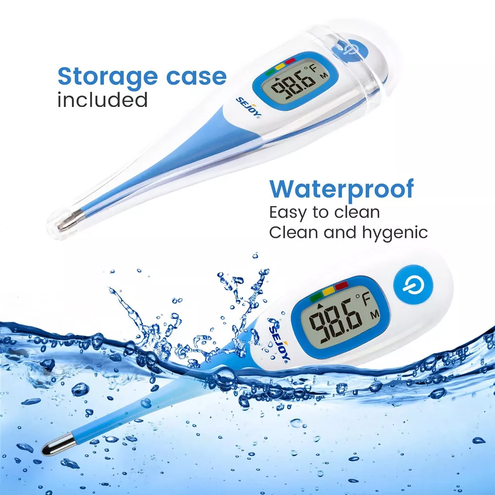 Product Description Sejoy - Professional Manufacturer for 20 years in Medical Sejoy focused on Personal Healthcare, Clinical Diagnosis and Mother and Baby care. We aim to help you to know your temperature at home in a more easier and comfortable way. We want to be your support when fever hits or basal body temperature tracking. Sejoy started manufacturing healthcare medical devices since 2002 , we focused on blood pressure monitors, thermometers, blood glucose monitors and other customerized home-care products. At this moment we have over 1500 workers working with automation equipments and semi-automatic equiment. All products are 100% inspected before shipment. With nearly 20 years production experience with automation to ensure quality consistency, and skilled R&D for keep improving. The quality and accuracy is tested by our clients all over the world. We warmly invite you to be one of our beloved customer. Fever Alarm This is a simple thermometer for kids and adults,no more memoring the fever temperature, you can tell whether the temperature is high or not just by looking at the color bar which the arrow points to.Like traffic lights. Recall Last Reading This termometro digital adults and kids, allows you to check your last reading result, so you can track the temperature curve and see if the temperature getting better or not. Finish Beep According to customer feedback, the finish Beep is a little soft as we don't want this to be loud to be annoying, you may need to pay a little more attention to this. Normally the buzzes are “ Bi-Bi-Bi-B i-”; Alarm beeps more rapidly when temperature reaches 100.0℉ (37.8 ℃) or higher ,and the buzzes “ Bi-Bi-Bi----- Bi-Bi-Bi------- Bi-Bi-Bi” Features of Sejoy Thermometers How do Sejoy digital thermometer reads the temperature in 5-10 seconds The thermometer will enter into the Actual Measurement after 3 minutes. You will get your real temperature besides the previous predictive temperature. One Press On The Digital Thermometer To Start Measuring 5s Fast Reading & High Accuracy: This digital thermometer provides accurate, simple to understand readings in only 5-10 seconds, so you can get results quickly. It also has a memory feature that recalls and displays last temperature taken, help track the temperature change. Easy to Read and Fever Alarm : The three-colour color-bar Fever In Sight printed on the thermometer helps understand temperature easily. Arrow on the display Points at green suggests a normal temperature, yellow signifies an elevated temperature and a red display indicates a high temperature. Digital thermometers provide fast, easy to read temperatures so you can tell if you or your child has a fever quickly and accurately. Versatile: With 5-10 second test time, oral,rectal, under arm, bath water mode provided , also equiped with soft silicone tip, reliable stainless steel probe, waterproof design, it is perfectly to be used as thermometer for adults and kids, pets, as baby thermometer, rectal thermometer, water thermometer, dog thermometer. The all in one thermometer for home use. Easy to use and Hygenic: The digital thermometer is waterproof for easy cleaning. Simply clean under the tap with a bit of soap. 10pcs disposal probe covers also included for use as oral thermometersand rectal thermometers, hygienic between use. It comes with a sanitary storage case, a battery, and probe covers, ready to use. Special Features: This digital thermometer is easy to read with larger LCD display, beeper alarm, memory display, auto shut off, easily switch the units between ℉ and ℃. Anything you need , pls kindly contact us through ebay message.("Lo" before testing means it hasn't sensed your temperture,which in other says is it's ready to test, "Lo" has nothing to do with the battery.) All in One Thermometer for Adults, Kids, Babies, Infants, Vets Use as: 1.Thermometer for Adults, Thermometer for kids(termometro digital adults and kids), as well as thermometer for Pets 2.Oral thermometer,rectal, under arm, bath water thermometers, basal body thermometer Q&A for question in the review: 1. Why the color box of the thermometer marked 10s? The actual testing time of the thermometer is from 5-10s, which you can see on the manual inside the boxes and test by practical measurement. As regular markings ,it is 5s or 8s or 10s.For 5s, some may think it is not true ,for 8s, we know it is not the exact time, so we choose to mark 10s, lower the expectations, and provide the actual time less than 10s. Hope that customers could kindly understand. 2. How to switch Celsius to Fahrenheit? ℉/℃ SWITCHABLE:Temperature readings are available in the or scale (℉/℃; located in the upper right corner of LCD.) 1. Turn on the thermometer. 2. During the last measured value displays, press and hold the On/Off button until ℃ or ℉ showes. 3. Quicky press On/Off button to switch between ℃ and ℉ modes. 4. When the desired unit displays on screen, wait for auto entering into measurement mode.