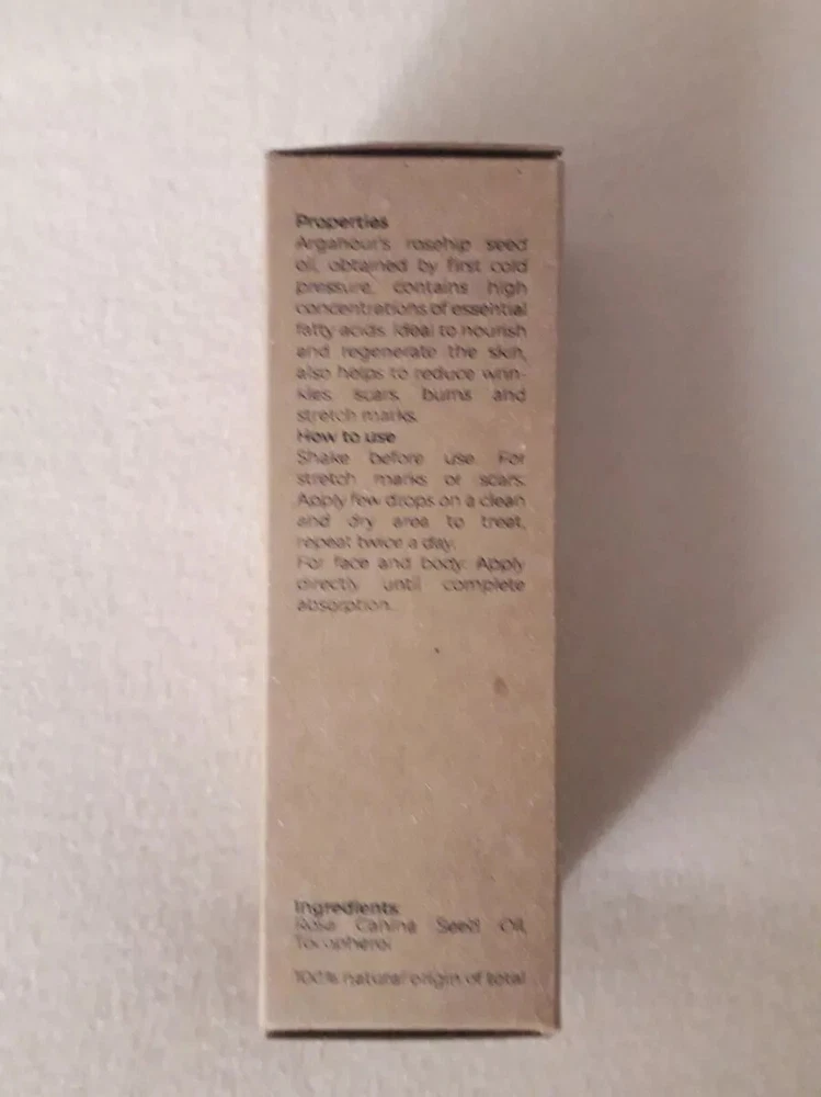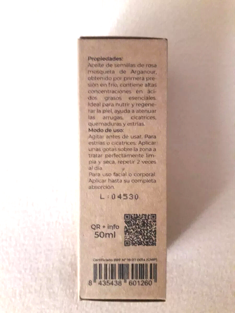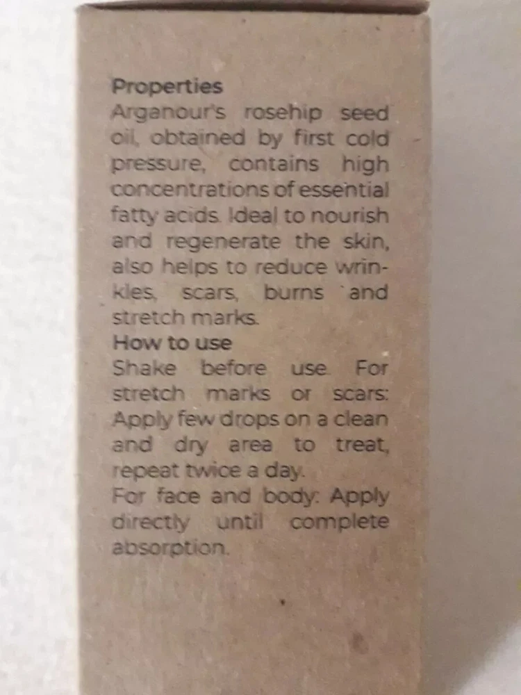 ARGANOUR Rosehip Seed Oil Natural & Organic First cold Pressed Oil 50ml Properties: Arganour's Rosehip seed oil, obtained by first cold pressure, contains high concentrations of essential fatty acids, ideal to nourish and regenerate the skin. Also helps to reduce wrinkles, scars, burns and stretch marks. How to use: Shake before use. For stretch marks or scars; Apply few drops on a clean and dry area to treat, repeat twice a day. For face and body: Apply directly until complete absorption. Brand New in Box. SHIPPING Sent by CTT. Registered or Priority mail with tracking number . Ship 3-5 business days after receiving cleared payment. Please see my other items. Thank you for looking :)