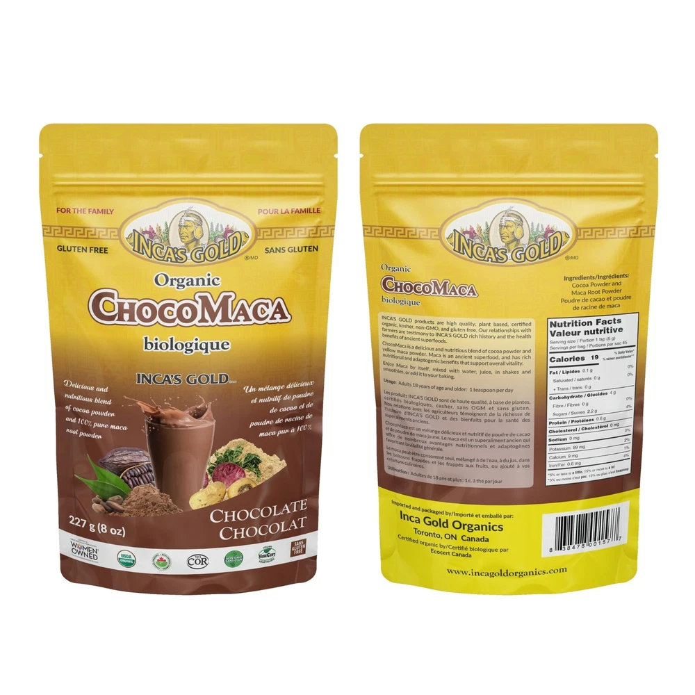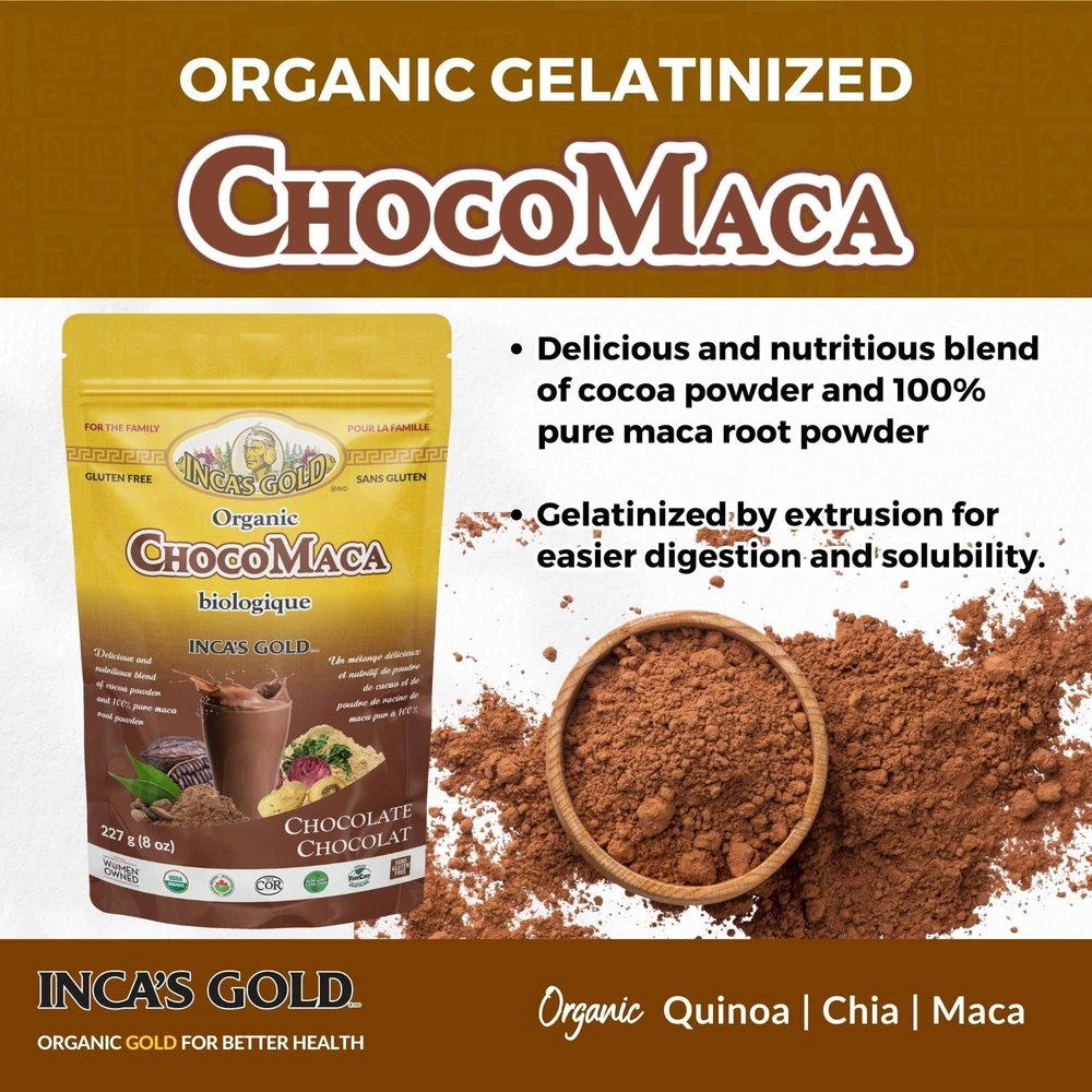 products are high quality, plant based, certified organic, kosher, non-GMO, and gluten free. Our relationships with farmers are testimony to rich history and the health benefits of ancient superfoods. ChocoMaca is a delicious and nutritious blend of cocoa powder and yellow maca powder. Maca is an ancient superfood, and has rich nutritional and adaptogenic benefits that support overall vitality. Enjoy ChocoMaca by itself, mixed with water, juice, in shakes and smoothies, or add it to your baking. Organic, Gluten-free, Kosher and Non-GMO Gelatinized for easier digestion and solubility Unique adaptogenic superfood 100% Pure Maca Powder and Cocoa Delicious and nutritious blend of cocoa powder and 100% pure maca root powder