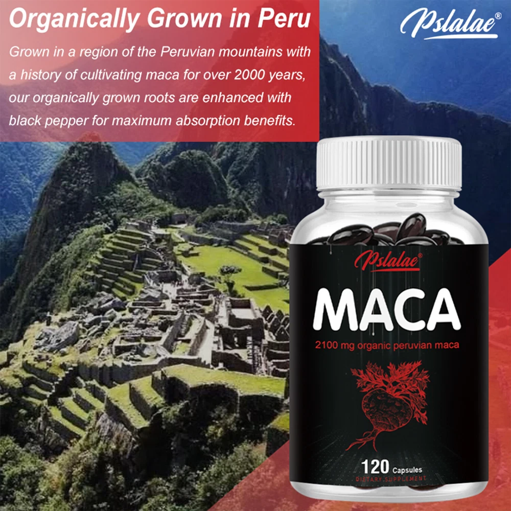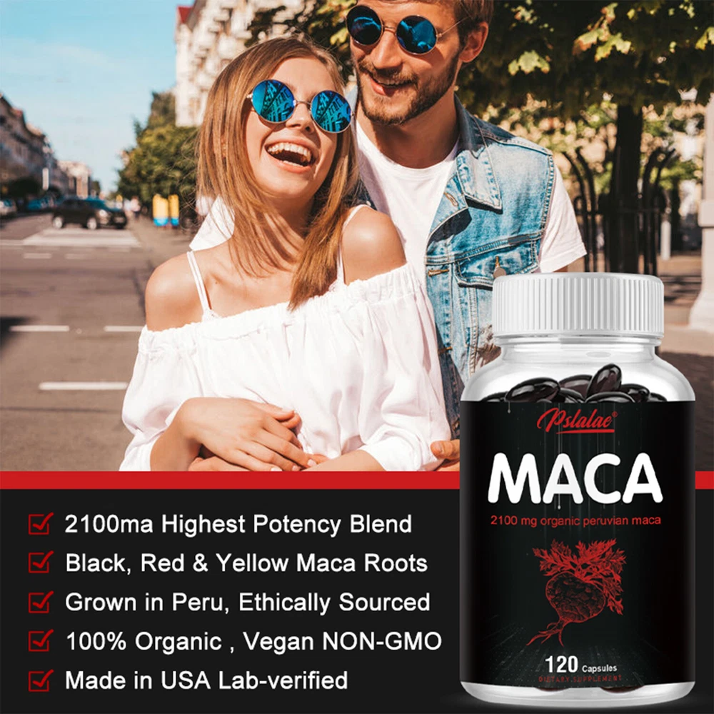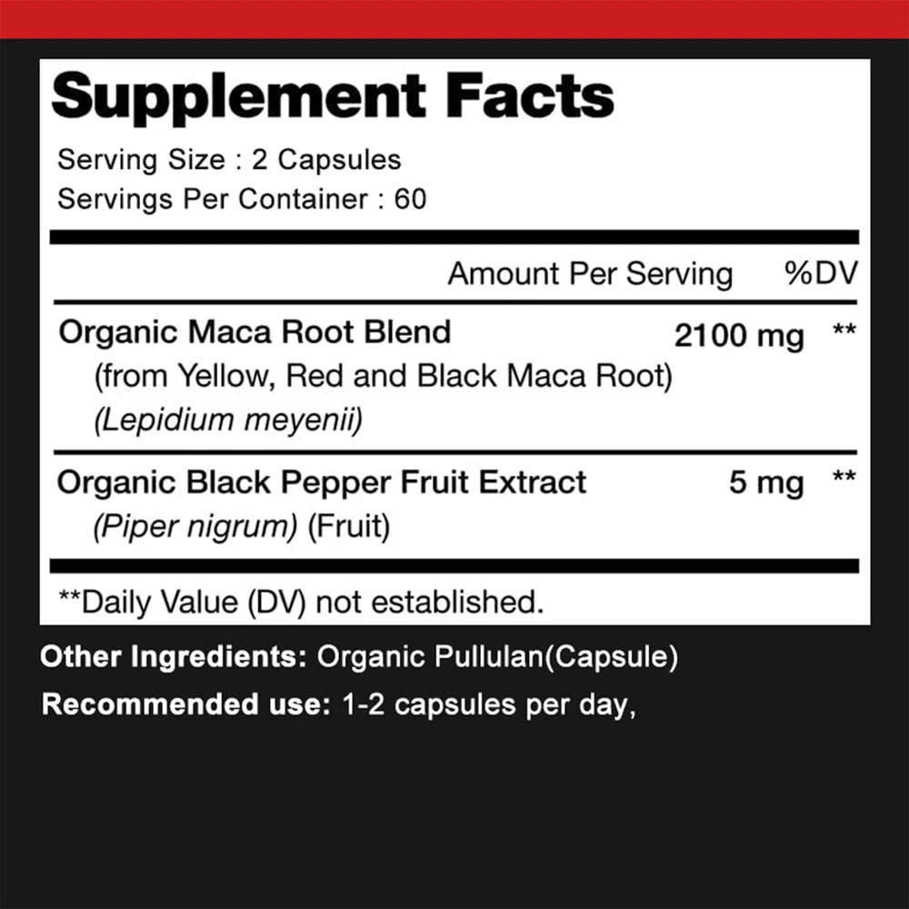 Effects: Energy & Endurance, Testosterone Booster Ingredients: Maca Directions: Take 2 capsules once daily after a meal. Shipping: Ships within 48 hours on working days. Shelf life: 2 years Description: Superior Absorption and Potency - Organic Maca Blend is gelatinized (broken down) for easier absorption and higher bioavailability. It contains black pepper extract to enhance absorption, ensuring your body gets all the benefits of maca. Black, red and yellow maca roots come together to unlock the extraordinary potential of maca root. Energy, Mood, Relaxation - Maca is grown in the Peruvian Andes and is known for providing natural energy, hormonal balance, and positive mood. Maca has also been shown to improve immune function, reduce fatigue, and promote relaxation. HIGH QUALITY - Produced in a GMP certified facility using non-GMO ingredients and rigorously third-party lab tested to ensure maximum purity and precise potency. Document