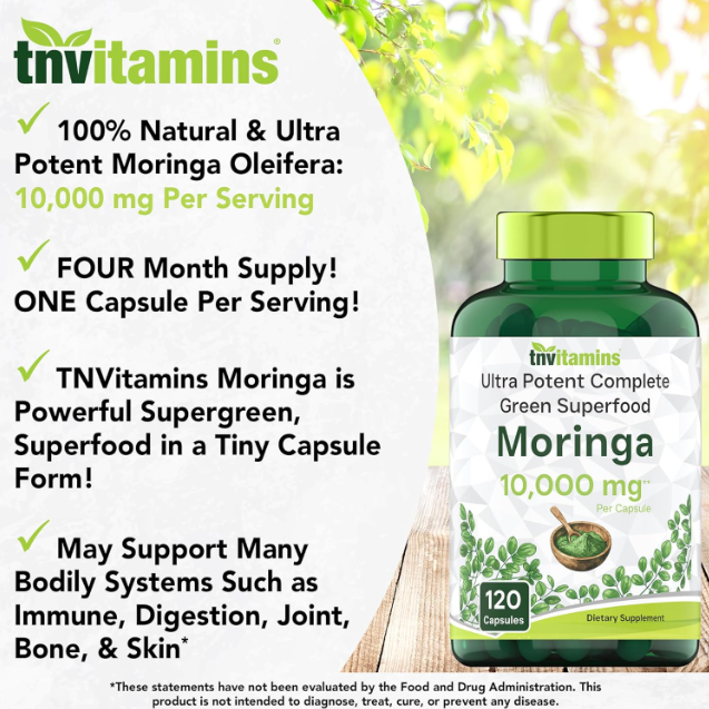 MORINGA Capsules Single Origin Moringa Powder Organic Moringa Leaf 120Capsules US Warehouse - FREE & FAST Shipping in US Product Description: These statements have not been evaluated by the FDA. This product is not intended to diagnose, treat, cure, or prevent any disease or health condition. Ultra Potent Moringa Capsules: 10,000mg Per Capsule! Four (4) Month Supply! Each Bottle Of Moringa Oleifera Leaf Powder Capsules Contains 120 Capsules, or a 4 Month Supply! Moringa Supplements Provide Powerful and Complete Supergreen and Superfood Nutritional Value! Moringa Powder Capsules May Help With Many Bodily Functions and Systems Due to Their Vitamin, and Mineral Content. Some Say That Moringa Powder Provides Energy,Boosts Metabolism, Immune Support, Digestion Support, as well as Joint, Bone, and Skin Support.* Moringa Capsules are Non-GMO! Our Moringa Powder Capsules are Both Manufactured and Third-Party Laboratory Tested in the USA! They are Free Of: Gluten, Peanuts, Tree Nuts, Sesame, Dairy (Milk and Eggs), Fish, Crustaceans, Soy, Wheat, Corn, Artificial Colors, Flavors, and Preservatives! Feedback: 1.Any question for your order, please contact us in time, we will reply to you within 24 hours and give you a satisfactory answer. 2.If you are satisfied with our products and services, hope to take up your a little precious time to leave feedback reviews for our products.Thanks! 3.Your satisfaction is our effort. Welcome to order again! Have a great day! Our Policy: 100% Satisfaction Guarantee 20% of restocking fee will be charged for return item