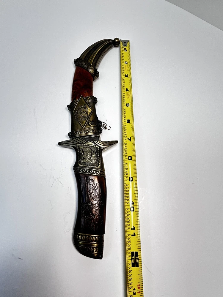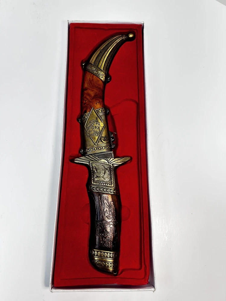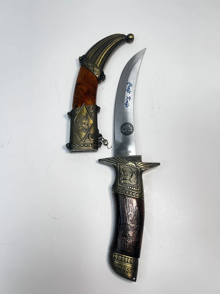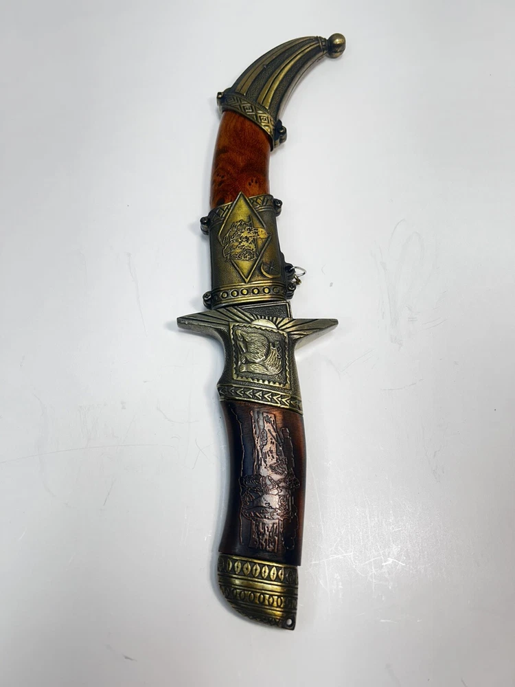 The Oriental Dagger Knife features a blade made of stainless steel with an etched design. The handle is crafted from wood and detailed with brass and copper accents, creating a visually striking piece. This dagger has a single cutting edge and an original design, showcasing intricate craftsmanship that is both functional and decorative. Made in China, this collectible item embodies a fusion of traditional Oriental aesthetics with modern stainless steel material.