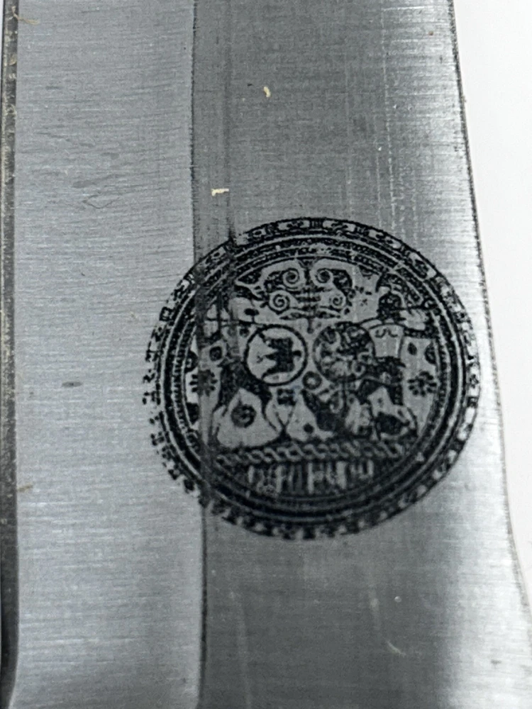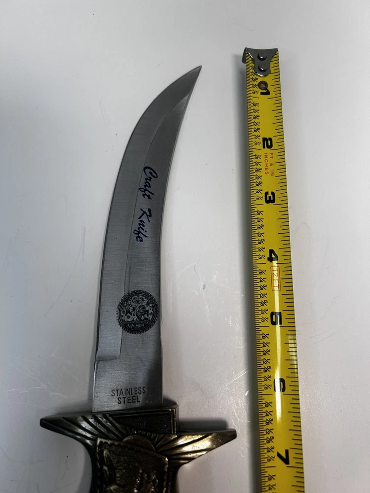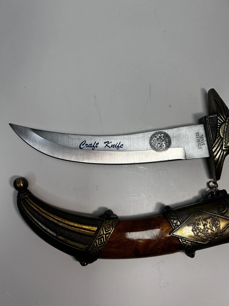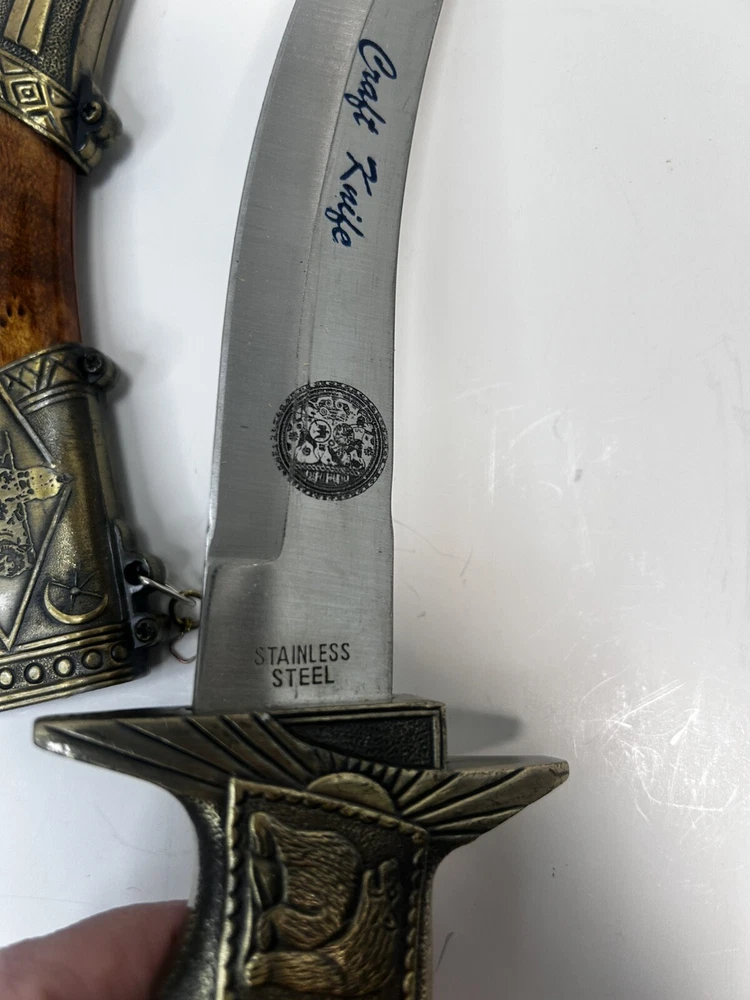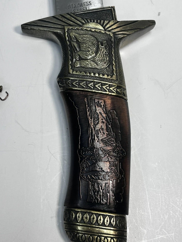 The Oriental Dagger Knife features a blade made of stainless steel with an etched design. The handle is crafted from wood and detailed with brass and copper accents, creating a visually striking piece. This dagger has a single cutting edge and an original design, showcasing intricate craftsmanship that is both functional and decorative. Made in China, this collectible item embodies a fusion of traditional Oriental aesthetics with modern stainless steel material.