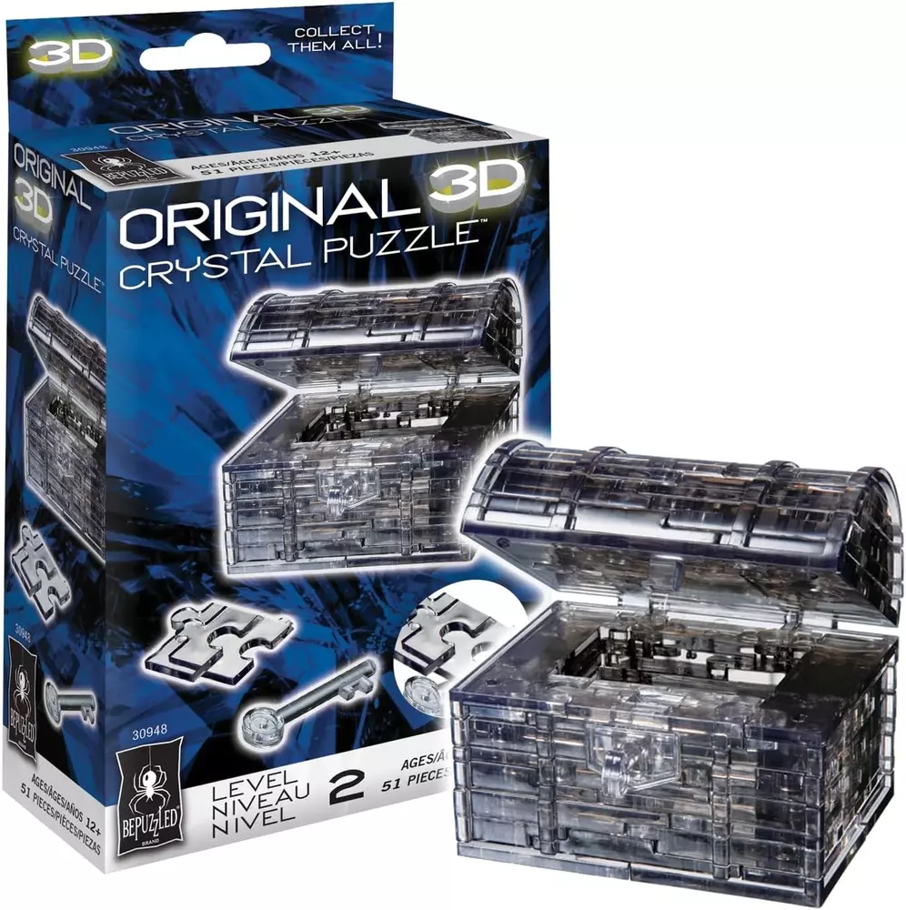 The Black Treasure Chest 3D Crystal Puzzle from BePuzzled is a sleek, translucent puzzle with 52 unique interlocking crystalline pieces, including key Take puzzling to a whole new dimension with this stunning, yet functional crystal puzzle Enjoyable to work on, challenging to complete and beautiful to display This 3D puzzle has a difficulty level of 2 and is fun for puzzlers age 12 and up Approximate assembled size = 3-1/8" x 2-3/8" x 2-1/2", 4" open Delight your mind and eyes with this 3D brainteaser that looks like it came off an old pirate ship! When you've pieced its interlocking plastic pieces together (it's a challenge), the key will open and close this colorful, sleek treasure chest. You’ll be proud to display this sleek, unusual puzzle, and can even store tiny items in it. BePuzzled is more than just jigsaw puzzles. It's puzzle-plus. WARNING: Do not order this product from retailers that ship from outside of the U.S. or Canada as it is most likely a poor quality, counterfeit product.