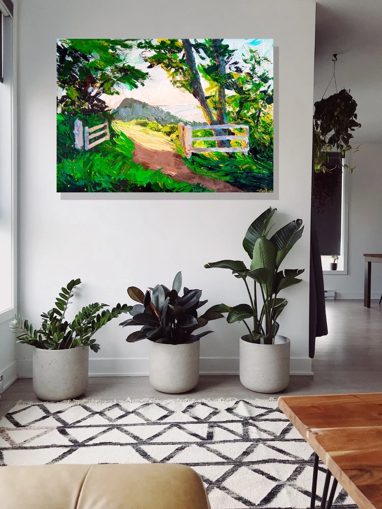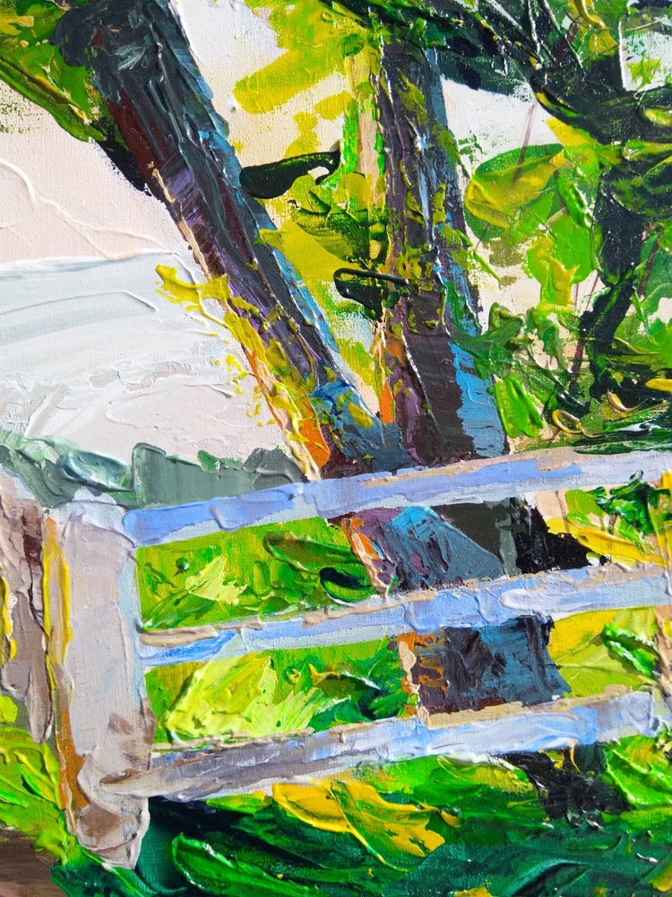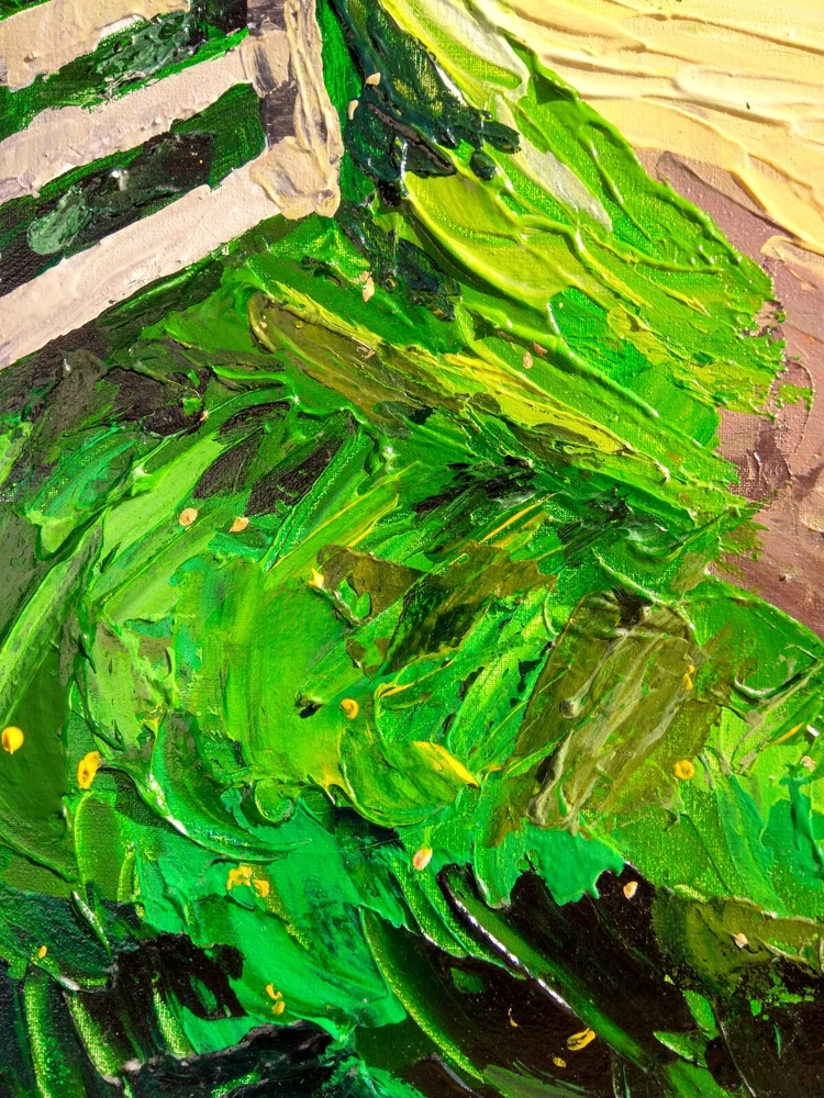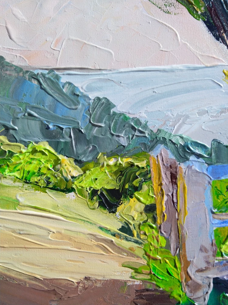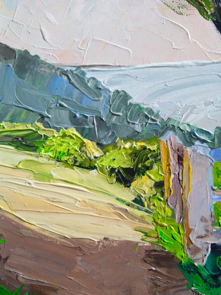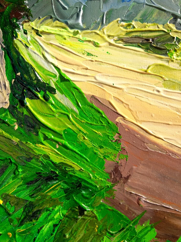 This painting was created to awaken memories from childhood. That interesting, curious and joyful life. Imagine that bike ride on a summer morning, seeing a new place, as if becoming a discoverer of an unknown continent. And also to inspire and try to return the child who is closed in himself. -ORIGINAL painting. This is not a copy or print. -Professional quality artists light fast acrylic paints on canvas using a palette knife. -Signature on the front and on the back. -Size: 50*70 cm. / 27x20" inches -Free shipping with tracking number summer painting,summer art,mountains painting,wood art,wood painting,colorful landscape painting,landscape painting,large landscape painting,original art,canvas painting,summer canvas painting,impasto landscape painting,3d painting,volumetric painting,palette knife painting,contemporary landscape