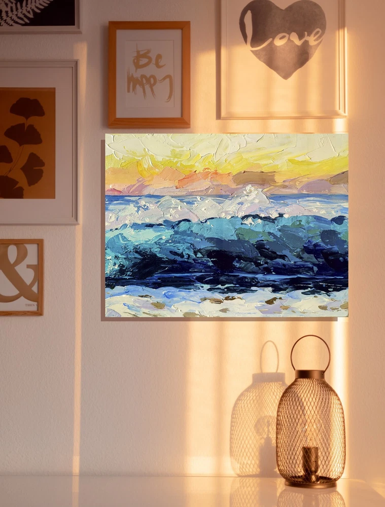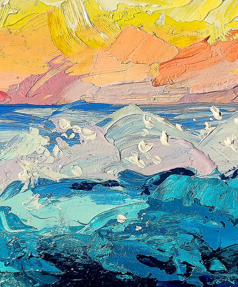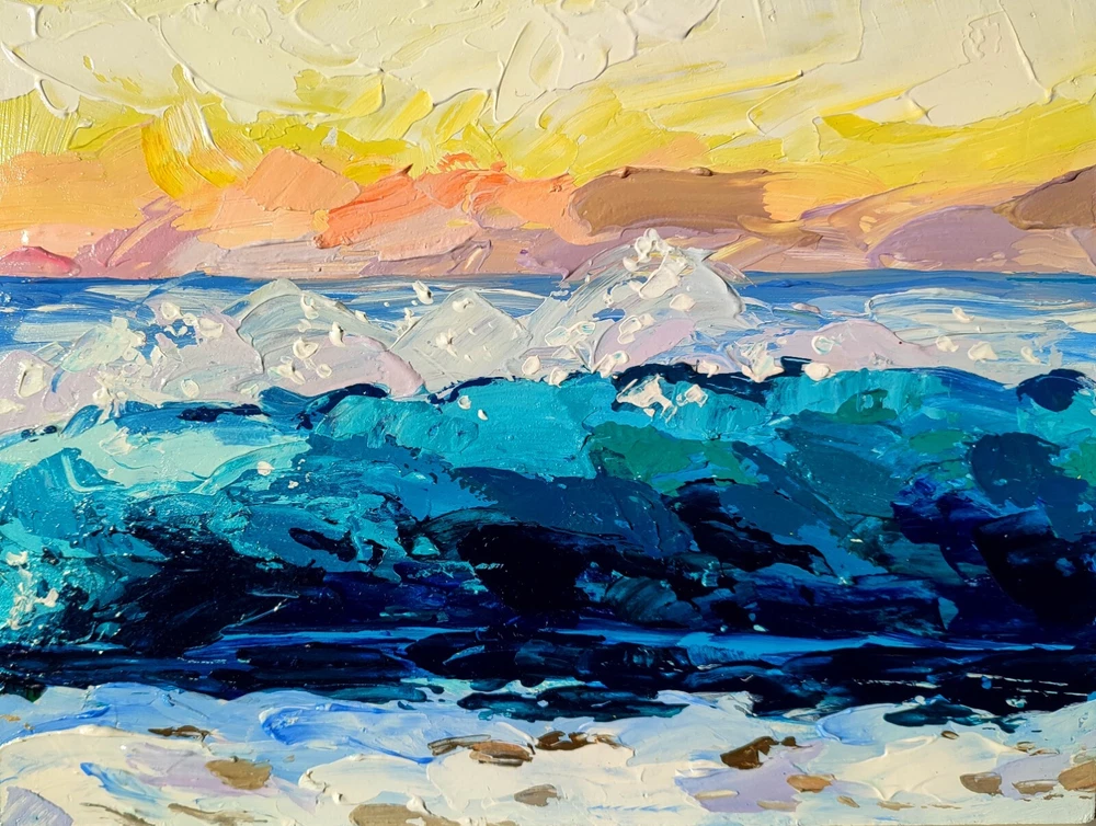This stunning original acrylic painting by Leyla Zhunus depicts a beautiful seascape with a focus on the ocean's vitality. Measuring 15.7x11.8 inches, this piece is crafted on cradled wood panel and features an impasto technique, making it a truly unique and one-of-a-kind addition to any art collection. The painting captures the essence of contemporary art, realism, impressionism, and post-impressionism, while also incorporating elements of travel, adventure, and nature. It is signed by the artist and is unframed, allowing for personalized framing to match any décor. This piece is perfect for those who appreciate the beauty of the ocean and the power of art to convey meaningful messages. -ORIGINAL painting. This is not a copy or print. -Professional quality artists light fast acrylic paints on cradled wood panel using a palette knife , does not require a frame - the edges are painted. -Signature on the front and on the back. -Size: 40*30 cm. / 15.7x11.8" inches -Free shipping with tracking number