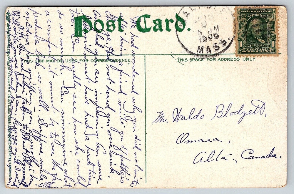 Year Manufactured: 1908 Type: Original Genuine Antique Vintage Postcard Size: Standard (5.5 x 3.5 in) Number of Items in Set: 1 Unit of Sale: Single Unit Seller Notes: “Good Vintage Condition. See Pictures And Description Closely For Details.” Finish: Matte Country/Region of Manufacture: United States Country: United States Posted: Yes gtin13: DOES NOT APPLY Featured Person: None Vintage: Yes City: Boston Postage Condition: Posted Location: Boston, Massachusetts USA Original/Licensed Reprint: Original Era: Divided Back (1907-1915) Continent: North America Orientation: Horizontal Material: Paper Time Period Manufactured: 1900-1919 UPC: DOES NOT APPLY Features: Divided Back, Stamp, Stamped, Original Genuine Antique Vintage Postcard Signed: Yes Antique: Yes Signed By: Sender Color: Multicolor Region: Massachusetts Theme: Architecture, Cities & Towns, Community Life, Famous Places, Historical Figures, Landscapes, Nautical, Roadside America, Seasons, Social History, Technology, Transportation, Travel, Postcard, Antique, Vintage, Ephemera, Collectible, Memorabilia, Old, Retro, History, Card, Mail, Paper Subject: Cities & Towns Stamp: Yes