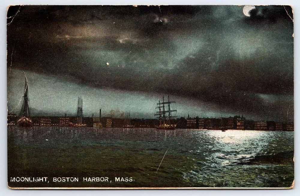 Original Old Vintage Antique Postcard Moonlight Boston Harbor Massachusetts USA