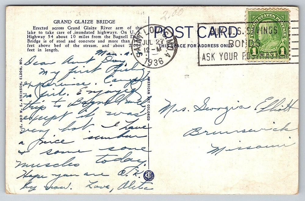 Finish: Matte Orientation: Horizontal Artist: Postcard Vintage: Yes Number of Items in Set: 1 Era: Divided Back (1907-1915) Type: Mail Old Genuine Original Postcard Card Image Picture Antique Seller Notes: “Good Vintage Condition.” Subject: Bridge Unit of Sale: Single Unit Material: Paper Signed: Yes Brand/Publisher: W.E. And M.E. Atkinson, Eldon, Missouri Features: Divided Back, Stamp, Stamped, White Border, Original Genuine Antique Vintage Postcard Posted: Yes Occasion: Postcard Signed By: Sender Time Period Manufactured: 1930-1939 Character: Postcard Postage Condition: Posted Color: Multicolor Year Manufactured: 1936 Size: Standard (5.5 x 3.5 in) Region: Missouri UPC: DOES NOT APPLY Antique: Yes Continent: North America City: Lake Of The Ozarks Country/Region of Manufacture: United States Country: United States Stamp: Yes Original/Licensed Reprint: Original gtin13: DOES NOT APPLY Franchise: Postcard Theme: Architecture, Community Life, Domestic & Family Life, Famous Places, Landscapes, Roadside America, Seasons, Social History, Transportation, Travel