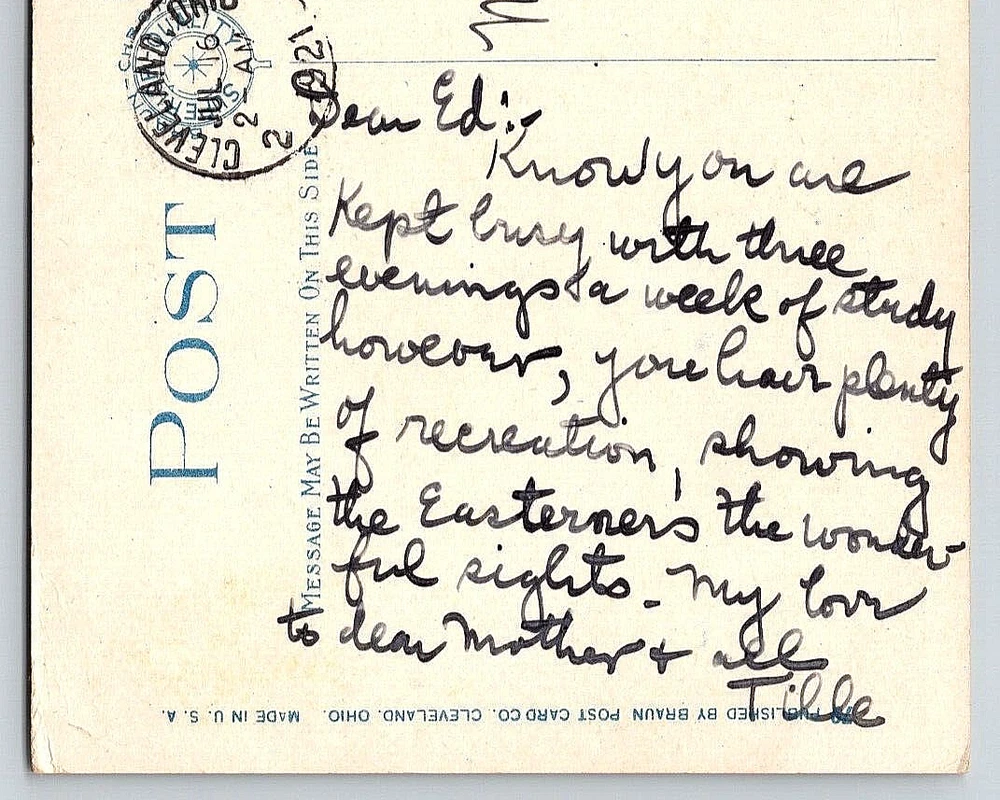 Finish: Matte Material: Paper Era: Divided Back (1907-1915) Number of Items in Set: 1 Artist: Postcard Signed: Yes Featured Person: None Country/Region of Manufacture: United States Time Period Manufactured: 1920-1929 City: Cleveland Stamp: Yes Unit of Sale: Single Unit Orientation: Horizontal Region: Ohio Subject: Original Genuine Antique Vintage Postcard Vintage: Yes Type: Mail Old Genuine Original Postcard Card Image Picture Antique Continent: North America Seller Notes: “Good Vintage Condition.” Signed By: Sender Posted: Yes Postage Condition: Posted Occasion: Postcard Franchise: Postcard Brand/Publisher: Braun Post Card Co. Year Manufactured: 1921 gtin13: DOES NOT APPLY Size: Standard (5.5 x 3.5 in) Original/Licensed Reprint: Original Antique: Yes Theme: Architecture, Art, Cities & Towns, Famous Places, Landscapes, Roadside America, Tourism Character: Postcard UPC: DOES NOT APPLY Country: United States Features: Divided Back, Stamp, Stamped, White Border, Original Genuine Antique Vintage Postcard Color: Multicolor