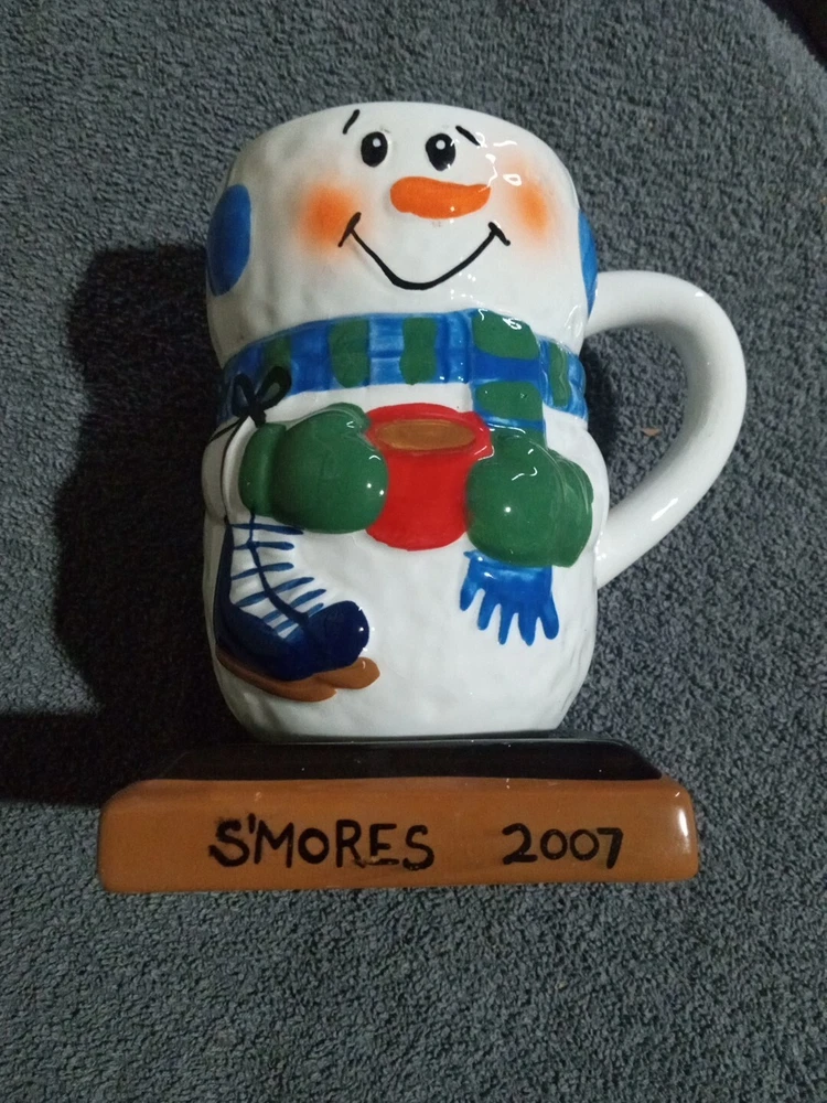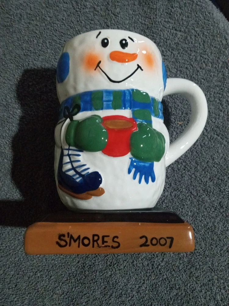 The Original S'mores Snowman Mug by Midwest of Cannon is a ceramic coffee mug with a capacity of 8oz. It features a 3D snowman design and is part of the contemporary style. This mug is decorated and is not microwave or dishwasher safe. It is a licensed original product from The Original S'mores franchise, perfect for winter beverages like hot chocolate or coffee.