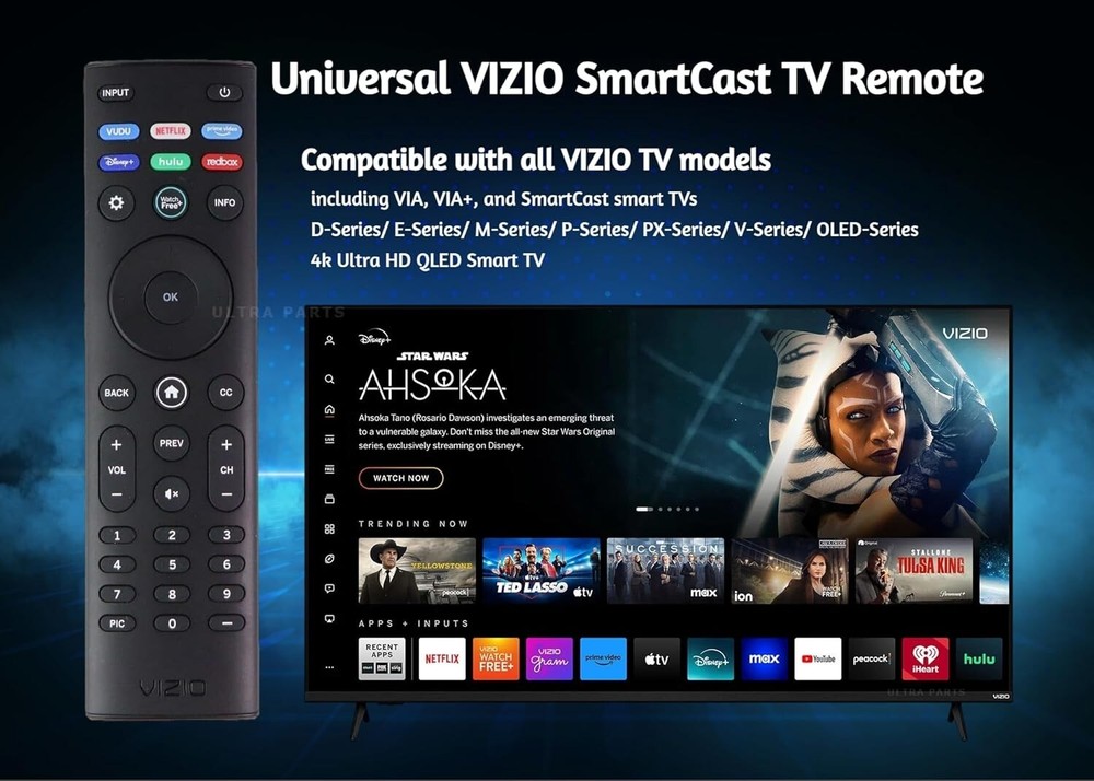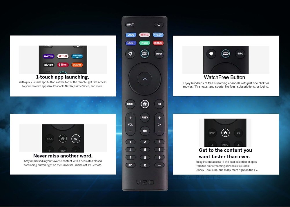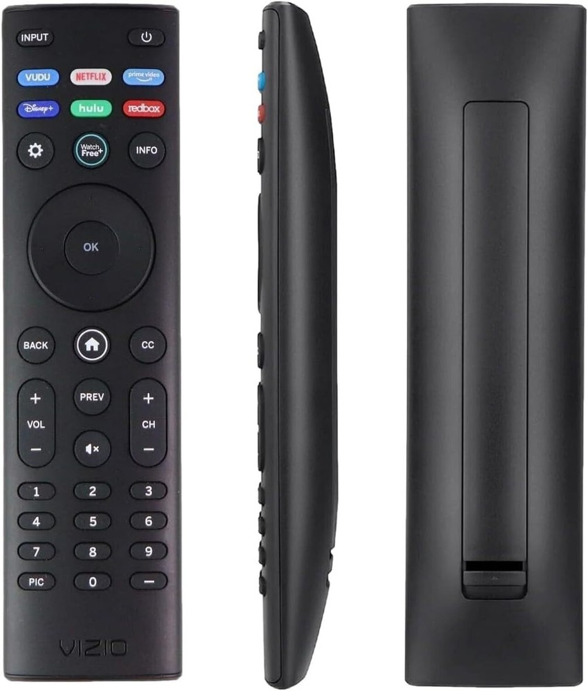 OEM Replacement Remote Control XRT140 fits for All VIZIO LED LCD HD UHD HDR Smartcast 4K 3D Smart TVs, including D-Series, E-Series, M-Series, P-Series, PX-Series, V-Series, OLED-Series with 4 Shortcut APP Keys - Vudu, Netflix, PrimeVideo, Disney+, Hulu, and Redbox buttons. Compatibility: Full HD 4K-Series: VHD32M-0807 VHD24M-0810 VFD32M-0807 VFD40M-0810 VFD43M-0804 V4K43M-0801 V4K50M-0807 V4K55M-0801 V4K65M-0804 V4K70M-0801 V4K75M-0804 V4K86C-0804 D-Series: D24h-J09 D24F-F1 D24F-G9 D24H-G9 D32h-J09 D32F-F1 D32F-G4 D32H-F0 D32H-F1 D32H-F4 D39F-F0 D39F-F1 D40F-F1 D40F-G9 D43-F1 D43F-F1 D43F-F2 D43FX-F4 D48F-F0 D50-F1 D50-F501 D50F-F1 D50X-G9 D55-F2 D55X-G1 D60-F3 D65-F1 D65X-G4 D70-F3 D24F-G1 D32F-G1 D32H-G9 E-Series: E32-D1 E32H-D1 E40-D0 E43-D2 E43-E2 E43-F1 E43U-D2 E48-D0 E48U-D0 E49U-D1 E50-D1 E50-E1 E50-E3 E50-F2 E50U-D2 E50X-E1 E55-D0 E55-E1 E55-E2 E55-F0 E55-F1 E55U-D0 E55U-D2 E60E-3 E60-E3 E60-F3 E60U-D3 E65-D0 E65-D1 E65-E0 E65-E1 E65-E3 E65-F0 E65-F1 E65U-D1 E65U-D3 E70-D3 E70-E3 E70-F3 E70U-D3 E75-E16 E75-E3 E75-F1 E75-F2 E80-E3 E80-F3 E80U-DE M-Series: M50-D1 M50-E1 M55-D0 M55-E0 M55-F0 M60-D1 M65-D0 M437-G0 M507-G1 M557-G0 M558-G1 M657-G0 M658-G1 M65-E0 M65-F0 M70-D3 M70-E3 M70-F0 M70-F3 M75-E1 M80-D3 M43Q6-J04 M43Q6M-K04 M50Q6-J01 M50QXM-K01 M55Q6-J01 M65Q6-J09 M65Q6M-K04 M75Q6-J03 P/PX-Series: P50-C1 P55-C1 P55-E1 P55-F1 P55RED-F1 P65-C1 P65-C1 P65-E1 P65-F1 P75-C1 P75-E1 P75-F1 P659-G1 P759-G1 PX65-G1 PX75-G1 PQ65-F1 V-Series: V405-G9 V435-G0 V435-G1 V436-G1 V555-G1 V556-G1 V585-G1 V605-G3 V655-G9 V656-G4 V705-G1 V705-G3 V755-G4 V505-G9 V435-J01 V435M-K04 V505-J09 V505M-K09 V555-J01 V585-J01 V655-J09 V655M-K04 V655M-K03 V705-J01 V705-J03 V755-J04 OLED-series: VQD43M-0801 M55Q6-L4 M65Q6-L4 M75Q6-L4 VQP65C-84 VQP75C-84 OLED65-H1 OLED55-H1 Product Description Compatible Brand: VIZIO Smartcast 4K 3D Smart TVs Remote Feature Shortcuts:Vudu, Netflix, PrimeVideo, Disney+, Hulu, and Redbox buttons. Upgrade Chip, Durable Lifespan, High Quality, and Stable Performance. Designed for easy replacement and operation. Color: Black Material: ABS Material. Stability and Safety: Better viewing experience, Easy to pair, and made from premium quality materials for long-lasting durability. Package Content: 1 x IR Remote Control (Batteries and Instruction Manual are not included).