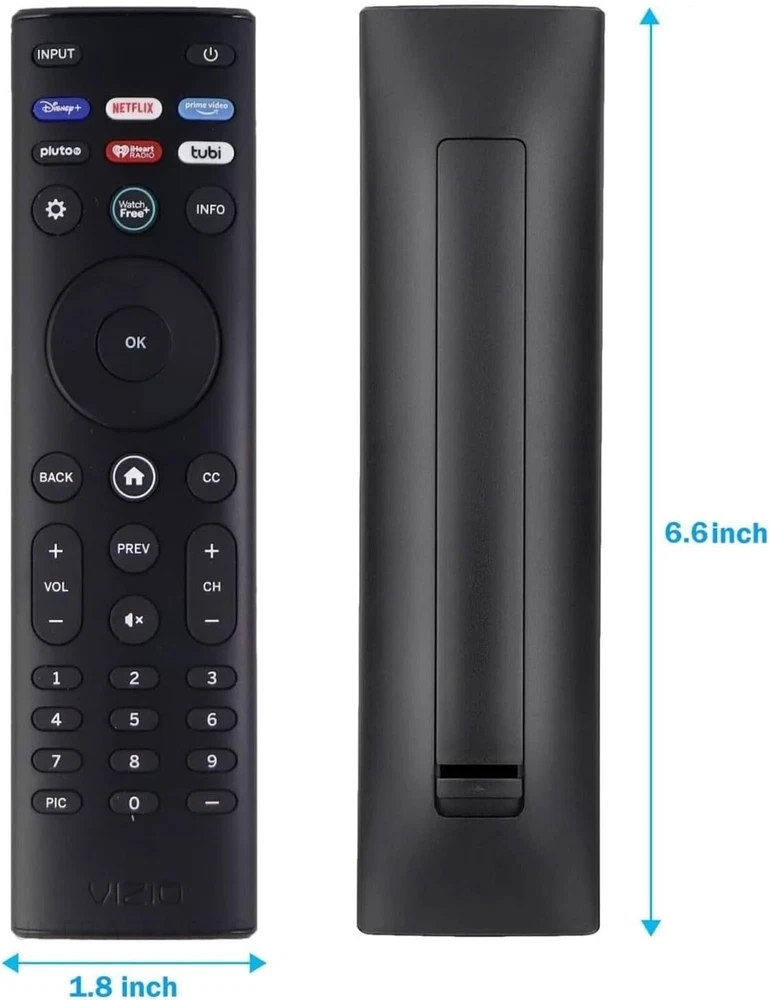 OEM Replacement Remote Control XRT140 fits for All VIZIO LED LCD HD UHD HDR Smartcast 4K 3D Smart TVs, including D-Series, E-Series, M-Series, P-Series, PX-Series, V-Series, OLED-Series with 4 Shortcut APP Keys - Disney+, Netflix, PrimeVideo, Pluto, iHeart and Tubi buttons. Compatibility: Full HD 4K-Series: VHD32M-0807 VHD24M-0810 VFD32M-0807 VFD40M-0810 VFD43M-0804 V4K43M-0801 V4K50M-0807 V4K55M-0801 V4K65M-0804 V4K70M-0801 V4K75M-0804 V4K86C-0804 D-Series: D24h-J09 D24F-F1 D24F-G9 D24H-G9 D32h-J09 D32F-F1 D32F-G4 D32H-F0 D32H-F1 D32H-F4 D39F-F0 D39F-F1 D40F-F1 D40F-G9 D43-F1 D43F-F1 D43F-F2 D43FX-F4 D48F-F0 D50-F1 D50-F501 D50F-F1 D50X-G9 D55-F2 D55X-G1 D60-F3 D65-F1 D65X-G4 D70-F3 D24F-G1 D32F-G1 D32H-G9 E-Series: E32-D1 E32H-D1 E40-D0 E43-D2 E43-E2 E43-F1 E43U-D2 E48-D0 E48U-D0 E49U-D1 E50-D1 E50-E1 E50-E3 E50-F2 E50U-D2 E50X-E1 E55-D0 E55-E1 E55-E2 E55-F0 E55-F1 E55U-D0 E55U-D2 E60E-3 E60-E3 E60-F3 E60U-D3 E65-D0 E65-D1 E65-E0 E65-E1 E65-E3 E65-F0 E65-F1 E65U-D1 E65U-D3 E70-D3 E70-E3 E70-F3 E70U-D3 E75-E16 E75-E3 E75-F1 E75-F2 E80-E3 E80-F3 E80U-DE M-Series: M50-D1 M50-E1 M55-D0 M55-E0 M55-F0 M60-D1 M65-D0 M437-G0 M507-G1 M557-G0 M558-G1 M657-G0 M658-G1 M65-E0 M65-F0 M70-D3 M70-E3 M70-F0 M70-F3 M75-E1 M80-D3 M43Q6-J04 M43Q6M-K04 M50Q6-J01 M50QXM-K01 M55Q6-J01 M65Q6-J09 M65Q6M-K04 M75Q6-J03 P/PX-Series: P50-C1 P55-C1 P55-E1 P55-F1 P55RED-F1 P65-C1 P65-C1 P65-E1 P65-F1 P75-C1 P75-E1 P75-F1 P659-G1 P759-G1 PX65-G1 PX75-G1 PQ65-F1 V-Series: V405-G9 V435-G0 V435-G1 V436-G1 V555-G1 V556-G1 V585-G1 V605-G3 V655-G9 V656-G4 V705-G1 V705-G3 V755-G4 V505-G9 V435-J01 V435M-K04 V505-J09 V505M-K09 V555-J01 V585-J01 V655-J09 V655M-K04 V655M-K03 V705-J01 V705-J03 V755-J04 OLED-series: VQD43M-0801 M55Q6-L4 M65Q6-L4 M75Q6-L4 VQP65C-84 VQP75C-84 OLED65-H1 OLED55-H1 Product Description Compatible Brand: VIZIO Smartcast 4K 3D Smart TVs Remote Feature Shortcuts: Disney+, Netflix, PrimeVideo, Pluto, iHeart and Tubi buttons. Upgrade Chip, Durable Lifespan, High Quality, and Stable Performance. Designed for easy replacement and operation. Color: Black Material: ABS Material. Stability and Safety: Better viewing experience, Easy to pair, and made from premium quality materials for long-lasting durability. Package Content: 1 x IR Remote Control (Batteries and Instruction Manual are not included).