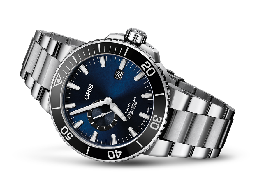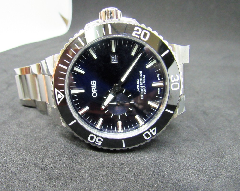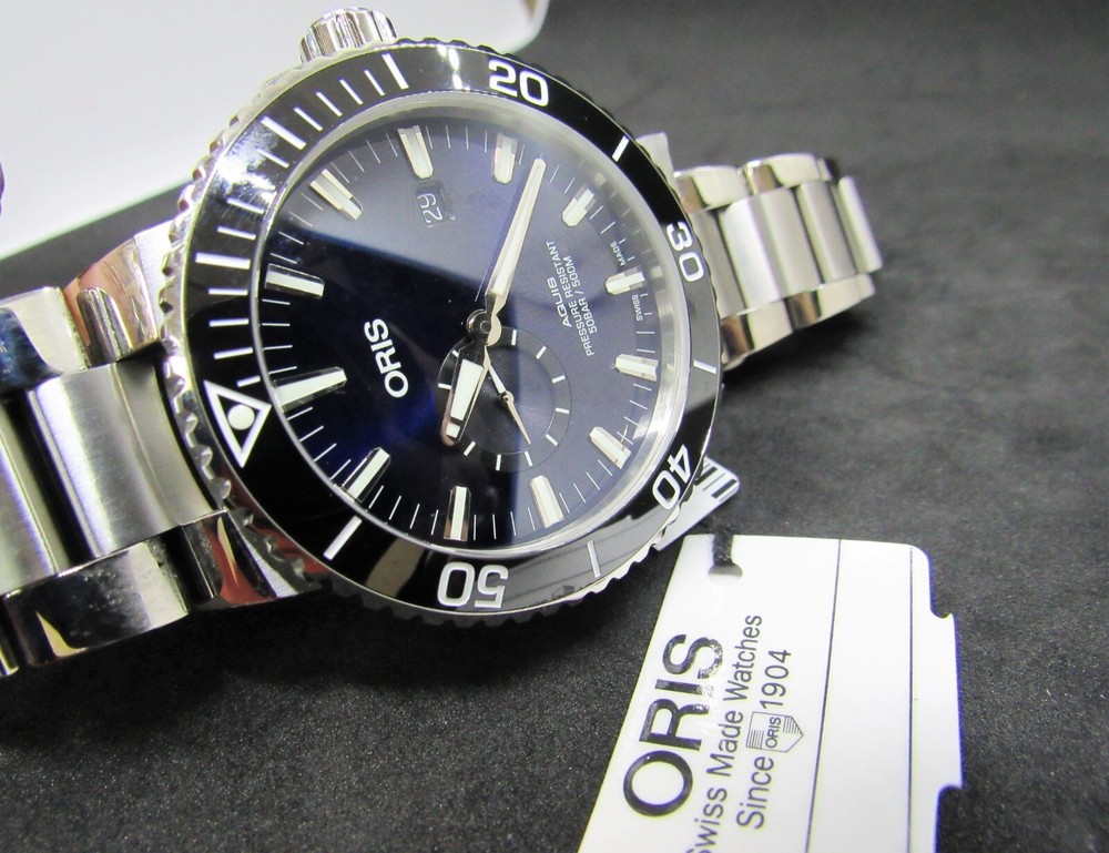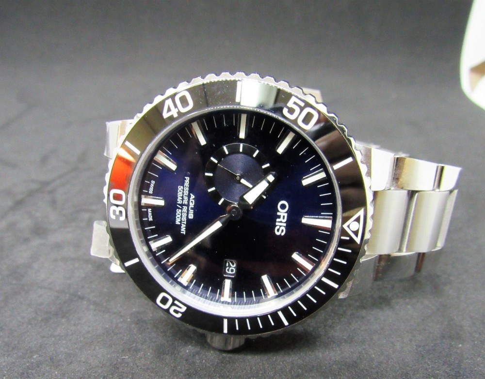 BRAND NEW!! COMES WITH BOX AND PAPERS Stainless steel case with a stainless steel bracelet. Uni-directional rotating coin edge stainless steel bezel with a black ceramic (count-up elapsed time) ring. Blue dial with luminous silver-tone alpha-style hands and index hour markers. Minute markers around the outer rim. Dial Type: Analog. Luminescent hands and markers. Date display at the 6 o'clock position. Oris calibre 733 automatic movement, based upon Sellita SW200-1, containing 26 Jewels, bitting at 28800 vph, and has a power reserve of approximately 38 hours. Scratch resistant sapphire crystal. Screw down crown. Transparent case back. Round case shape. Case size: 39.5 mm. Band width: 21 mm. Fold over clasp with a push button release. Water resistant at 300 meters / 1000 feet. Functions: date, hour, minute, second. Aquis Series. Dive watch style.