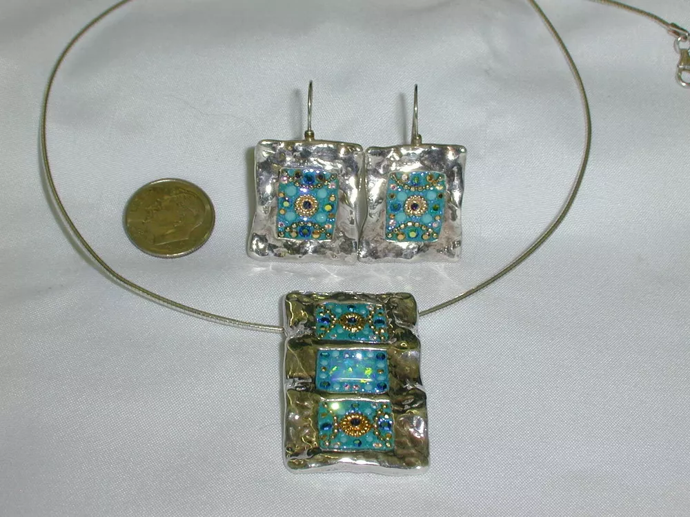 This fabulous jewelry set from OS is a must-have for any fashion-conscious individual. Crafted from high-quality 925 sterling silver, this necklace and earring set features stunning multicolor glass opals as the main stone, with sparkling CZ stones as the secondary. The set is perfect for any occasion, whether it's a night out on the town or a special event. The silver and CZ stones have a beautiful sparkle that will catch everyone's eye. This set is a great addition to any jewelry collection and is sure to impress. DESCRIPTION: Hallmarked: OS 925 Weight: 19.53 Grams Necklace: The pendant measures 1" wide by 1 1/2" tall The fine chain is 16" long Earrings: Measure 3/4" wide by 1 1/2" long with the ear wires They look Amazing on~ worn together or apart. The earrings have French wires for pireced ears. Free US domestic shipping , international shipping is available at actual first class rates. Please see my other listings for more great jewelry.