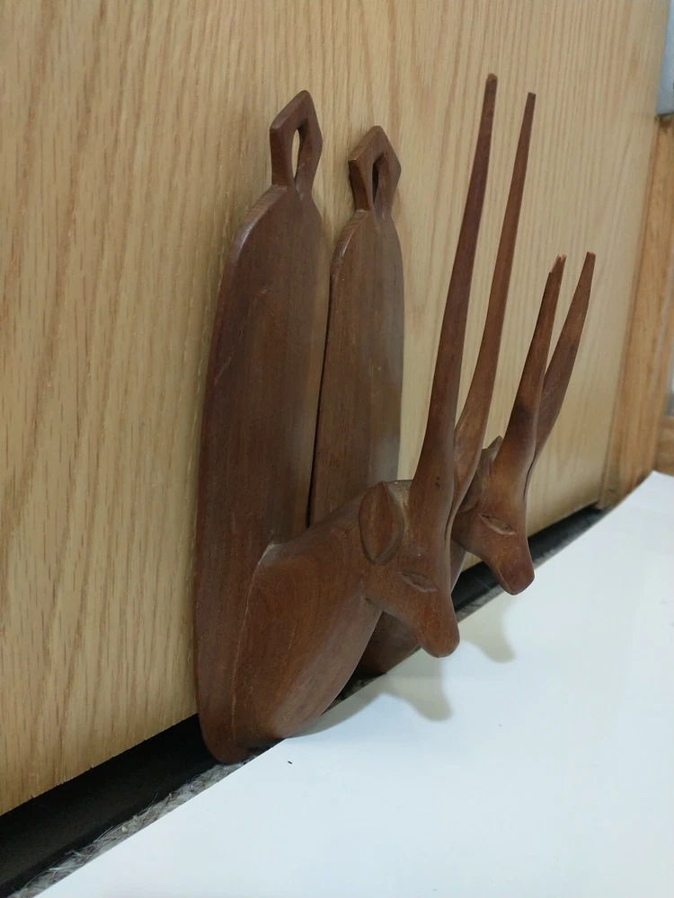 Lot of 2 wood carved hat hangers I believe they are supposed to be the Oryx Antelope The bases measure about 8.5" long and about 2" wide The tips of the antlers on one of them have broken off but the other one is in good shape Best offers welcome Will ship within two business days of receiving payment All sales are final and no returns or refunds will be issued Thanks so much for looking and have a wonderful day!
