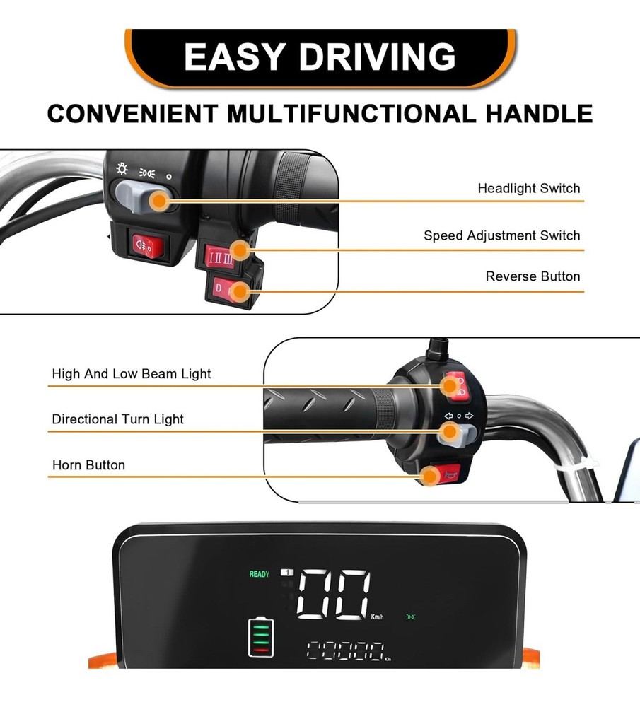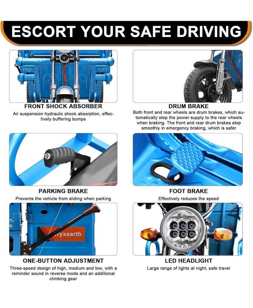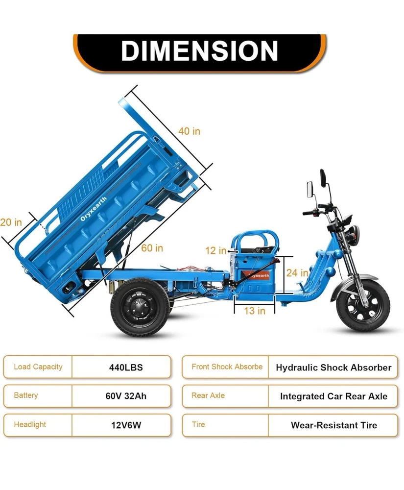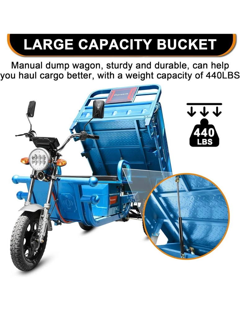 with Tipping Bucket, Motorized 3-Wheel, with Loading Car Hopper, 60V 32Ah, Utility Task Vehicle, Up to 440 LBS PRODUCT SPECIFICATION】Oryxearth electric tricycle carriage size 59in * 39.4in, 1000W electric hub motor, 60V 32Ah lead acid battery, 12V6W high brightness headlight, luxury LED meter, thickened steel plate. It can travel up to 21mph in two gears of low speed/high speed. it is your little helper at work. It adopts one-piece rear axle with long life and load capacity up to 440lbs. 【SAFE AND RELIABLE CONFIGURATION】Oryxearth electric tricycle comes equipped with a climbing device that provides strong and powerful performance at low speeds when tackling inclines or pulling heavy loads. The variable speed control knob allows for easy adjustment between three speeds, while the display conveniently shows remaining battery power, mileage, and current speed. Furthermore, the anti-skid controller ensures safe reversing downhill by maintaining a constant slow speed to prioritize personal safety. 【PERFECT DESIGN】Oryxearth electric tricycle features sturdy tires for excellent grip on any terrain. Lengthened front wheels with hydraulic shock absorbers provide a smooth ride by reducing bumps along the way. The thickened front bumper and body bars made from sturdy metal ensure durability and strength as the foundation for your transportation. 【APPLICATION SCENARIO】Oryxearth electric tricycle is more practical than ordinary electric cars to fulfill the purpose of carrying people and goods. Travel without worrying about parking space congestion, parked in a narrow space can be, only need to be fully charged to travel. Nearby supermarket shopping, short-distance transportation of goods, tidying up the yard, tidying up the land, climbing small slopes for a picnic, barbecue with children, adding fun to your life.