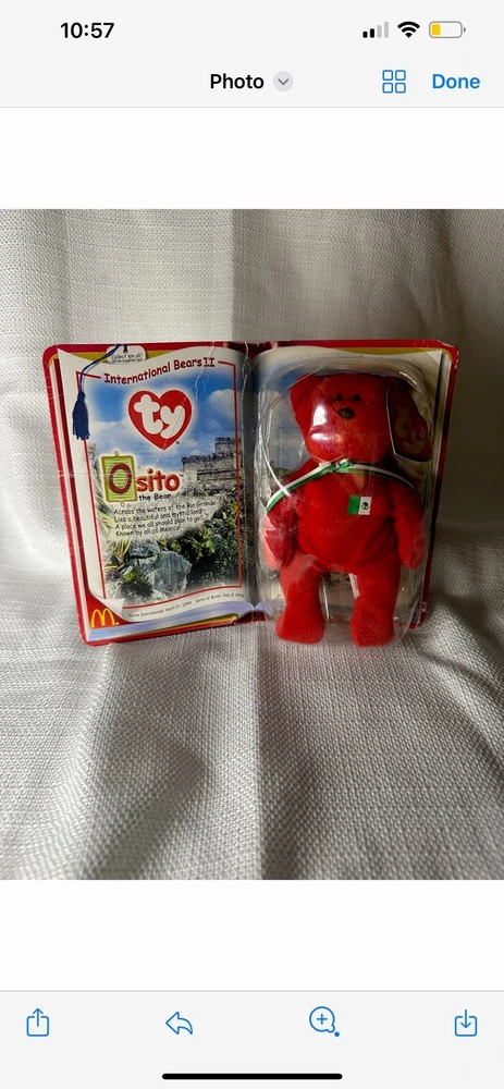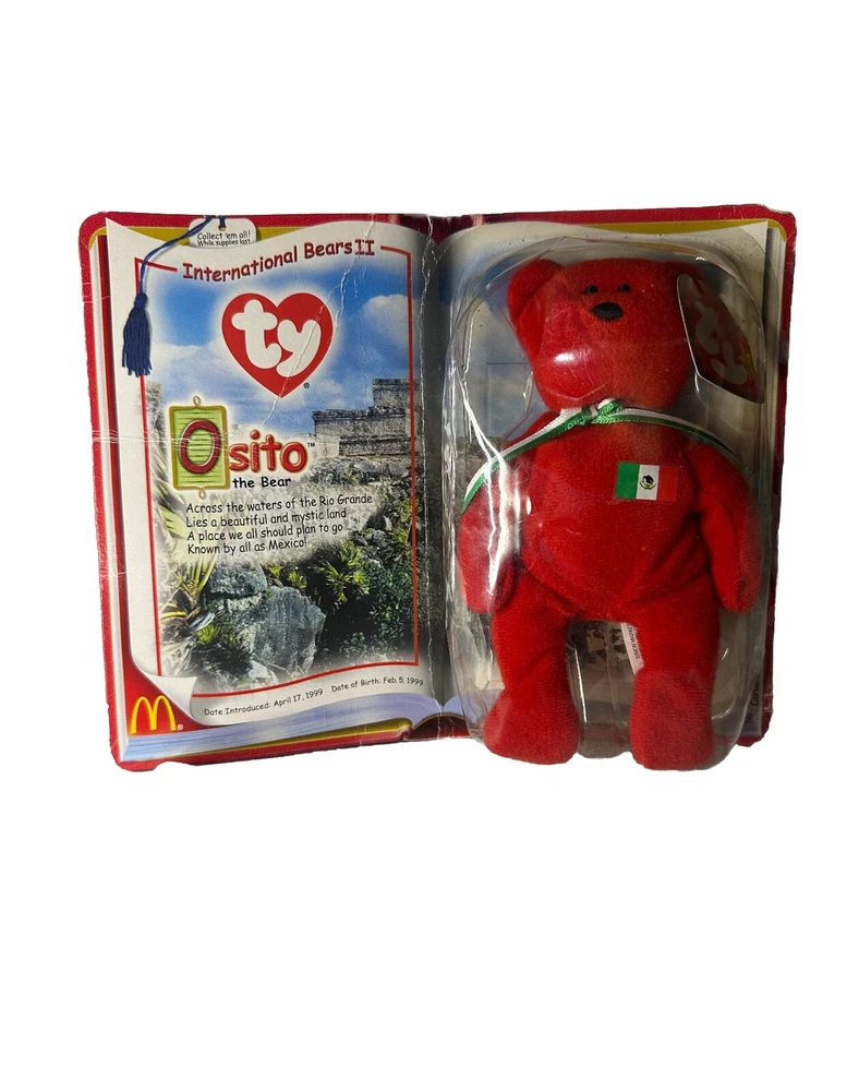 Introducing Osito the Bear, a rare find from the McDonalds TY International Bears II collection released in 1999. This adorable Beanie Baby is perfect for collectors of all ages, with a recommended age range of 1 and older. Featuring the iconic Ty brand, this bear is a must-have for any fan of the brand or the Beanie Babies-Original line. This Bear Beanie Baby is part of the Featured Refinements category and is suitable for ages 12-16 years, 8-11 years, 1-2 years, 3-4 years, and 17 years & up. Made in China, this rare Osito the Bear is a perfect addition to any collection. Don't miss out on the chance to own this unique piece of Ty history.