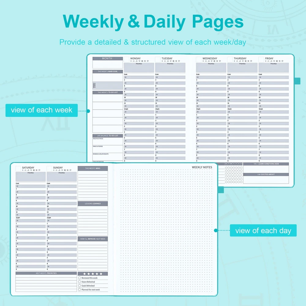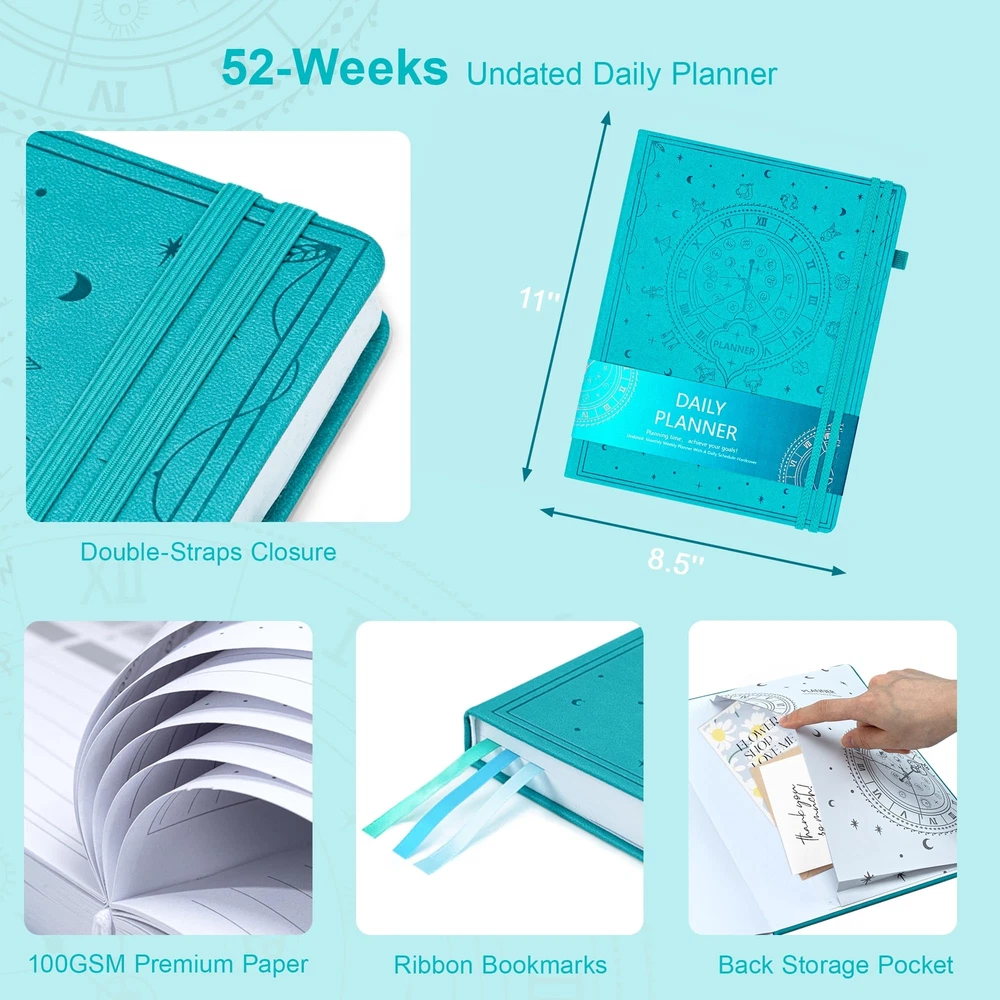 Ospelelf Undated Daily Planner 2024-2025 12 Months, 8.5 x 11 Weekly & Monthly Life Planner, Organizer Notebook & Productivity Journal. A4 Leather Hardcover with Stickers(Turquoise) Exquisite & Unique Leather Cover - This 8.5 x 11'' planner is completely handcrafted by using leather that is sof and thick. It features precise deep embossing on the cover and durable leather cord binding,which offers a soft touch exterior with a natural, distressed look that’s truly exclusive. Stay Organized & Achieve Your Goals - Learn to prioritize by using monthly and weekly priority sections to focus your energy on most initial goals. Manage your time effectively and never miss a meeting again by using the monthly calendar and weekly planning sections to schedule appointments and deadlines. Strive for continuous improvement by using the weekly and monthly reflection sections. This is the perfect productivity and time management planner for men and women! Improve Work-Life Balance, Build New Habits & Feel Happier - Become your best self by setting and achieving goals in all important areas of your life. Bring more healthy habits and positive daily rituals into your life, and stick to them by using the habit tracker section of the planner. Incorporate gratitude and affirmation techniques for a more inspired and happier everyday life. Undated, Luxurious & Premium Quaility - The planner comes undated so you can start any time of the year without wasting a page. 12 months capacity runs in bulk and are separated into weeks and days.3 colorful bookmarks to flip between weekly and monthly spreads. The hardcover is made from skin-friendly faux leather with unique artwork engraved, a convenient pen holder, elastic band, and totally 384 decorative stickers and 12 index stickers. Unique Among Others - If you are searching for a perfect planner that makes a difference, then please try Ospelelf. We are dedicated to designing and manufacturing innovative products of the highest quality. Exquisite & Unique Leather Cover - This 8.5 x 11'' planner is completely handcrafted by using leather that is sof and thick. It features precise deep embossing on the cover and durable leather cord binding,which offers a soft touch exterior with a natural, distressed look that’s truly exclusive. Stay Organized & Achieve Your Goals - Learn to prioritize by using monthly and weekly priority sections to focus your energy on most initial goals. Manage your time effectively and never miss a meeting again by using the monthly calendar and weekly planning sections to schedule appointments and deadlines. Strive for continuous improvement by using the weekly and monthly reflection sections. This is the perfect productivity and time management planner for men and women! Improve Work-Life Balance, Build New Habits & Feel Happier - Become your best self by setting and achieving goals in all important areas of your life. Bring more healthy habits and positive daily rituals into your life, and stick to them by using the habit tracker section of the planner. Incorporate gratitude and affirmation techniques for a more inspired and happier everyday life. Undated, Luxurious & Premium Quaility - The planner comes undated so you can start any time of the year without wasting a page. 12 months capacity runs in bulk and are separated into weeks and days.3 colorful bookmarks to flip between weekly and monthly spreads. The hardcover is made from skin-friendly faux leather with unique artwork engraved, a convenient pen holder, elastic band, and totally 384 decorative stickers and 12 index stickers. Unique Among Others - If you are searching for a perfect planner that makes a difference, then please try Ospelelf. We are dedicated to designing and manufacturing innovative products of the highest quality. Shipping from the USA All of our products are shipped from the USA, ensuring quick delivery to your destination. Payment We offer the following payment methods: PayPal, credit card, bank transfer, and eBay's secure payment system. Free Shipping & Free Returns Shipping within the USA is FREE. Additionally, any return is absolutely free for you. Risk-Free Purchase You have the option to return an item within 30 days without any justification. We cover the return shipping costs! Fast Shipping We ship immediately upon receipt of payment. Generally, the package is delivered within 2-3 days in the USA. If it takes longer, we will contact you. Quality and Costs Made in Europe, USA, China No customs fees or additional charges Total satisfaction guarantee Invoice with declared VAT available upon request in .pdf format Feedback Your feedback is very important to us. After you pay for your purchase, you will automatically receive positive feedback from us.