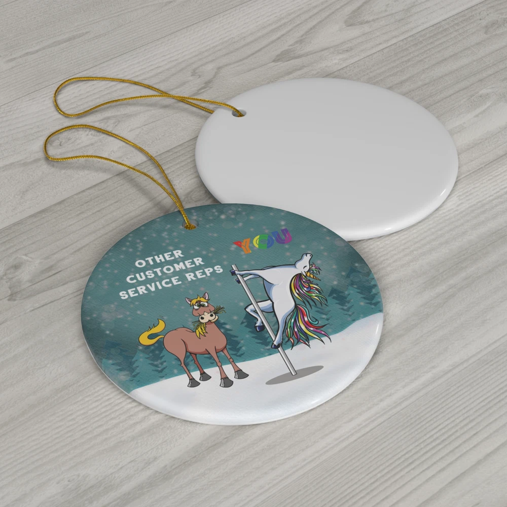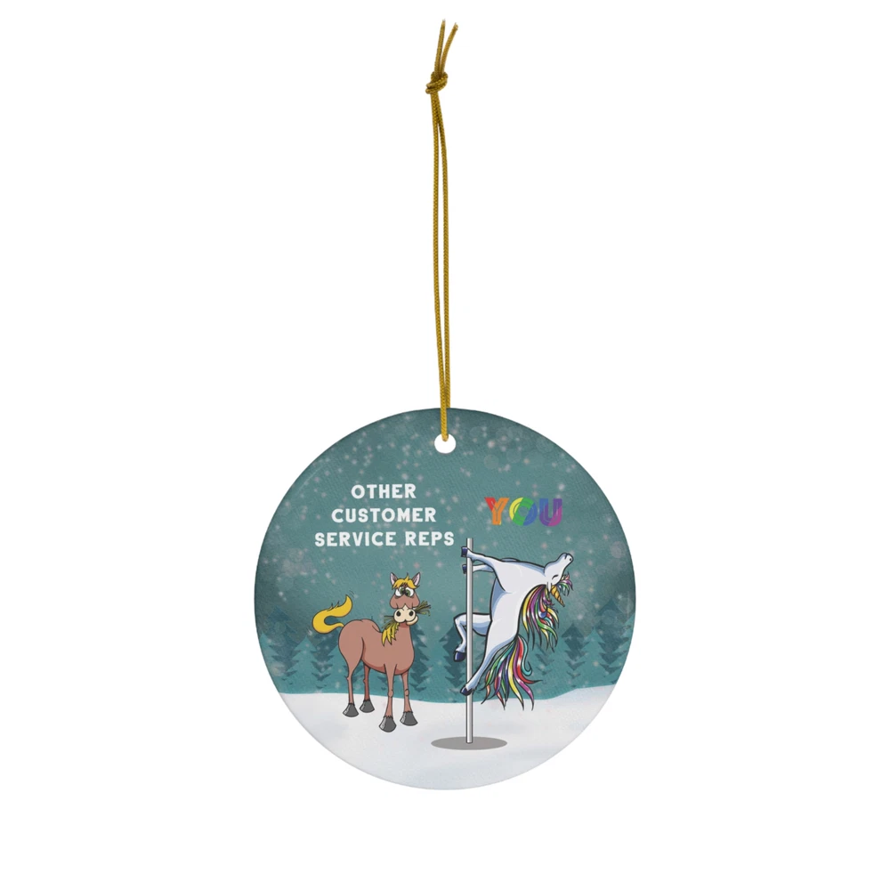 This listing is for a Customer Service Rep Unicorn Christmas tree ornament. DETAILS: ➤ The ornament is white ceramic and measures 3" x 2.85". It includes a gold ribbon string for hanging. ➤ A personalized ornament is a perfect keepsake for years to come! ➤ The perfect gift to put a smile on a family member or friend's face or to add some memories to your own tree! ➤ Find more Christmas designs and products in my Christmas section here: https://www.ebay.com/str/creatorscove/Christmas/_i.html?store_cat=4063744819 ➤ Printed, Packaged and Shipped From The USA. Support a local small business! ⏤⏤⏤⏤⏤⏤⏤⏤⏤⏤⏤⏤⏤⏤⏤ ➢ Since everything in my store is custom made, some orders ship out quickly and some take a bit longer to make. I’ll keep you updated every step of the way and also get you a tracking # as soon as your custom order is shipped. ➢ The shipping address listed on your order is where it will be shipped. Please make sure this information is correct. ➢ IMPORTANT: If you are not completely satisfied please give us an opportunity to make it right before you leave negative feedback. Contact me and I will do everything in my power to correct the issue.