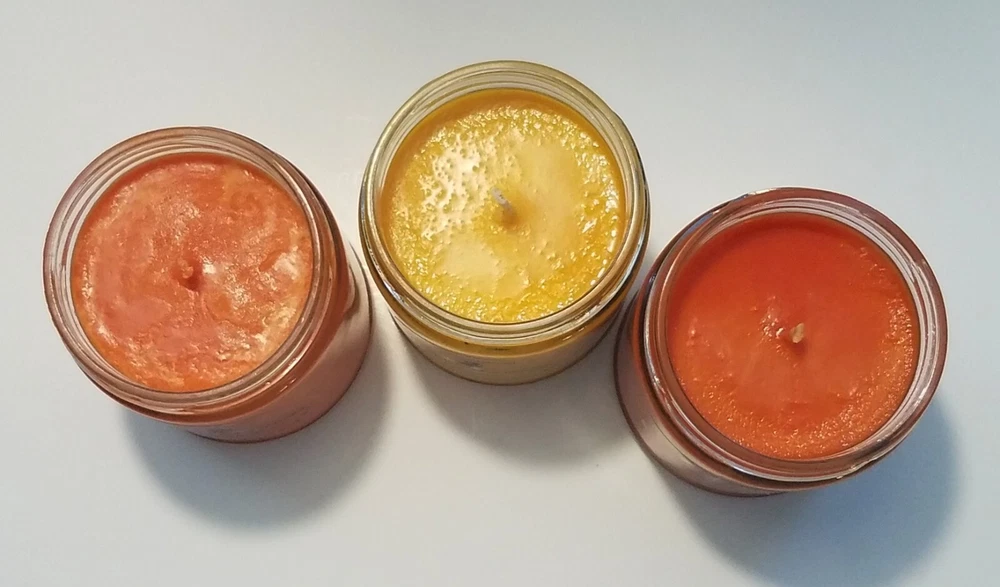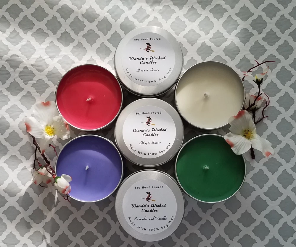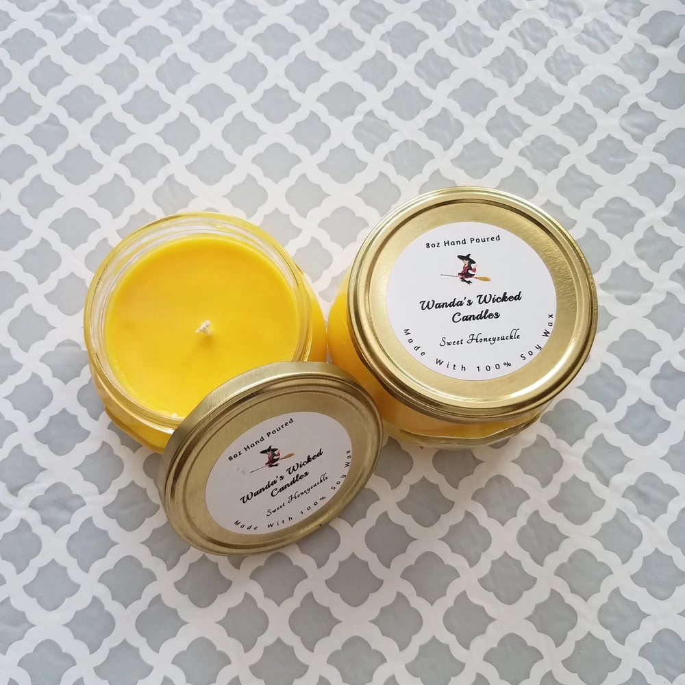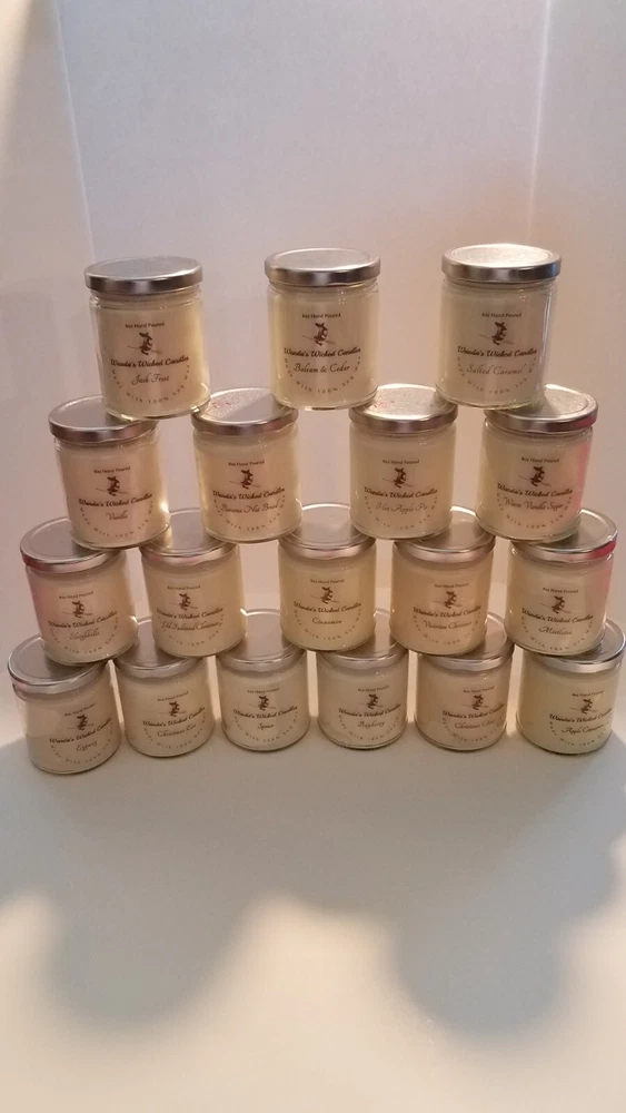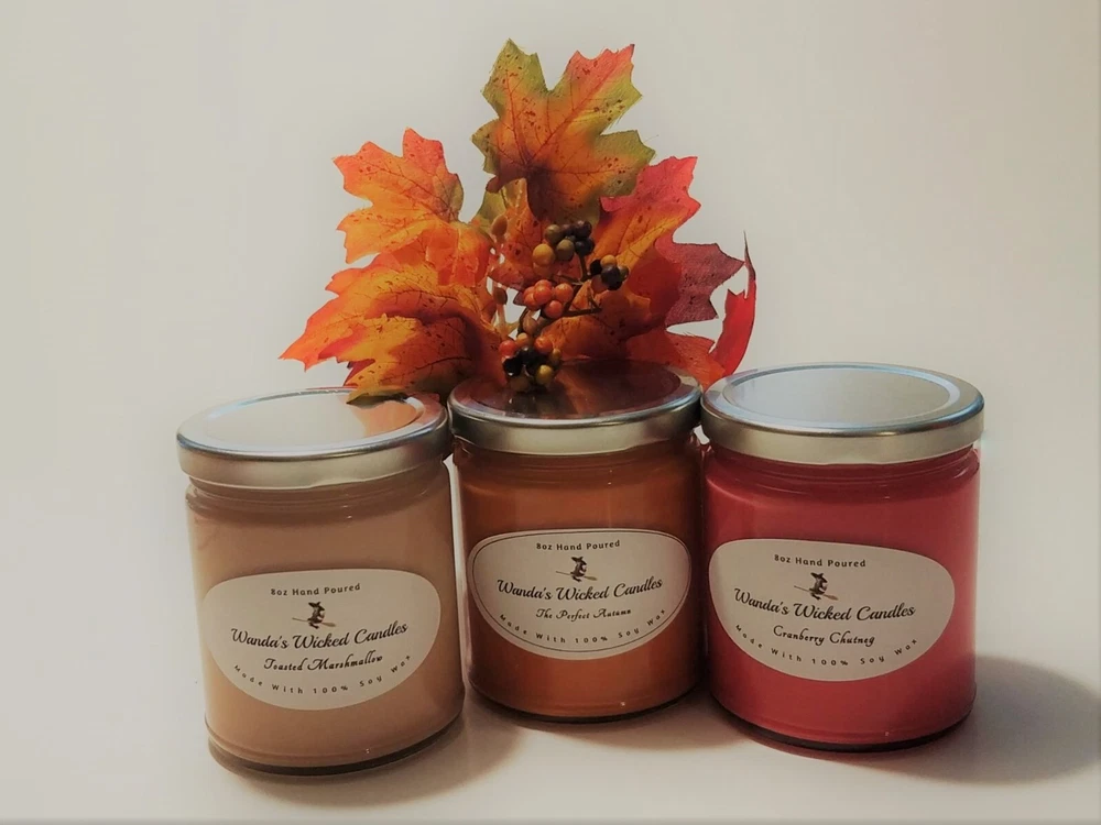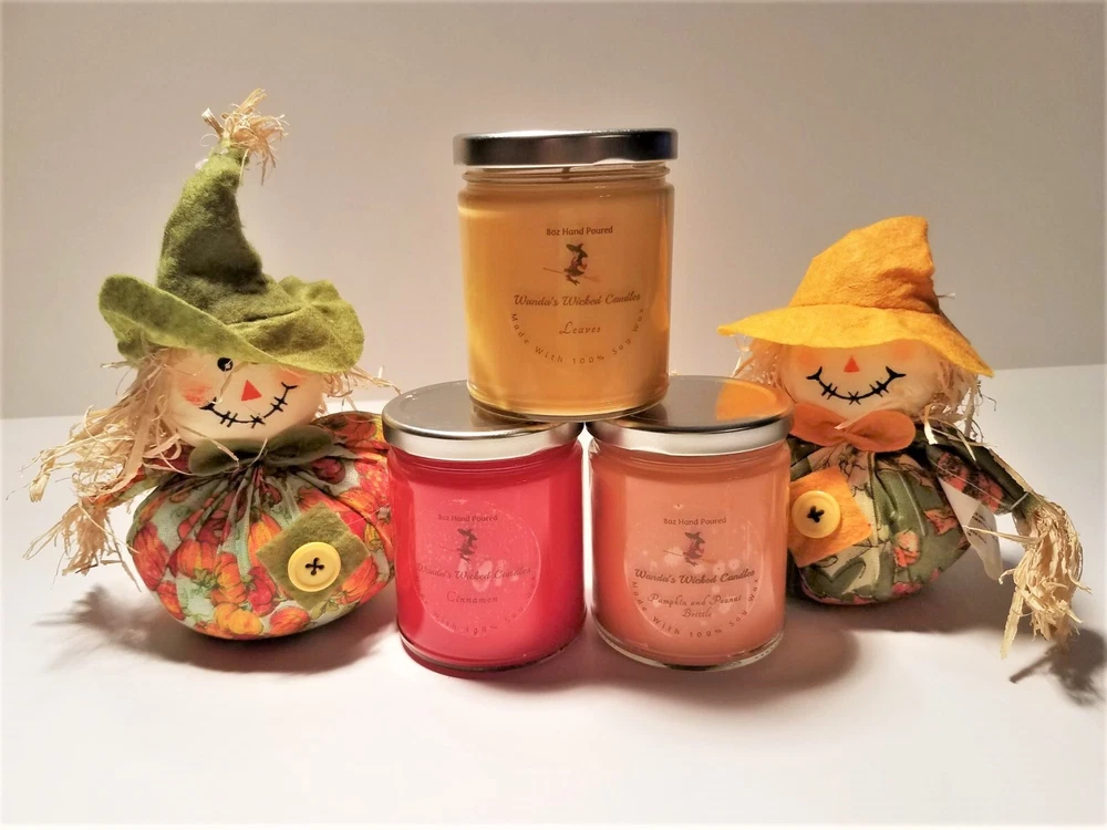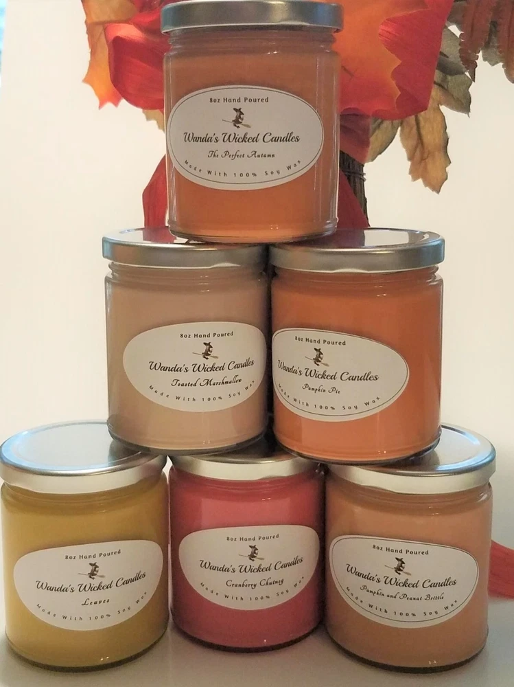 New Fall scents are here!! Sale!! Come shop now. We have a wide variety of Fall scents to choose from. We Make our candles in small batches and do our best to pay attention to even the smallest of details. We use 100% all natural soy wax, all cotton wicks and fresh scents in our candles. They are Eco friendly and made in the USA. They burn cleaner and longer than mass produced candles. They burn up to 40 hours. HIGHLY SCENTED!! Disclaimer Color may vary depending on viewing screen & lighting conditions in your environment. Candles are hand poured in the USA. Frosting and different variations in texture may occur and are common characteristics of soy wax. (This does NOT affect the scent throw). Please advise me if you are scent sensitive so we may recommend a scent if needed. Burn times might be less or more depending on different uncontrollable environmental conditions burn time is not guaranteed Always burn candle in sight, away from children, & other hazards. See warning label on bottom of candle Returns of un-burned, unopened, not damaged candles accepted only.