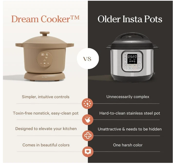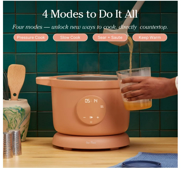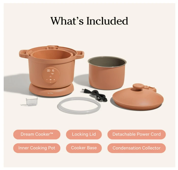 Our Place Dream Cooker Limited edition Spice color **FREE SHIPPING** Within USA ONLY. Dream Cooker | 6-quart Multicooker | 4 Versatile Modes | Pressure Cook, Slow Cook, Sear & Saute, Keep Warm | Hands-Free Steam Release | Tailored Control Panel | Spice About this item FAST & VERSATILE COOKING: The Dream Cooker brings your culinary fantasies to life with four easy modes: Pressure Cook, Slow Cook, Sear and Saute, and Keep Warm. With pressure cooking mode, you can cook 80% faster than traditional methods, making dinnertime prep quick, easy, and convenient. TOXIN-FREE, EASY TO CLEAN: The 6-quart inner pot has a toxin-free nonstick coating for simpler cooking and cleaning. With the Dream Cooker, never worry about soaking and scrubbing again. HANDS-FREE CONVENIENCE: Experience hands-free steam release and automatic keep warm mode, plus 9 advanced safety features for worry-free cooking. TAILORED CONTROL PANEL: Say goodbye to confusing, cluttered presets. Set the time, temperature, and mode on the easy-to-use control panel for cooking pretty much anything you can imagine. STYLISH COUNTERTOP AESTHETIC: The first multicooker designed to live on your countertop, the Dream Cooker adds both function and style to your kitchen decor.
