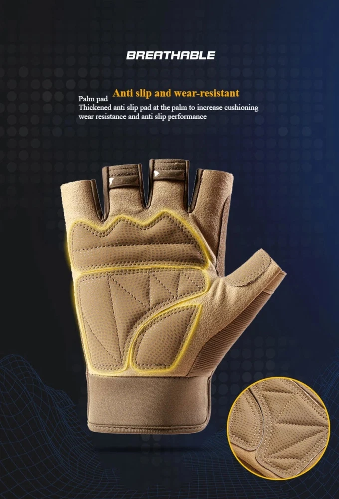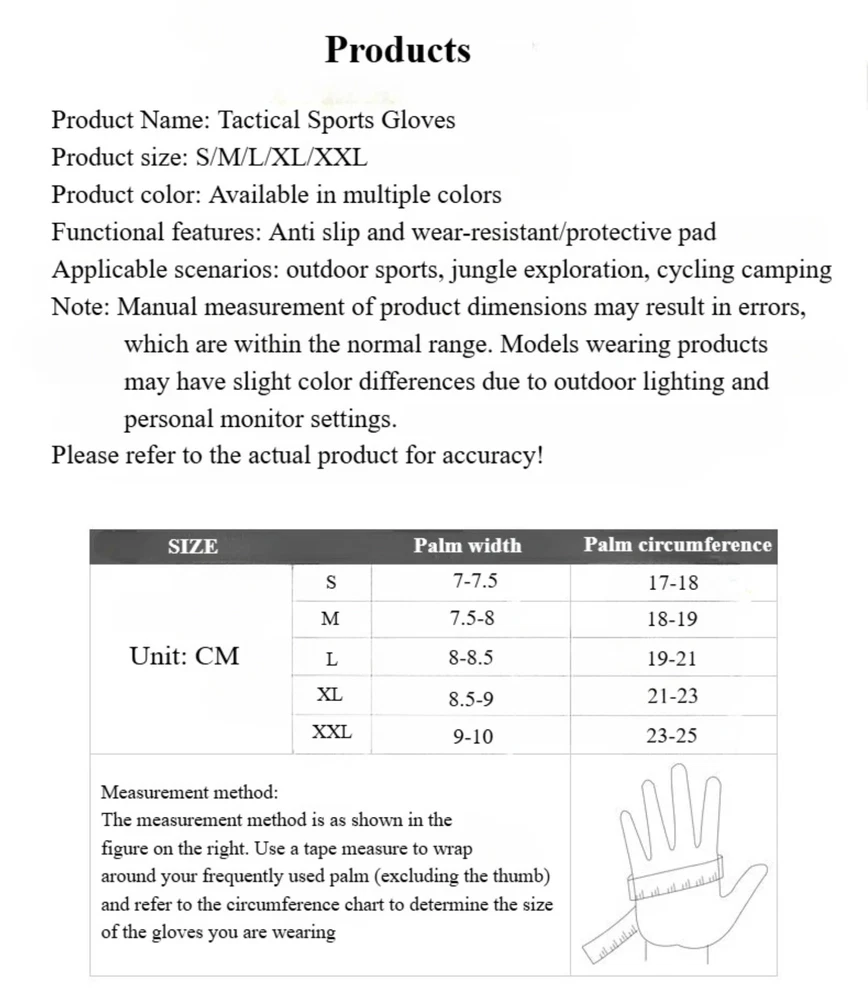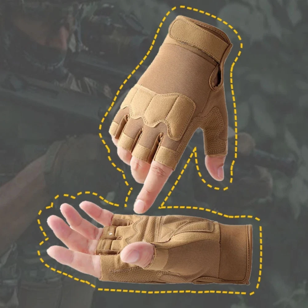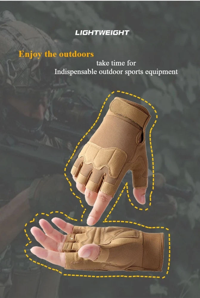 eBay Product Listing Outdoor Army Military Tactical Motorcycle Hunt Hard Knuckle Half Finger Gloves Product Description Experience the perfect combination of durability and comfort with these Tactical Half Finger Gloves. Designed for versatile use in cycling, camping, fishing, motorcycle riding, and outdoor sports. Specifications Material: Microfiber, Nylon Sport Type : Cycling Key Features High-Quality Material : Made with durable microfiber fabric and reinforced palm for enhanced grip and durability. Anti-Slip & Breathable : Provides excellent ventilation and secure grip for extended wear. Versatile Use : Ideal for cycling, hunting, driving, work, and tactical activities. Protective Design : Rubber knuckle padding for added protection during rugged activities. Notes Manual measuring, please allow 1cm error, thank you. Due to the difference between different monitors, the picture may not reflect the actual color of the item. We guarantee the style is the same as shown in the picture. The middle finger length is 3cm, error range: + / - 0.3 cm. Package Includes Selected Variation Explore More from Our Store Visit Store