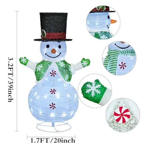 30 Days Return Policy Fast Delivery Trusted seller Outdoor Christmas Decorations Snowman, 40inch Folding Christmas Mesh Fabric Cloth Snowman, Lighted Outdoor Snowman for Xmas Indoor/Outside Yard Holiday Party Decoration Product Description Outdoor Christmas Decorations - This handcrafted fabric snowflake snowman is more realistic and cuter than the inflatable snowman, and comes with metal floor pegs to prevent the snowman from being blown over by the wind. Unfolded size: high 100cm/39 inches/3.2FT, storage size: 13*13*3.5 inches. Easy to Install and Store - christmas snowman no tools and professional skills required, very easy to install and disassemble, it only takes a few minutes. it can be displayed outdoors in nice weather (please use ground stakes). the snowman can be folded for storage without taking up space when not in use. Designed fo Christmas - Our Christmas snowman is specially designed for Christmas, the snowman shape complements the Christmas theme, creating a satisfying festive atmosp in your home. When your relatives and friends visit, they will be impressed by the beautiful light up snowman outdoor. Plug-in socket - 10FT super long extension cord . Compared with the battery style, it is durable, and no need to worry about the abnormal use by run out of the electricity , and the lighting effect will be brighter. Perfect Outdoor Christmas Decorations - Perfect for Christmas, whether outdoor or indoor or yard decoration, add an impressive glowing theme to your Christmas. Also suitable for Halloween, parties, stage performances and wedding decorations, etc. Shipping Returns Payment Shipping Shipping is FREE to all addresses other than APO/PO boxes in the lower 48 states. All our stock ships from US-based warehouses. Shipped via USPS or UPS (depending on location and package weight) Unless stated otherwise, all orders will ship within 24-72 hours of your payment being processed. Check our feedback to see the great reviews of FAST shipping we offer. Returns As our valued customer, we will do our best to make sure the product you receive arrives to you on time and as expected. If you are not satisfied with your purchase, please contact us within 30 days of receiving your order to process a return. Payment We currently accept payment via eBay managed payments only. Once payment is cleared, we will dispatch your shipment within 1-3 business days. Please refer to the "Shipping" tab for more information regarding shipping speed to your destination.
